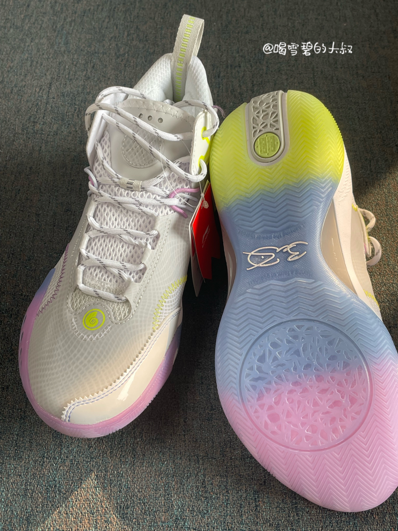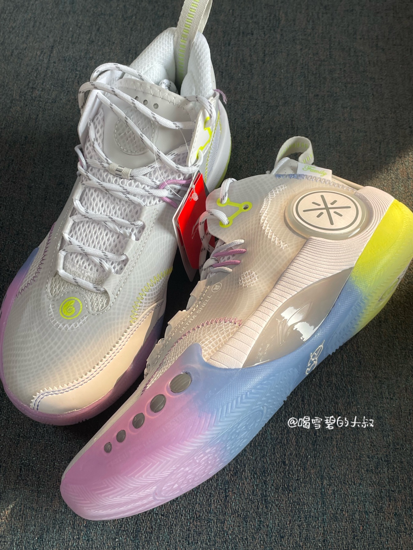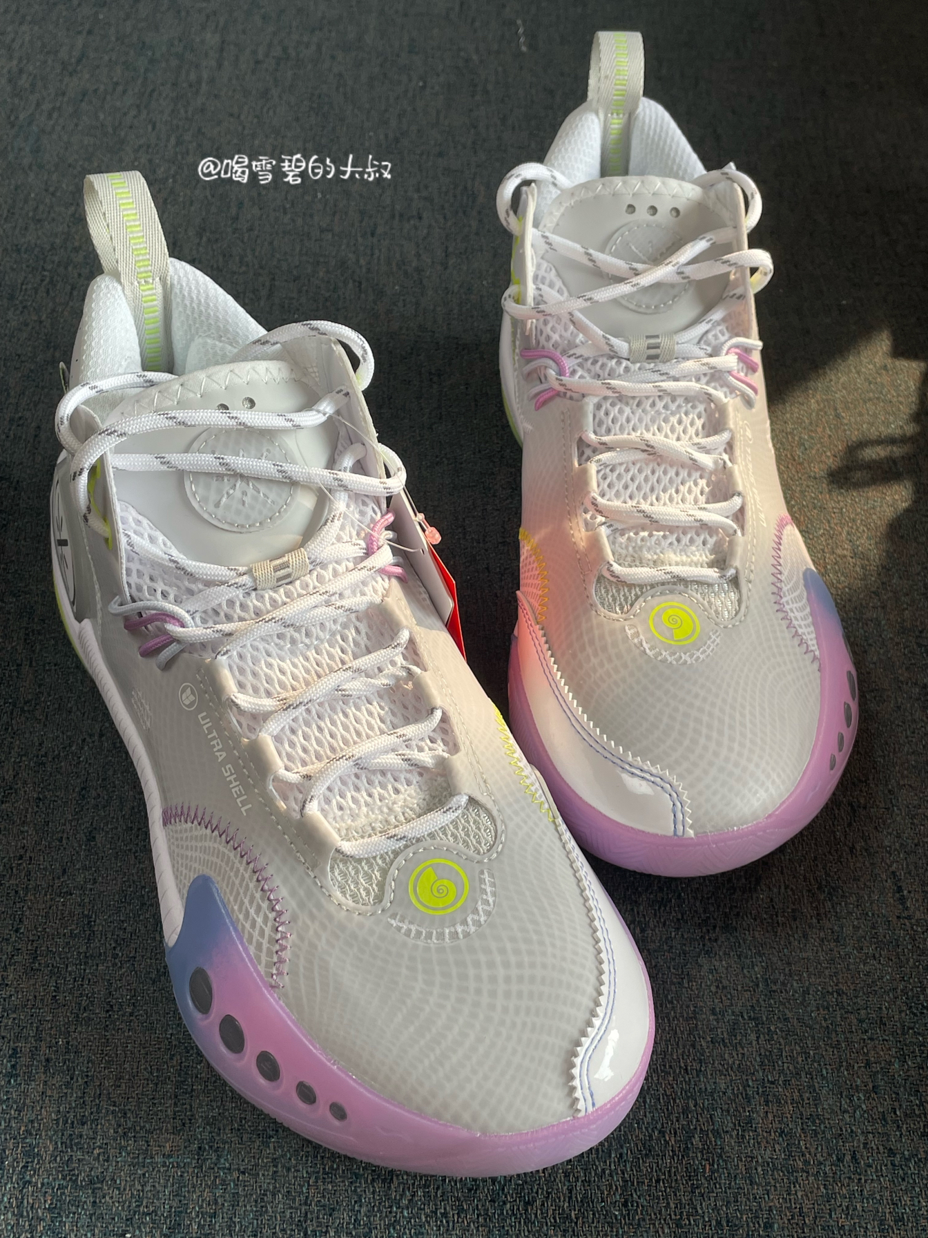 👟:LiNing李宁幻影减震回弹实战篮球鞋南极灰 鞋子外观配色也是相当好看,高级灰的鞋面,鞋底采用了水晶大底设计,由粉色、蓝色、黄色三种颜色组合而成,看起来很是清新优雅! 有一说一鞋子各个方面性能都很不错,打实战可以说轻轻松松,包裹性、防侧翻等各方面绝对的可以,最主要的是鞋子日常穿搭也可以,很是百搭!