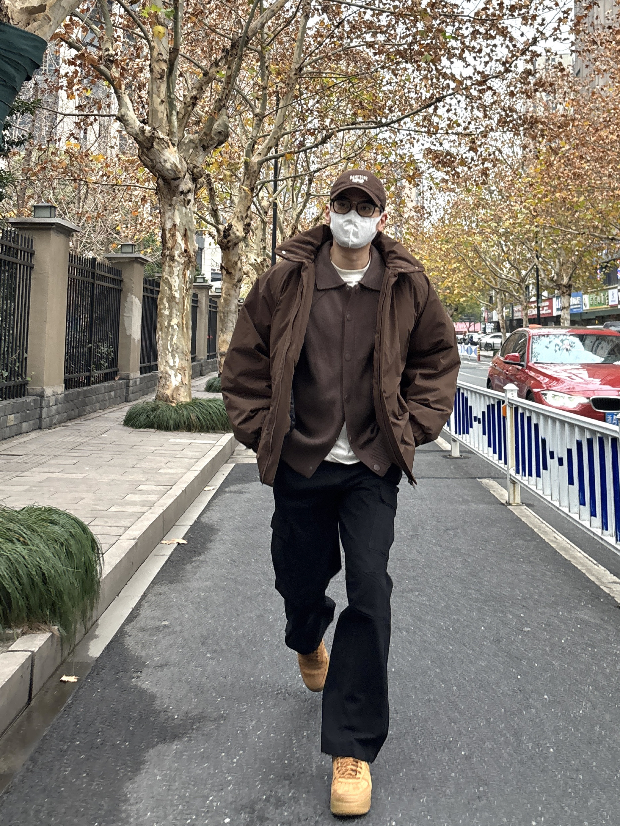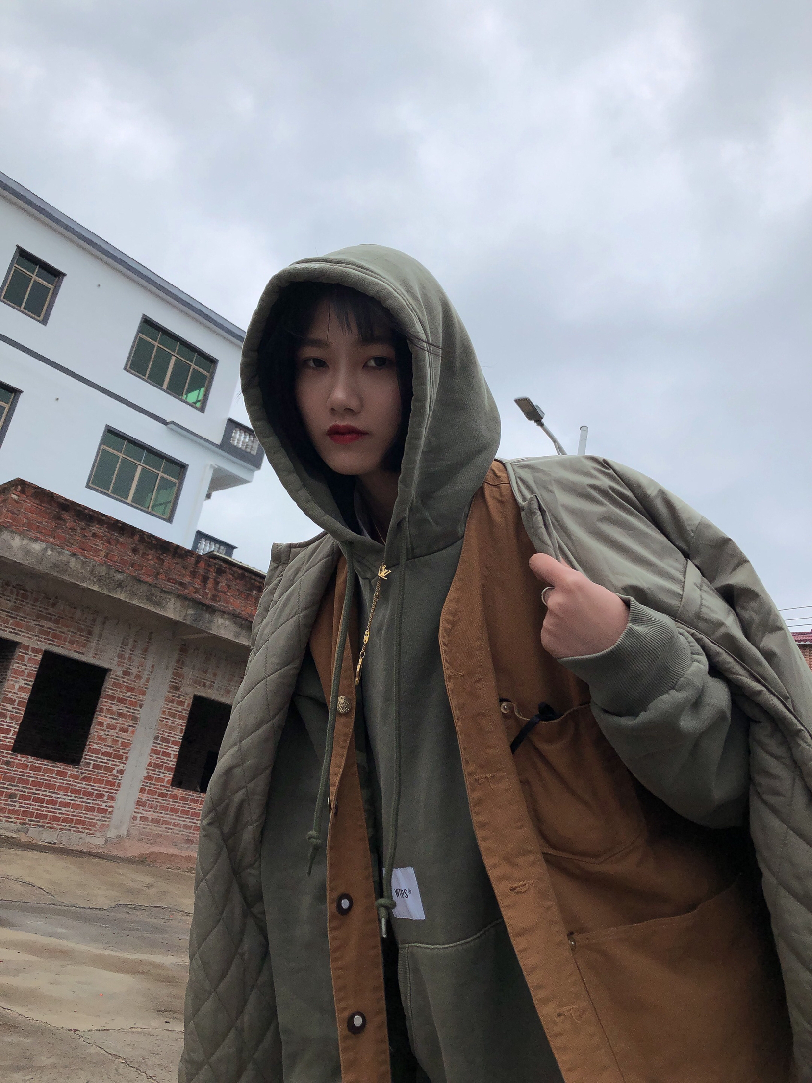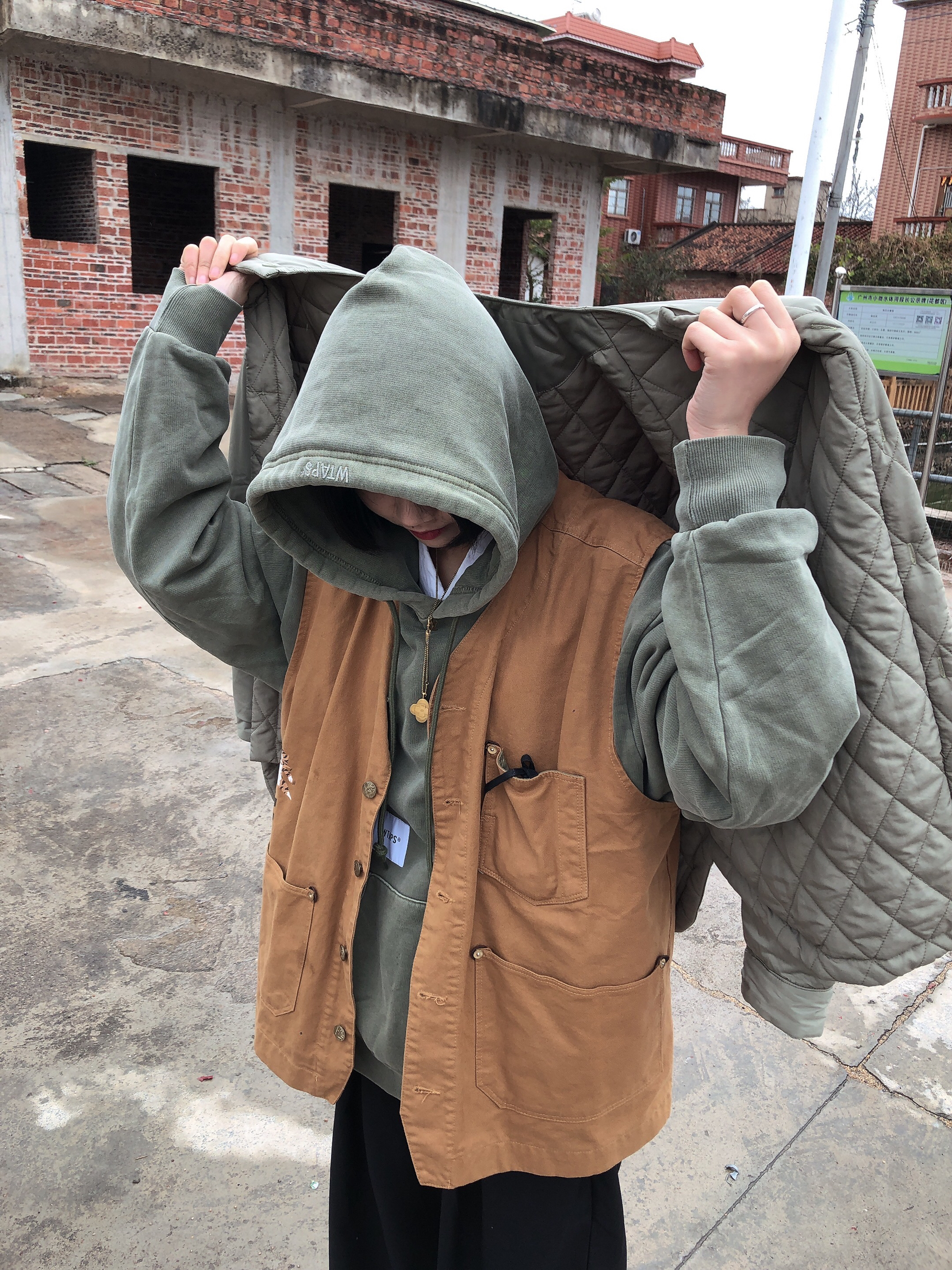 以纯色搭配为主要,暗色系为主打! 棕色马甲作为亮点突出,军绿色卫衣和外套颜色呼应,黑色纯色西装裤搭配白色鞋子呼应! 外套可双面穿搭,一面亮面防水层,一面菱格独特搭配! 🧥:哭喊中心 👖:LUSHISI 🦺:bape 卫衣:Wtaps
