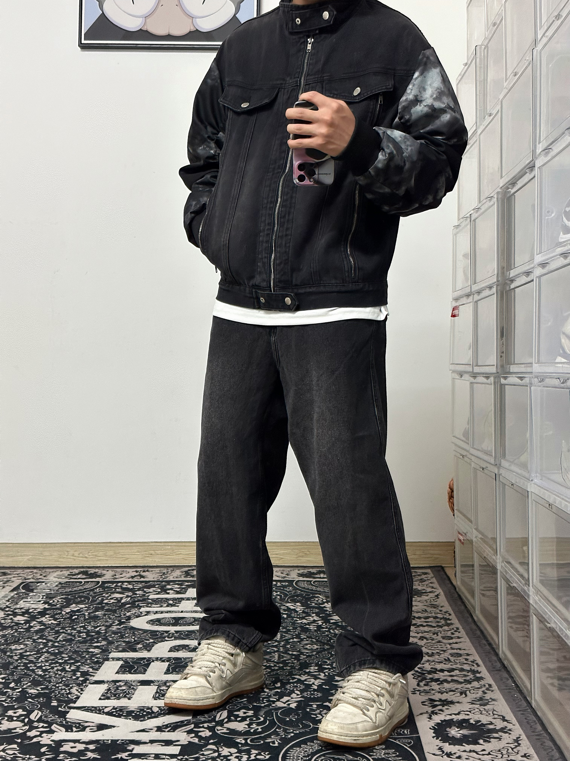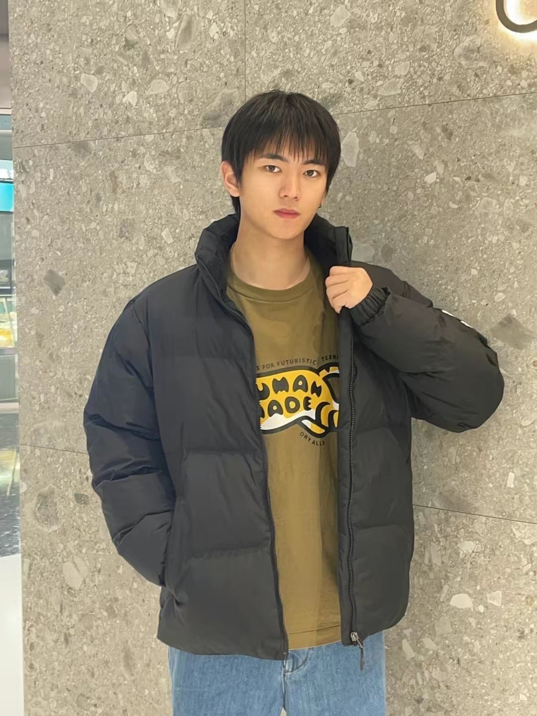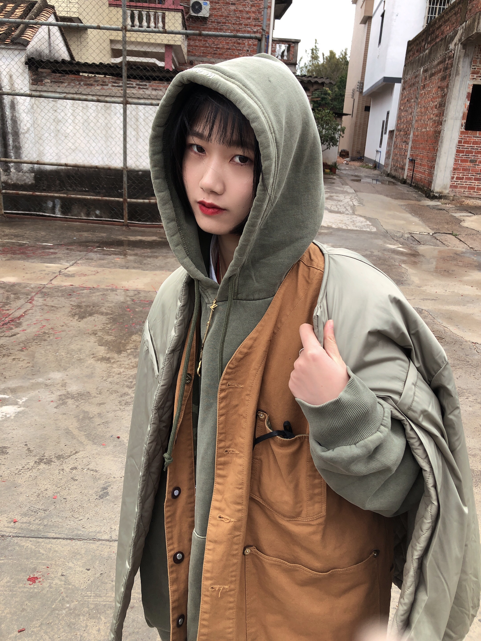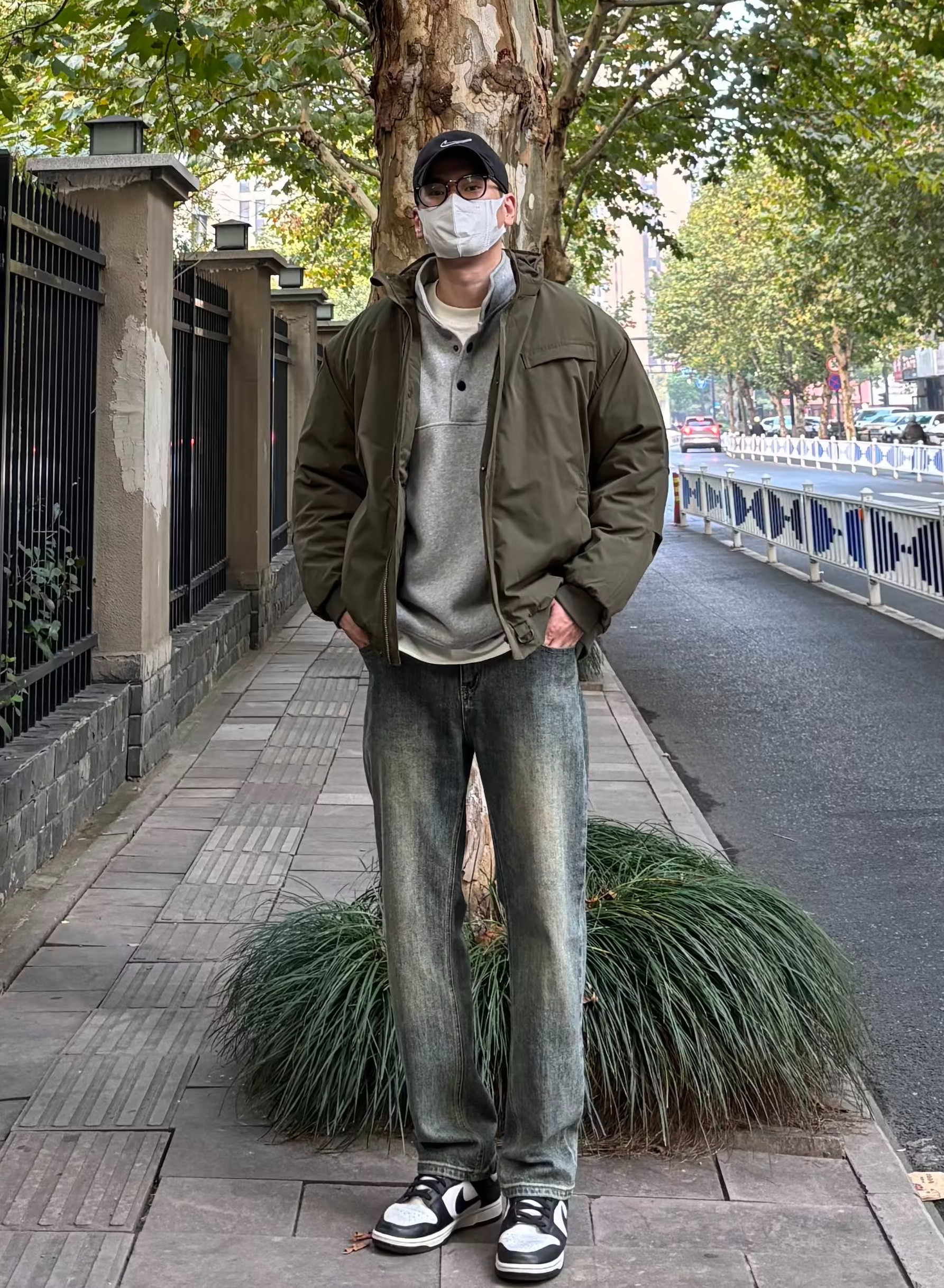以纯色搭配为主要,暗色系为主打! 棕色马甲作为亮点突出,军绿色卫衣和外套颜色呼应,黑色纯色西装裤搭配白色鞋子呼应! 外套可双面穿搭,一面亮面防水层,一面菱格独特搭配! 🧥:哭喊中心 👖:LUSHISI 🦺:bape 卫衣:Wtaps