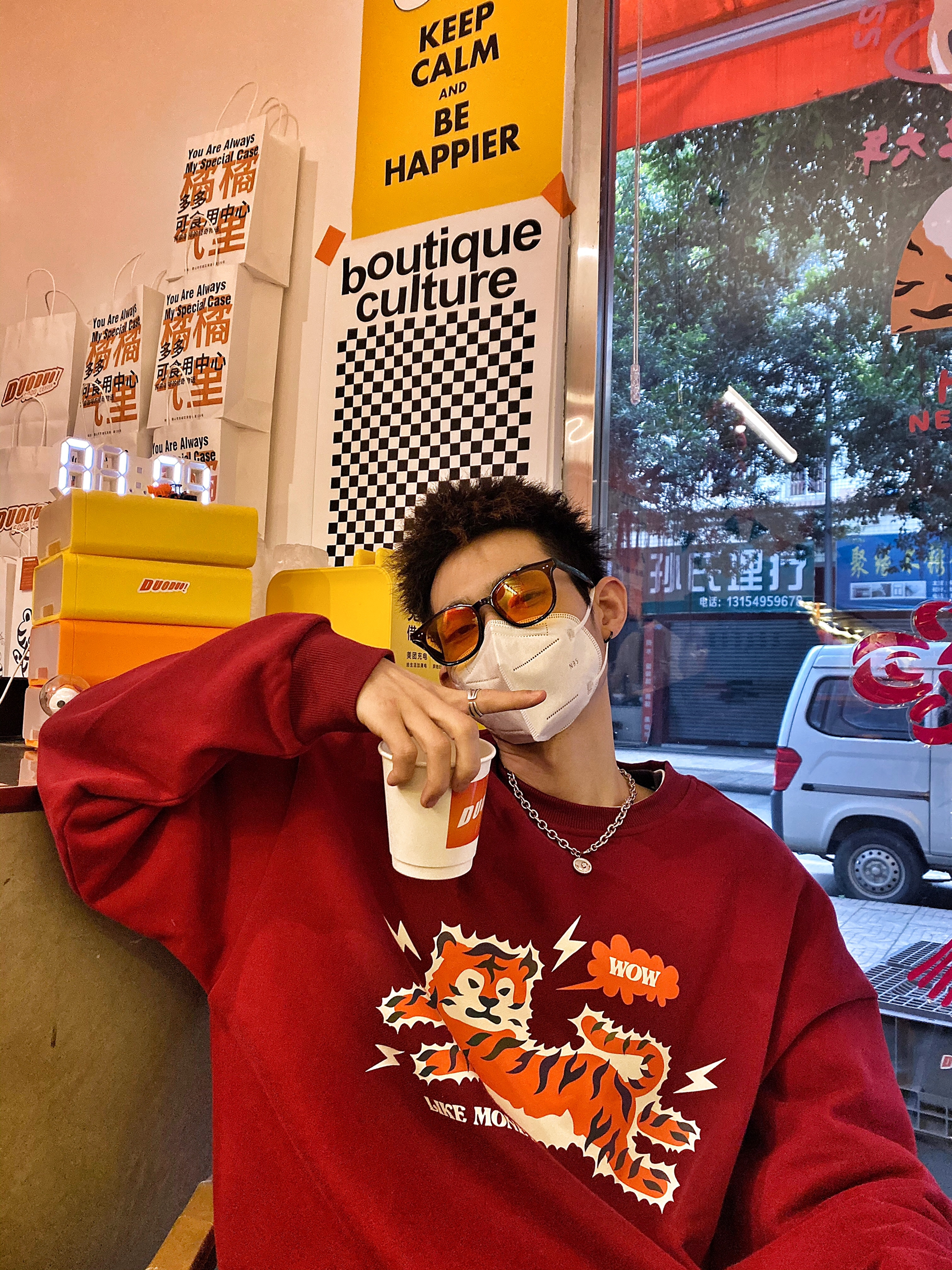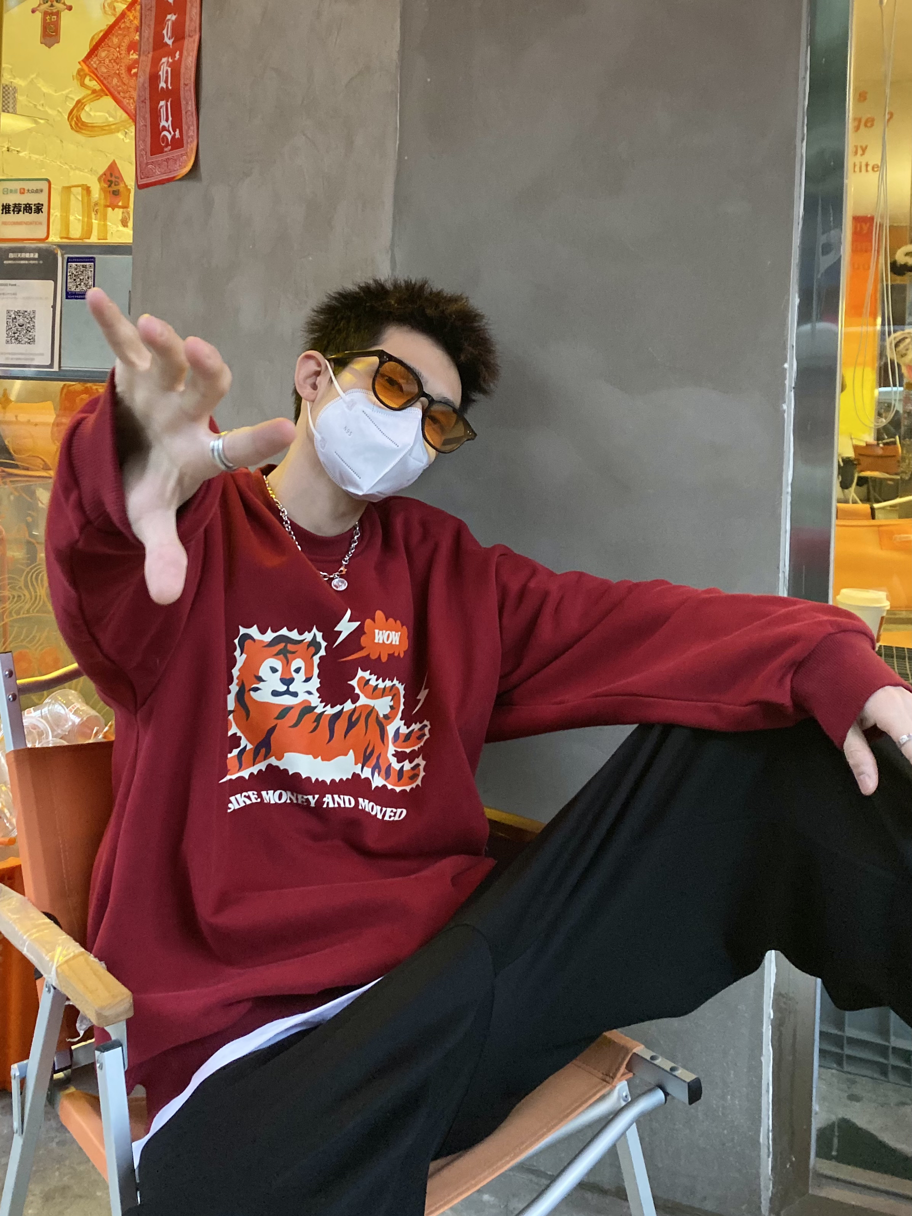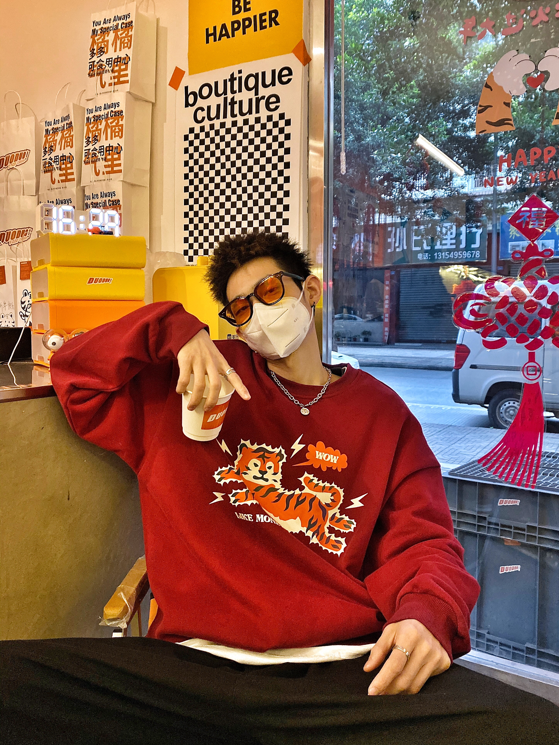 👾179cm|55kg 👔pollux北河三 👟af1经典纯白色 🐯过年那必须要来一套红色套装来搭配才更醒目哟~圆领反光印花卫衣,卡通老虎的印花,并且有超帅反光效果。 🆒再来一条垂感爆棚的直筒卫裤,潮男新春就要红红火火才行哟~