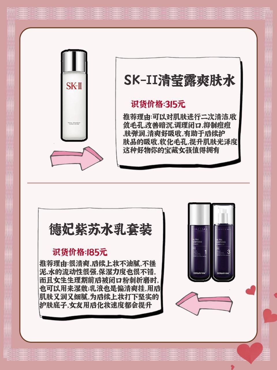 用二三百元竟然能买到优质大牌情人节礼物!不吹不撒谎,还都很好用哦,女友收到就夸你! 💝SK-II 嫩肤清莹露爽肤水 识货价格:315元 可以对肌肤进行二次清洁、收敛毛孔、改善暗沉、调理闭口、抑制痘痘、嫩肤弹润,清爽好吸收,有助于后续护肤品的吸收,软化毛孔,提升肌肤光泽度,这种好物你的宝藏女孩值得拥有! 💝德妃 紫苏水乳舒缓补水保湿平衡控油护肤套装 识货价格:185元 很清爽,后续上妆不油腻,不...