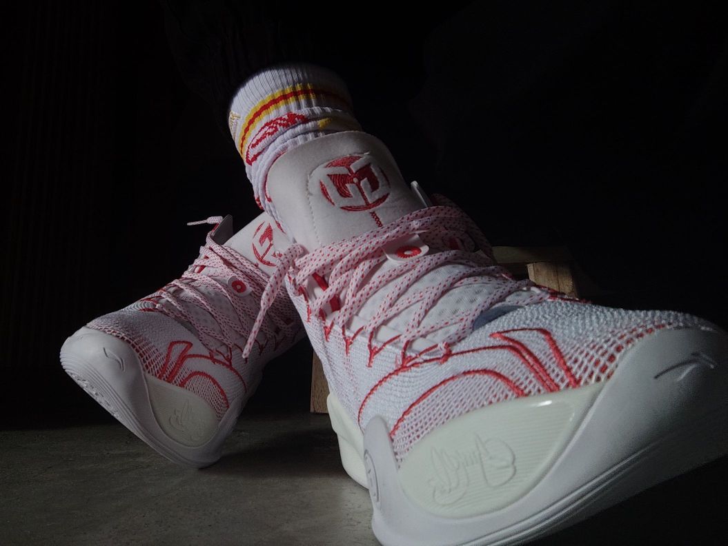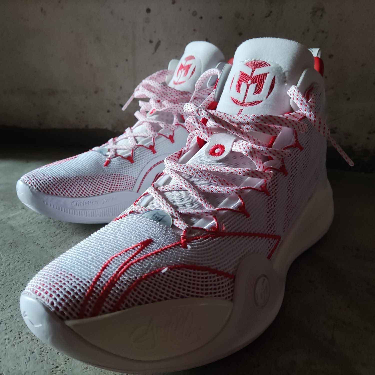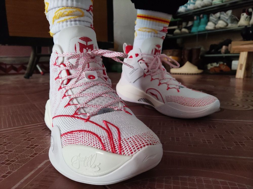 👟球鞋名称:CJ1 🔍设计亮点:整体以白红为主色调,看起来跟驭帅13䨻有点像 ⛹️实战感受(缓震/包裹/抓地力):缓震软弹,有一种莫名的爆发感,促使我想去跳;包裹性,一个字,绝!!!鞋脚一体性也是绝!!!;抓地力的话,就有点美中不足了,不沾到灰还挺稳的,沾到灰之后就滑,特滑。 📃总结评价:帅帅帅帅帅帅帅帅帅,第二次在李宁这里买到心仪的球鞋(第一双是反伍1),真的,CJ1帅到我流口水hhhhh...