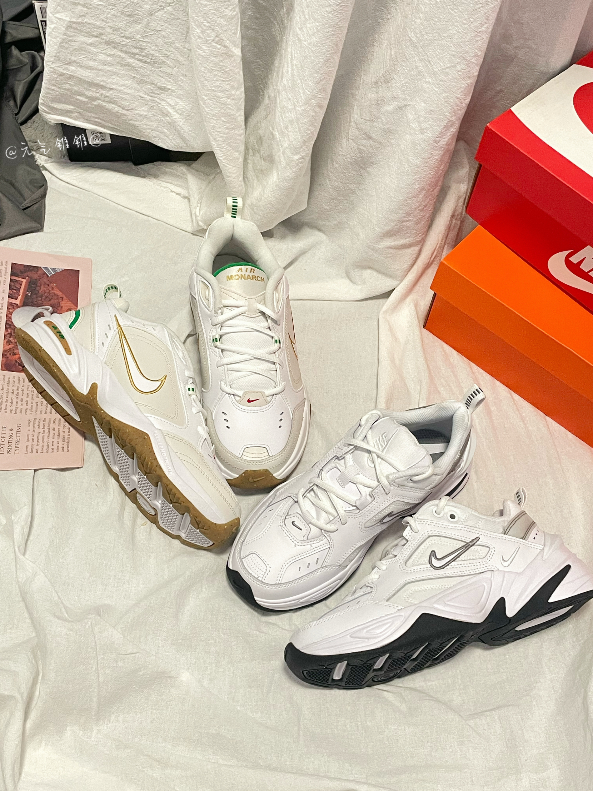 1⃣️Nike M2K Tekno 女款 白 跑步鞋 👟M2K的热度一直都很高,受到很多小伙伴喜欢,颜值超高有带有增高效果,百搭又好穿,很难不爱 鞋子整体是白色为主,搭配黑色和银色点缀,层次感十足,后跟鞋提方便脱穿,鞋身部分带有刺绣设计 白色中底黑色外底,整体都是干净清爽配色,各种风格随意搭配,重点增高效果非常不错,真是吹爆鞋型和颜值了 2⃣️Nike Air Monarch 4 米白 适合...