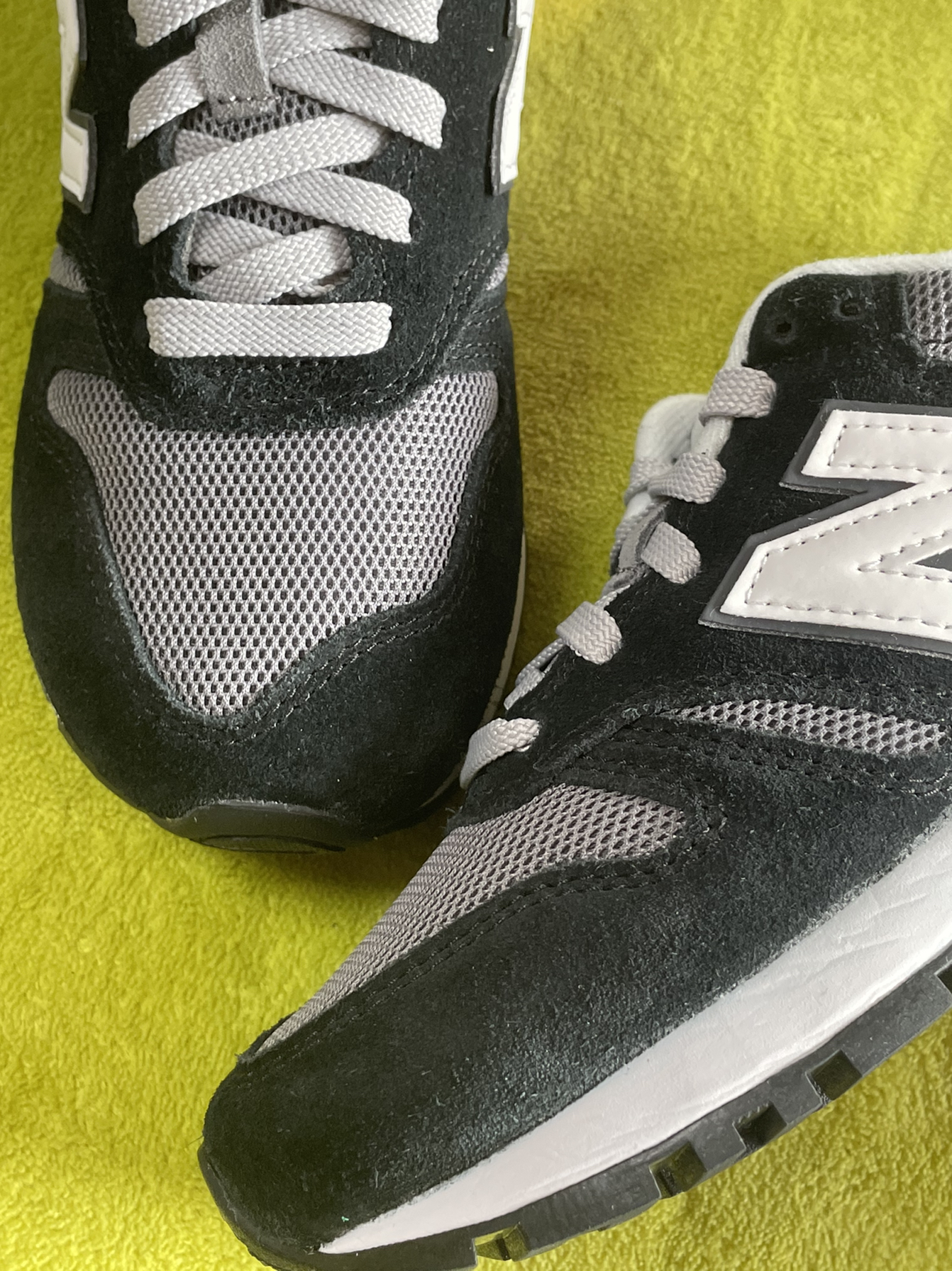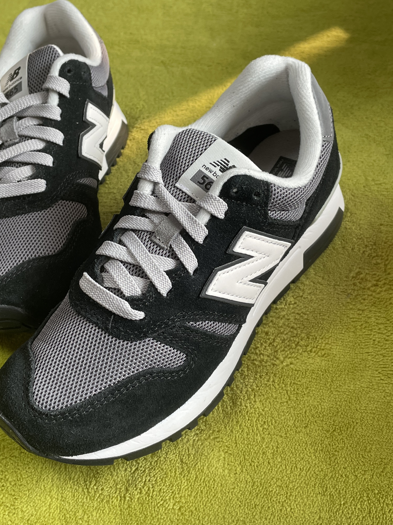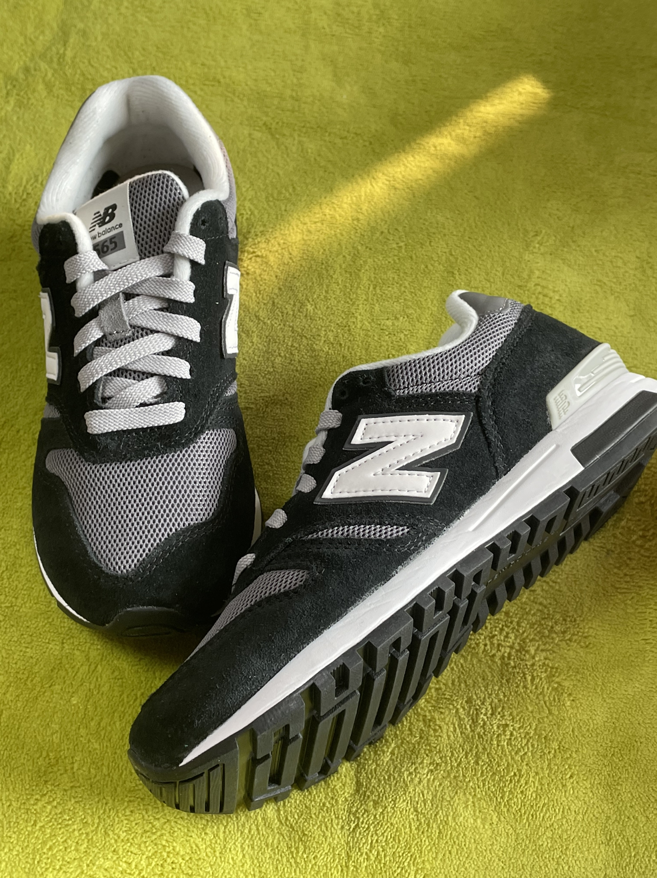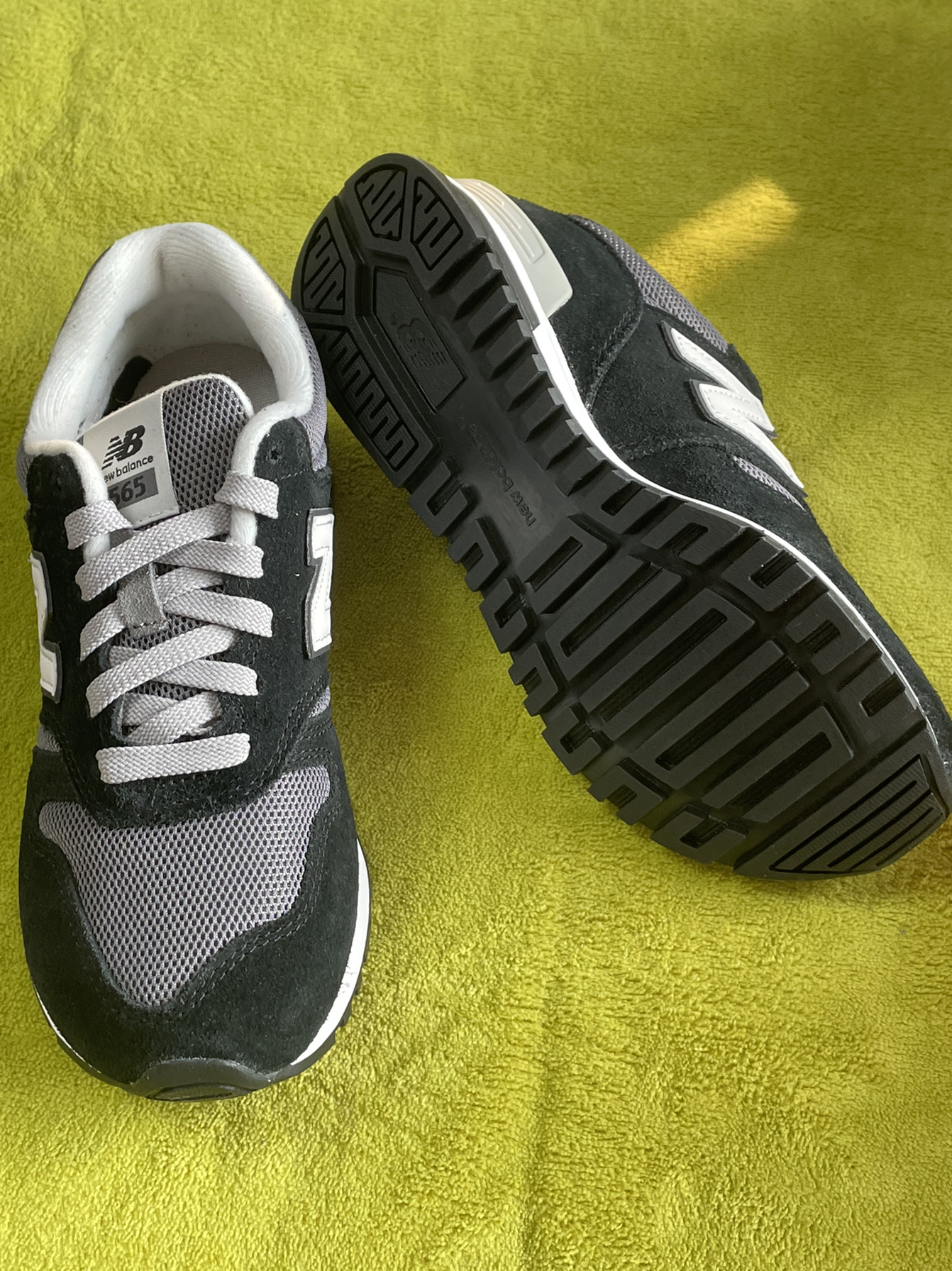 👟:NewBalance565系列灰黑色男女同款 这鞋子可以说真的老经典了! 鞋子鞋面采用翻毛皮、网眼和织物面料,质感丰富细腻。舒适透气性良好。 鞋身用黑色打底,加入了灰色、白色点缀,外侧白色N标志,鞋舌、鞋带、鞋面后跟都是灰色,鞋舌和后跟都带有黑色新百伦logo,白色中底搭配黑色橡胶外底,上脚感舒适柔软,非常适合日常出门穿搭!