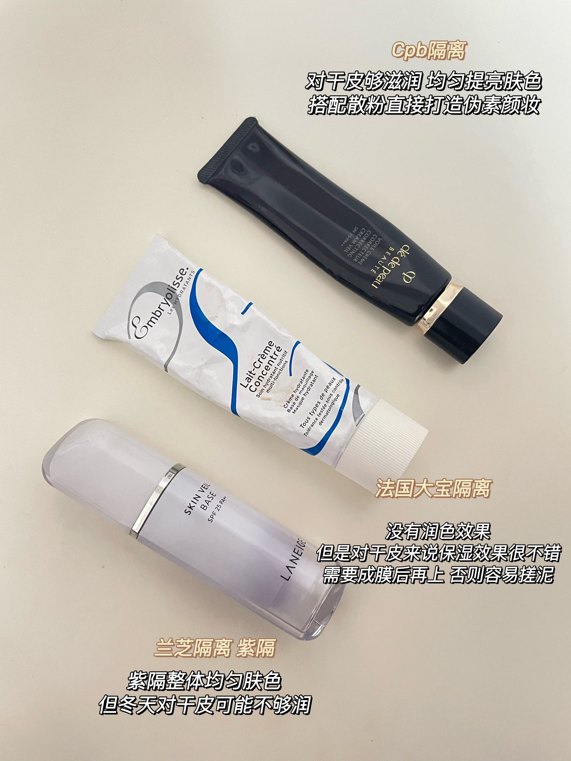 首先自我介绍一下 坐标Ⅰ魔都 肤质Ⅰ 大干皮 一年四季都在干 有小斑 点 分享一下本干皮目前使用觉得不错的底妆 💁🏼♀️ 妆前隔离: ✨cpb隔离 在我这目前还没发现超越它的,轻薄又水润保'湿 能均匀提'亮'肤'色,搭配散粉直接妥妥的伪素颜 ✨兰芝隔离 紫隔 紫隔能调节暗'沉的肤色 但目前使用下来冬天不够润 ✨法国大宝隔离 大干皮应该都有试过,确实够保'湿 但一定要成膜后才能上妆!不...