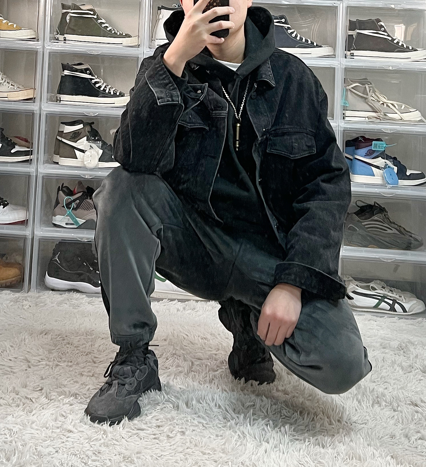搭配公式: 落肩牛仔外套➕帽衫➕休闲束脚裤➕老爹鞋 颜色公式: 黑色外套➕黑色内搭➕深灰裤装➕黑色鞋 牛仔外套叠穿卫衣的穿法简约百搭 舒适实用 开春也要努力做街上最靓的仔