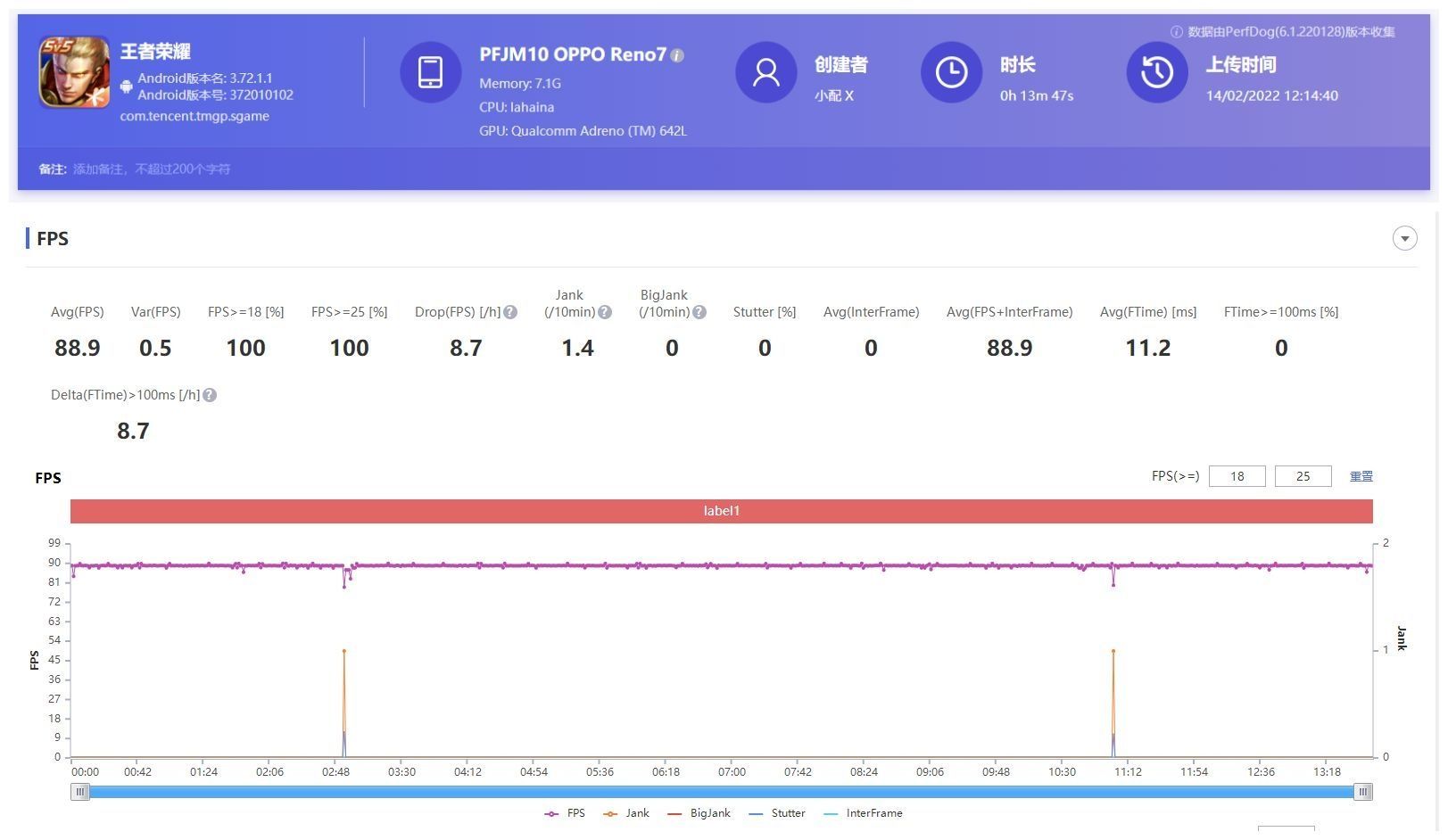 OPPO Reno7 搭载高通骁龙778G处理器,性能介于联发科天玑920和天玑1100之间,配备90Hz刷新率屏幕,得益于新机对于游戏适配性,《王者荣耀》支持到90FPS高帧率模式,除了团战偶尔会有些许掉帧基本可以满帧运行;配置较高的《原神》全开画质下即便开启极限稳帧也会有较大波动,建议适当降低画质以保证流畅度;《和平精英》和《英雄联盟手游》均没有适配高帧率模式,只能在最高60FPS下运行 其...