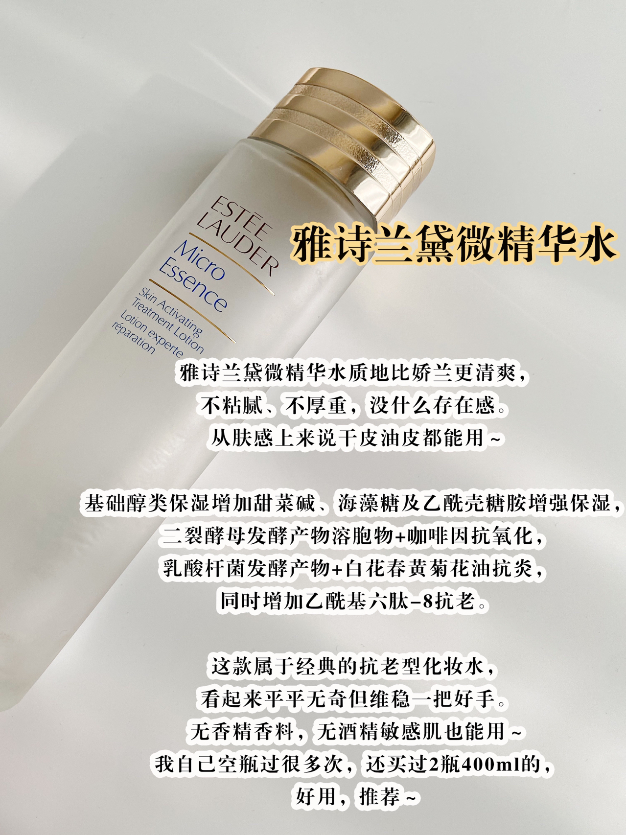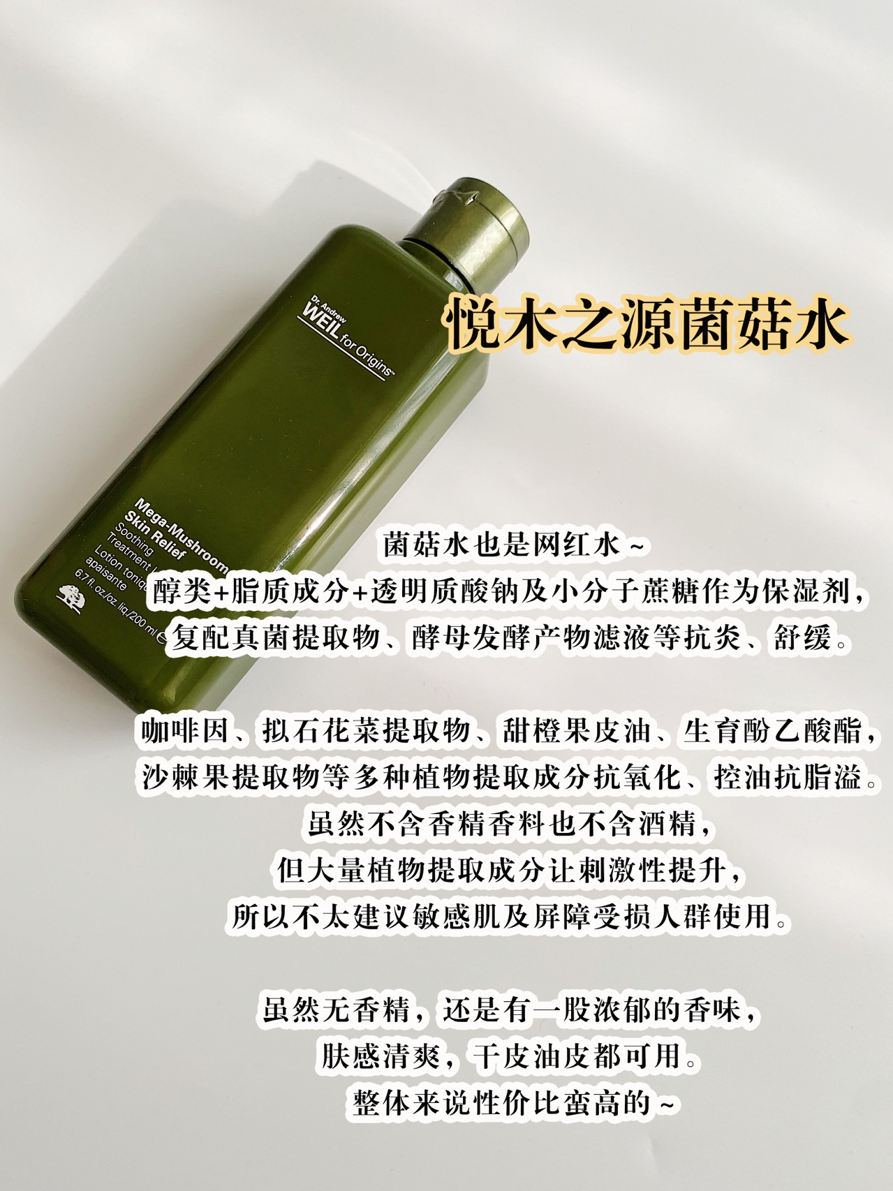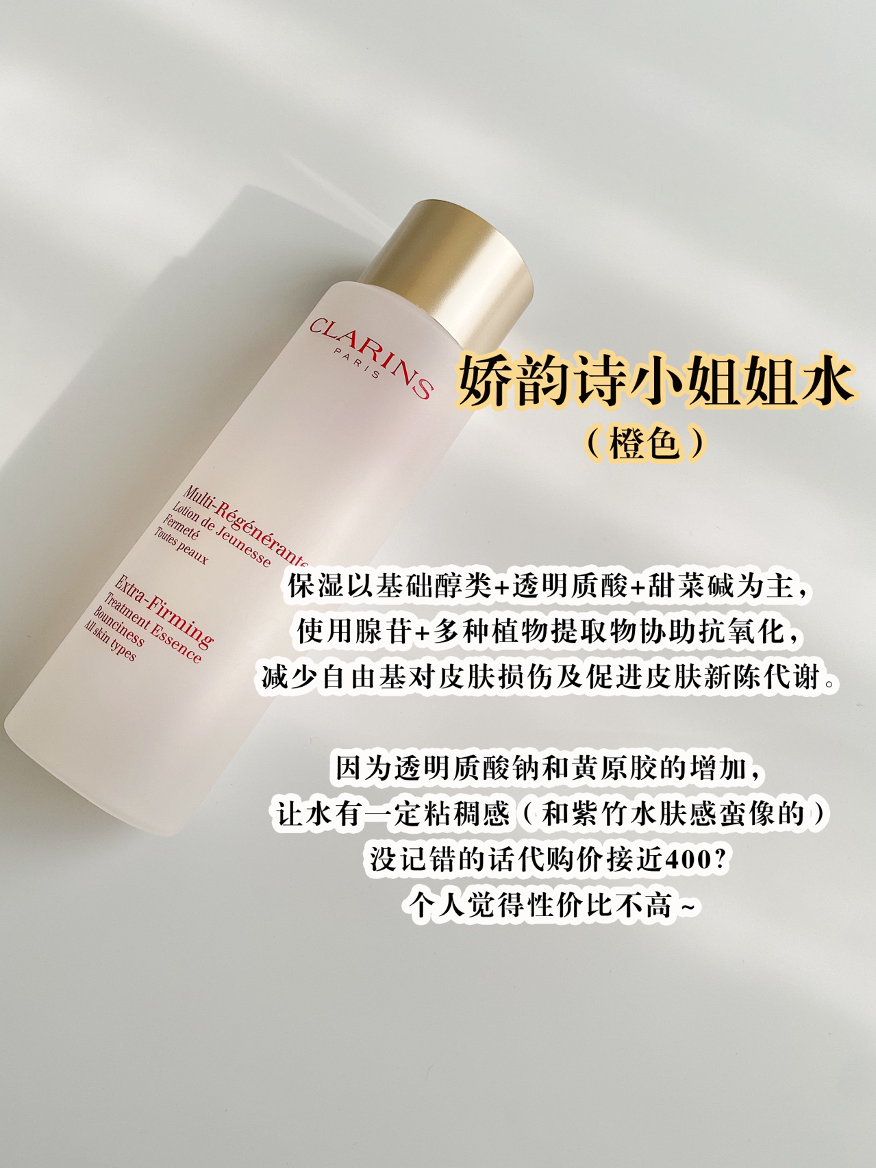 【8款化妆水总结】 1、娇韵诗焕颜紧致化妆水(俗称小姐姐👩🏻水),肤感不错,润滑稍有存在感,香味宜人。但性价比不高,不太推荐;👐🏻 2、雅诗兰黛紫竹水,质地稍粘稠,😊性价比不错的初抗老精华水,是干皮会更喜欢的肤感。👏👏👏 3、朵梵舒缓调理水,虽宣称是适合敏感肌使用的化妆水但不太建议敏感肌用。 粉色液体,稍粘稠。比较甜腻的香味,性价比还不错,干皮会更喜欢;💕 4、悦木之源菌菇水,虽然无香精香料、无酒...