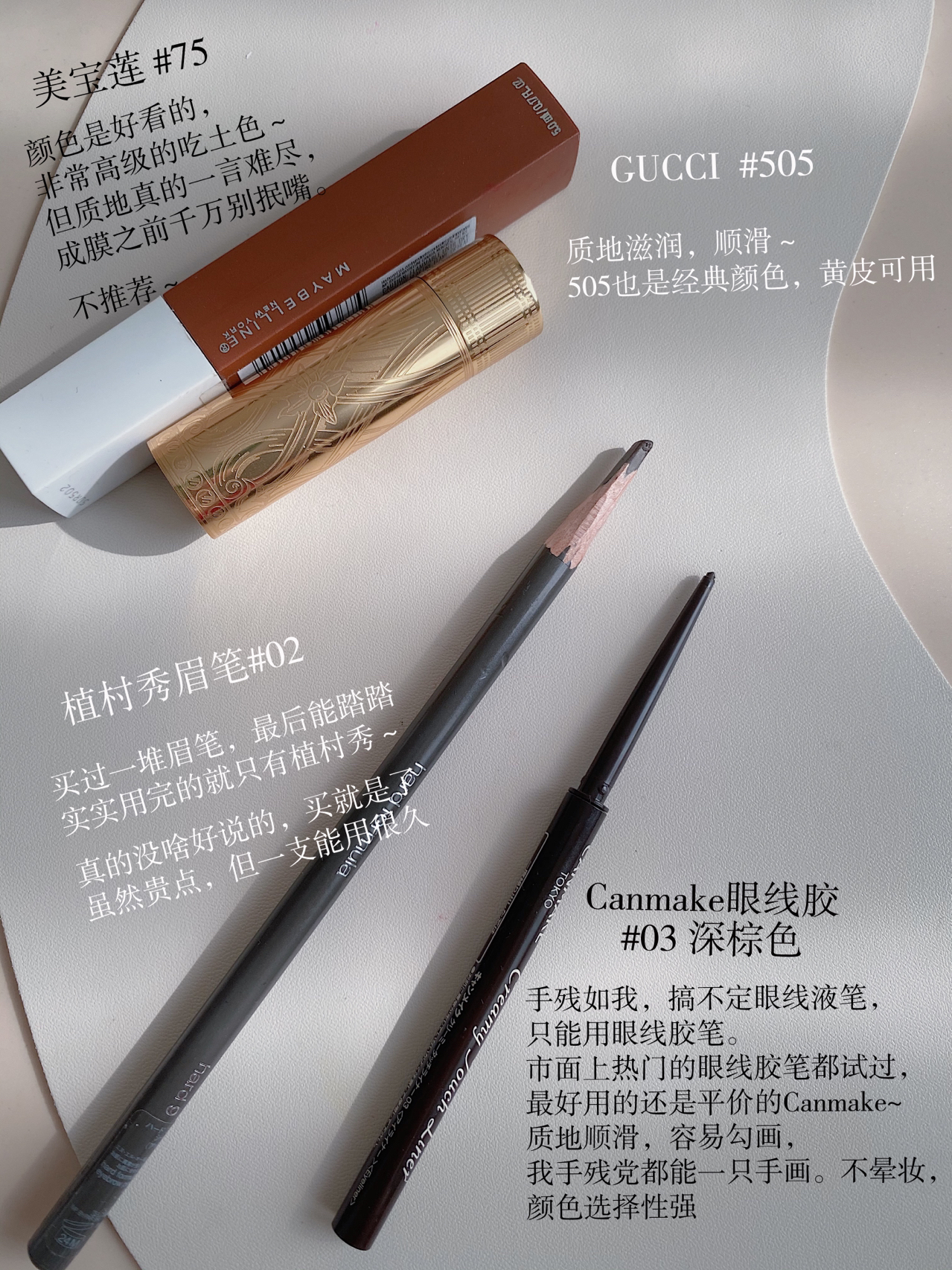 本篇笔记关联了Gucci/古驰 竖纹金管倾色绒雾口红 哑光雾面丝绒 3.5g 505复古珍妮特、shu uemura/植村秀 经典砍刀眉笔 防汗不脱色不易结块 02灰棕色 人气色 多种发色 3.4g、CANMAKE/井田 极细防水眼线胶笔 #03 深棕色等商品,为用户提供真实的使用体验和购买参考。