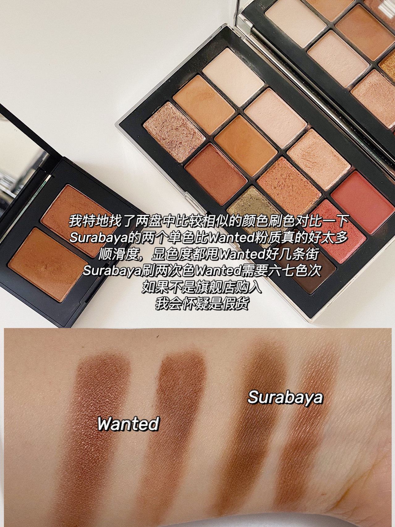 【Nars眼影分享】 早上用Surabaya化妆,想起里面的两个颜色好像和Wanted有两个颜色很像?顺便把手里的4盘Nars拿出来对比一下: ▶️Surabaya; 浓郁的巧克力棕色🏾,是这几盘中我自己最喜欢,使用度最高的一盘。 暖调的🏾,看起来好像颜色很深,但其实粉质很顺滑、也好晕染。基本不会出现结块、晕染不开的问题。 上👀很小众,基本不挑皮~这盘很推荐👍~ ▶️Kuara Lumpur; 吉...