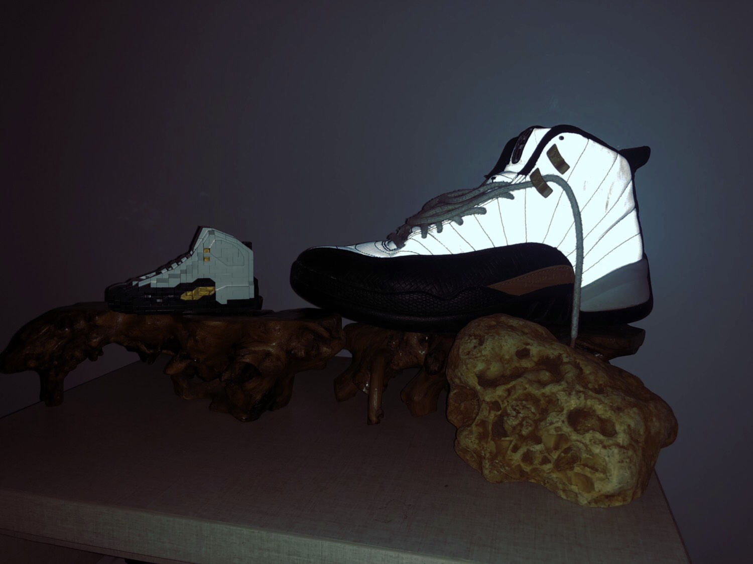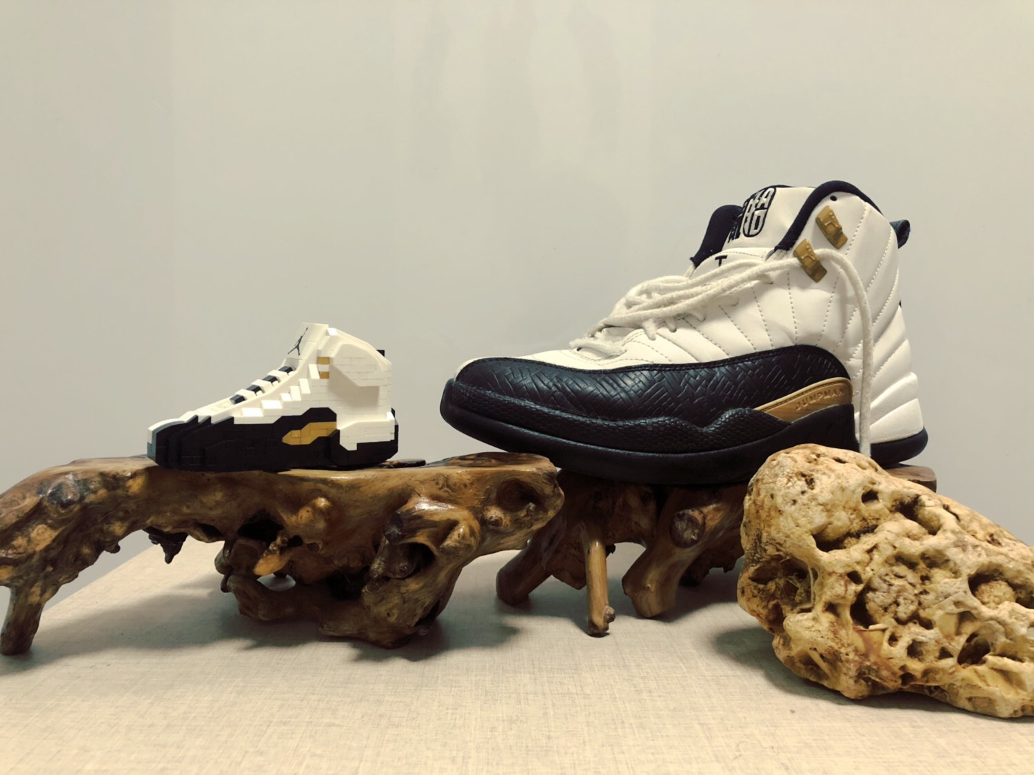 最近收的一个小玩具,想起和我的Jordan 12 cny一起摆拍应该蛮有意思。 这简单介绍一这款中国专属的版本AJ12,黑白色调的组合同金扣极为相似,鞋舌上印有繁体字样的“贰拾”,但是从左往右度就是拾贰。一语双关,贰拾周年和拾贰代!细节上也别具中国特色,黑色皮质部分(包括鞋提很后跟部分),印压有类似竹筛的编织纹理,而鞋带扣和鞋身侧的JUMP MAN标识也采用了竹子纹路和颜色与之呼应...