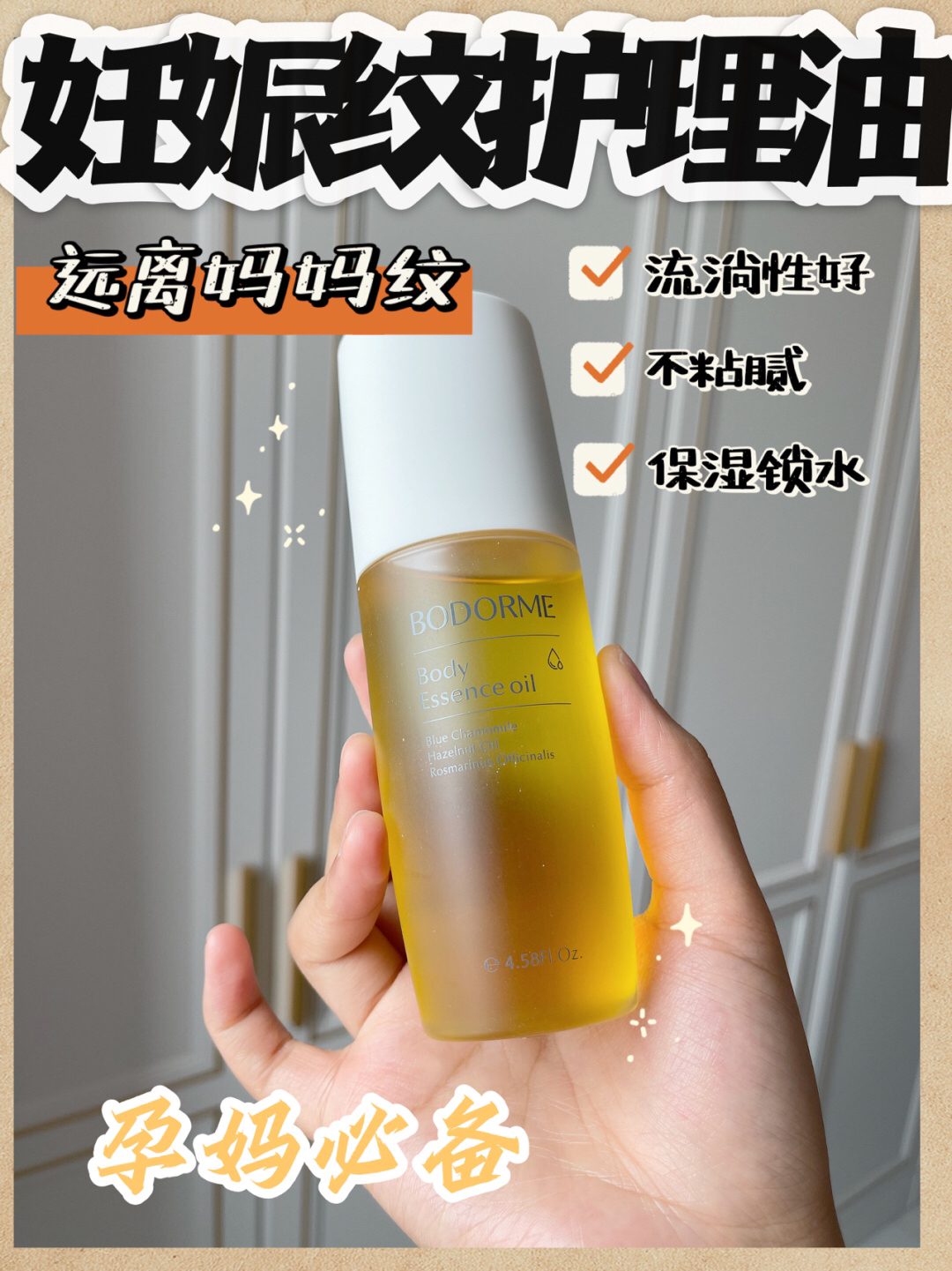 孕期除了面部的护理,最头疼的就是长妊娠纹了,孕期由于腹部增长过快,腹部纤维断裂,非常容易长出银色的花纹,想到以后不能穿比基尼,我赶紧入手了贝德美家的妊娠油,在成分上它富含欧洲榛果油和印加果籽油,能够提升皮肤弹性和韧性,从根源预防纹路 另外添加了霍霍巴籽油/金盏花等9种植物精华,淡化妊娠纹,而且这些成分都是天然的,不会伤害宝宝哦,抹完这个油皮肤变得光泽滋润,连身体乳都省了。因为我从肚子还没有大的时候...