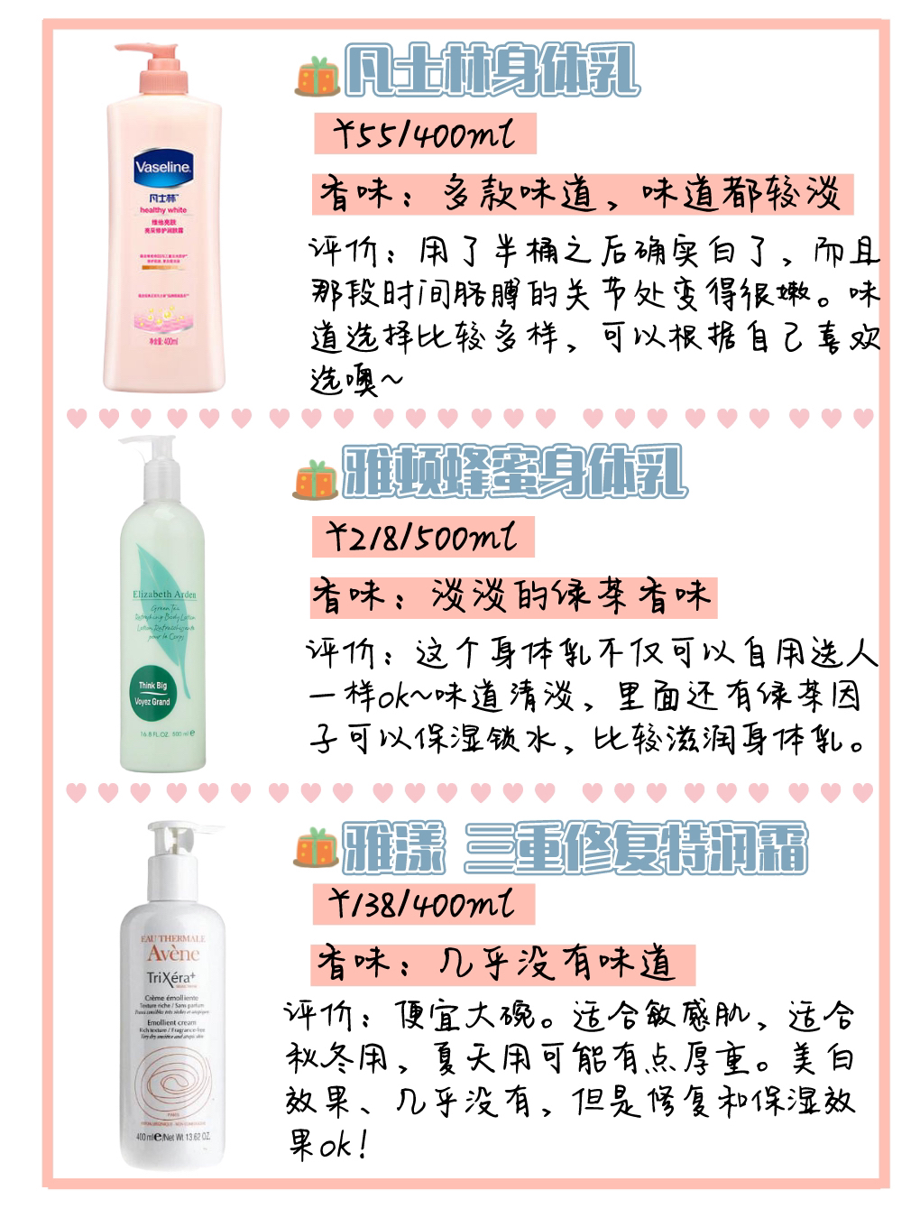 本篇笔记关联了L`occitane/欧舒丹 清甜樱花香身体乳 滋润保湿持久留香送女生礼物 清甜樱果香、Vaseline/凡士林 烟酰胺焕亮修护美白身体乳 清爽保湿提亮持久留香 【针对暗哑干燥肌】焕亮保湿、Aveeno/艾惟诺 燕麦补水身体乳 柔嫩舒缓 长效无香型 高保湿大绿瓶等商品,为用户提供真实的使用体验和购买参考。