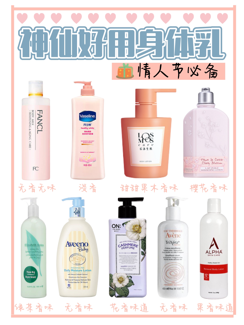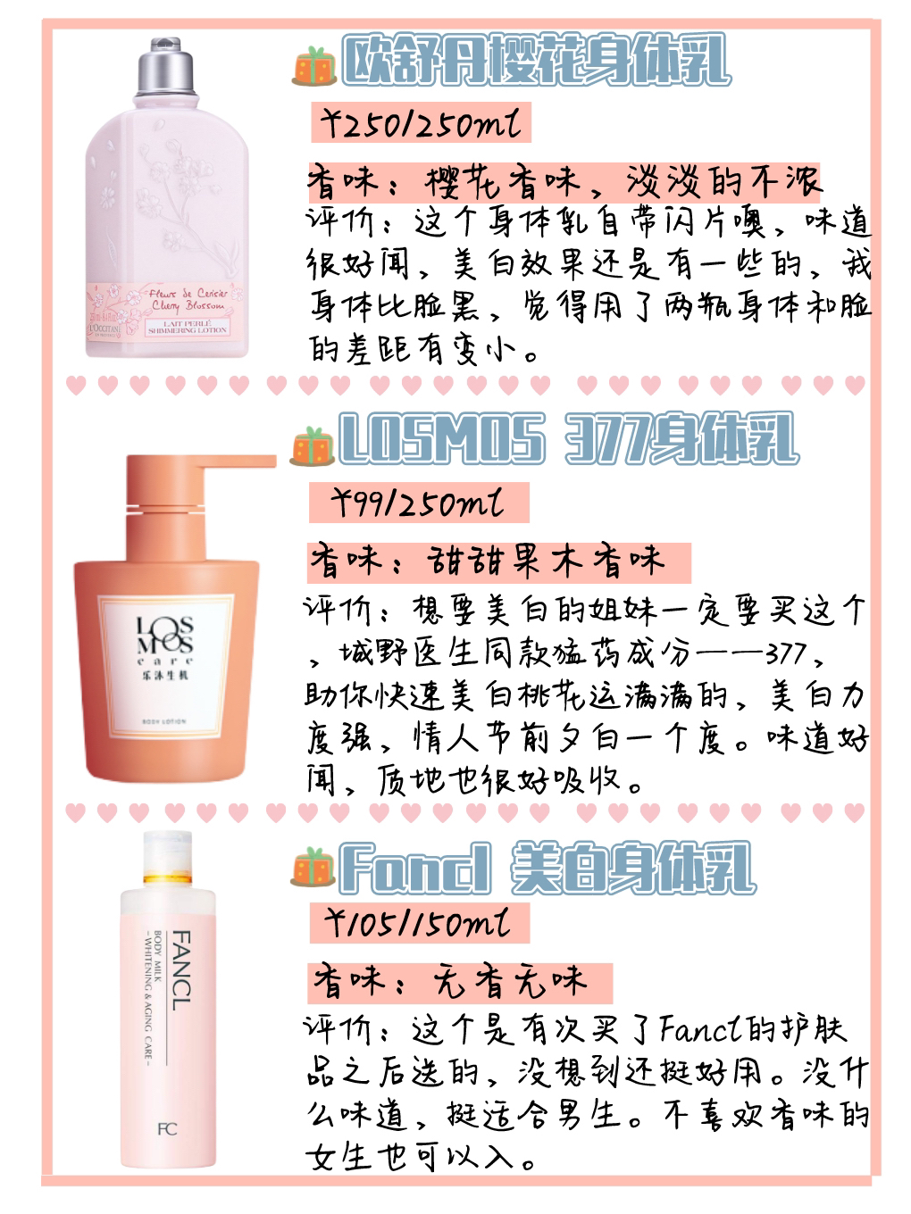 过完新年还有两周就是情人节啦,情人节肯定是去约会哒,但是你总不希望男票牵着你黑黑又粗糙的小手吧,听姐妹一句劝,赶紧提前一个月就把身体乳用起来吧!不然来不及啦,今天赶紧给你们盘点了一些好用的身体乳。 欧舒丹樱花身体乳 这个身体乳自带闪片噢,味道很好闻,美白效果还是有一些的,我身体比脸黑,觉得用了两瓶身体和脸的差距有变小。 LOSMOS 乐沐生机377身体乳 想要美白的姐妹一定要买这个,城野医生同款猛...