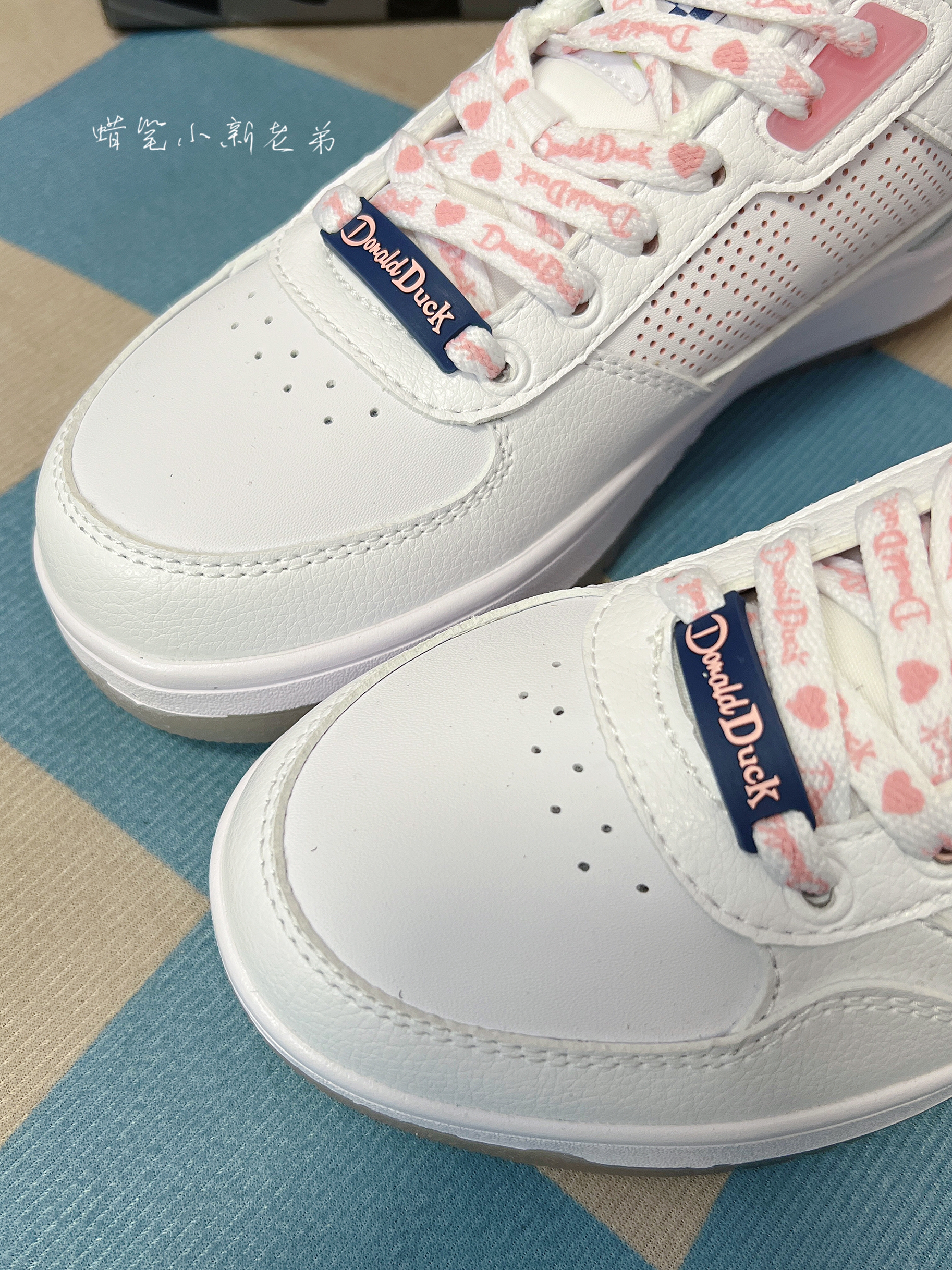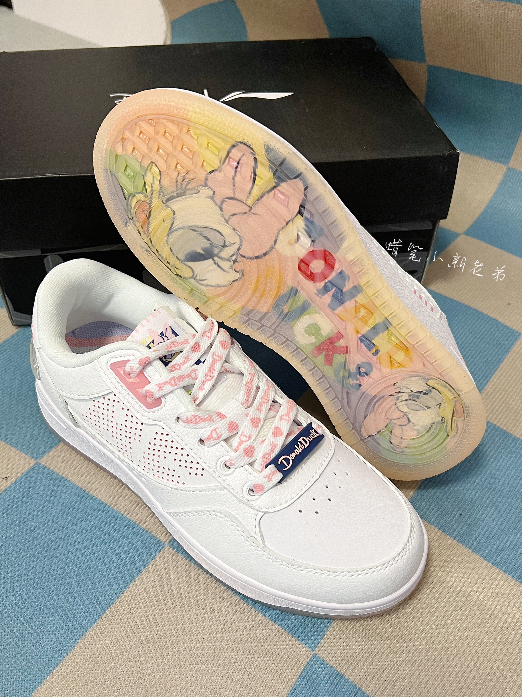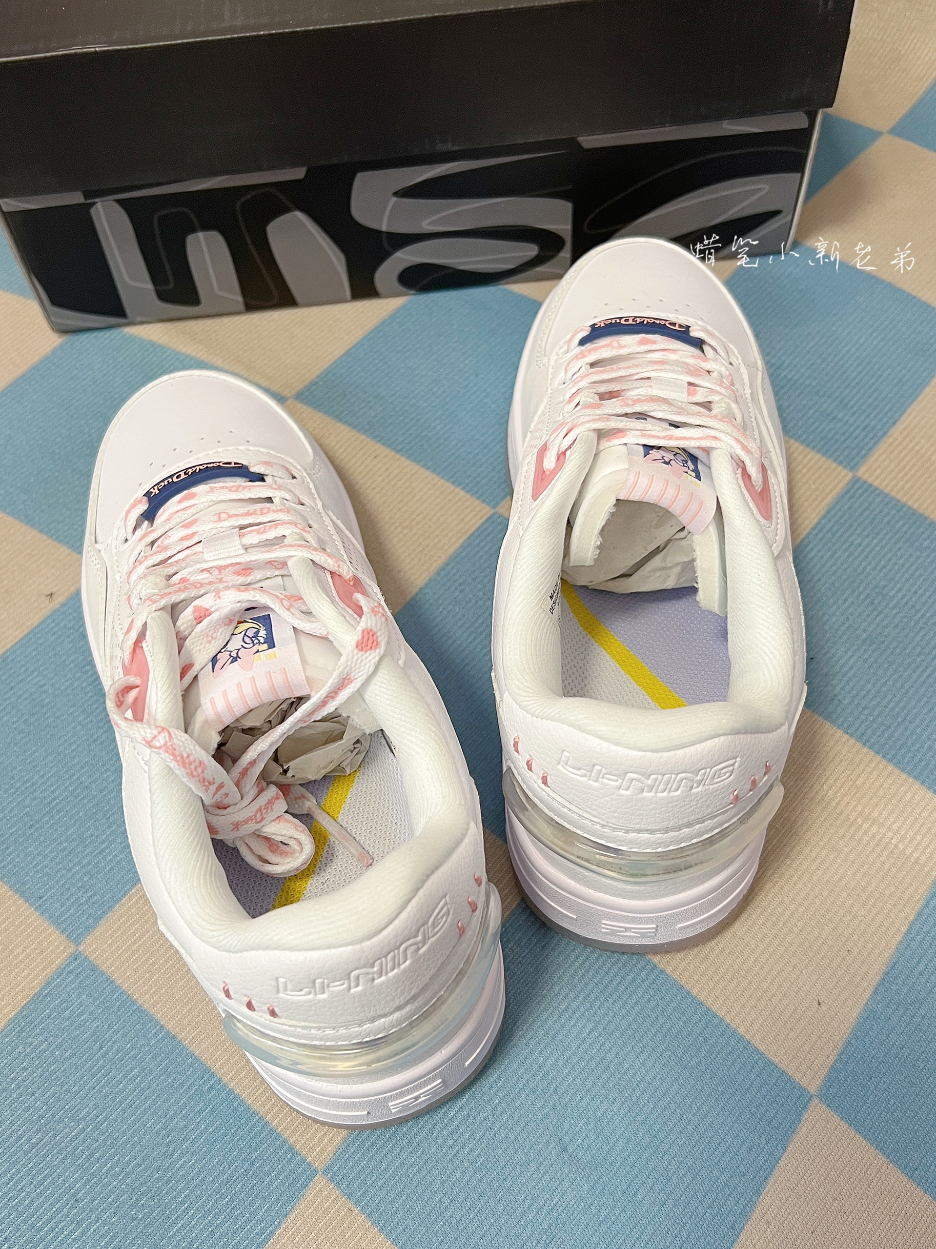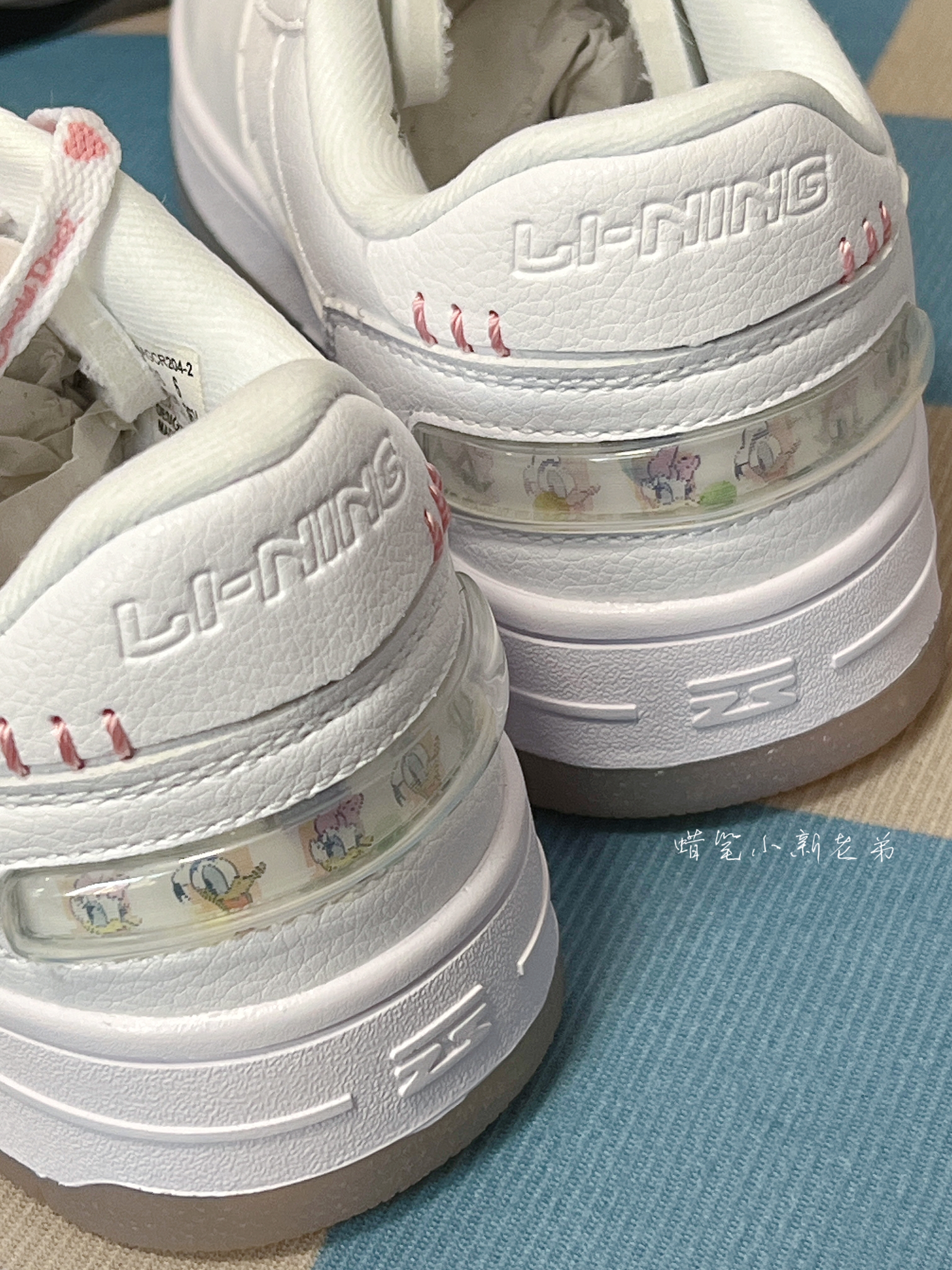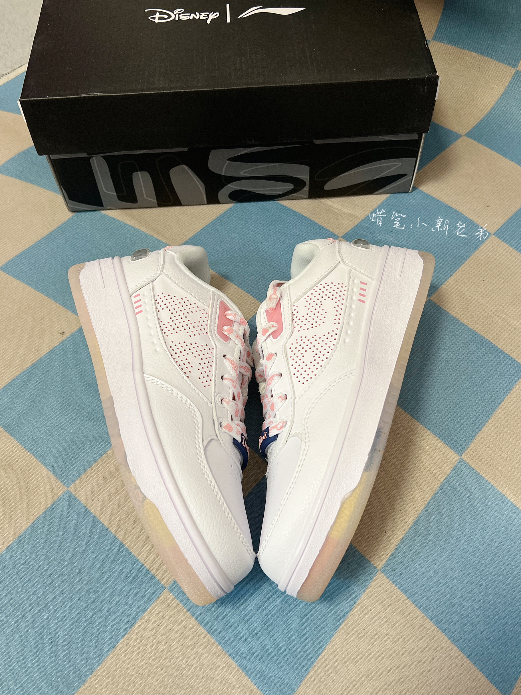 Disney x LiNing李宁经典休闲板鞋 女款 白 粉 迪士尼联名 鞋子整体采用了白色,粉色点缀其中,鞋舌有着女款鸭鸭图案,半透明水晶鞋底也透露出鸭鸭图案,非常具有特色,鞋身整体采用了合成革材质,实物很好看的一款板鞋,春季宝藏单品,很好搭衣服,平时穿校服就很好看