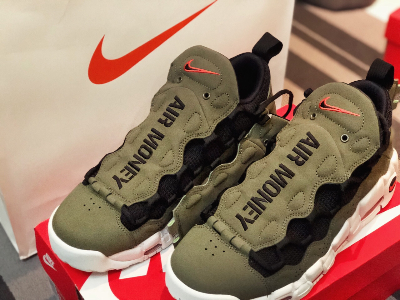 先说我买的这款Air more money,这个鞋子整体造型以经典复古鞋款 Air Money 为设计蓝本,与Air More Uptempo 的中底设计相结合。亮点在鞋后跟,我买的这款橄榄色缀有美元 “$”符号,希望穿上去真的能更有钱。喜欢迷彩以及工装的男生可以试试。