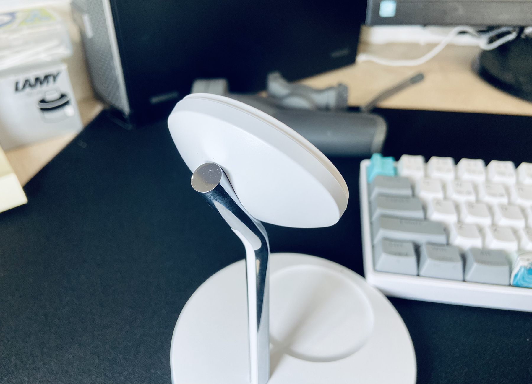 入手理由:因为老婆在办公室写材料,经常也需要配合手机使用,因为充电要插线比较麻烦所以总是经常忘记给手机充电,女神节快到了,我想帮她彻底解决这个问题,所以就提前下单这款贝尔金的无线充电支架,可以同时给她的耳机一起充 外观设计:贝尔金的设计在行业里口碑是非常不错的,而且这款支架是专为果粉设计具有 Made for Magsafe 认证品牌,磁吸部分的大小刚好与充耳机的大小一样,看起来线条更协调美观,和...