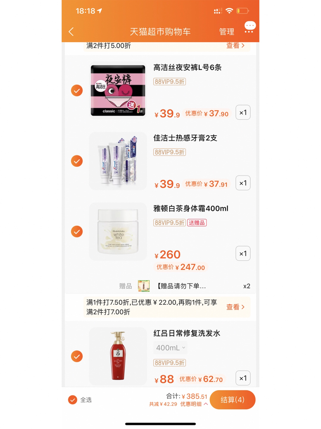 还记得上大学的时候总要跑超市买生活用品,一袋袋的提回宿舍还真的挺累人的,幸好现在网购方便哈哈,全部都可以在天🐱超市解决了,真棒!而且配送速度妥妥的! . 夜安裤真的是个伟大的发明,来大姨妈的前几晚我都穿这个,特别是周末喜欢睡懒觉,真的超安心再也不担心各种后漏侧漏的问题了! . 吕的这个红色的洗发水太经典了,我都用第三瓶了~洗得很干净但是又很垂顺的那种,有一股很贵的人参味~ . 雅顿的白茶身体乳简直...
