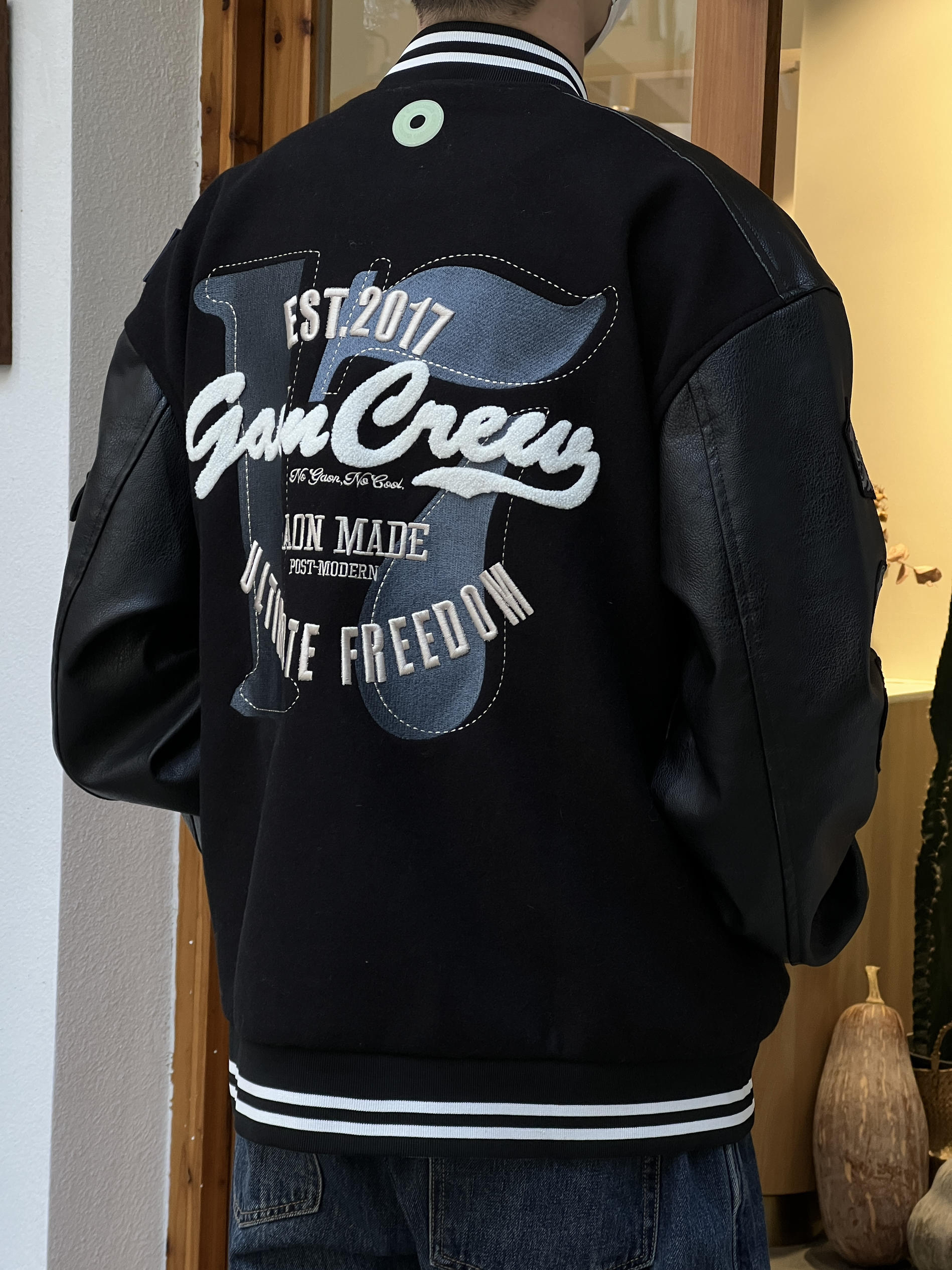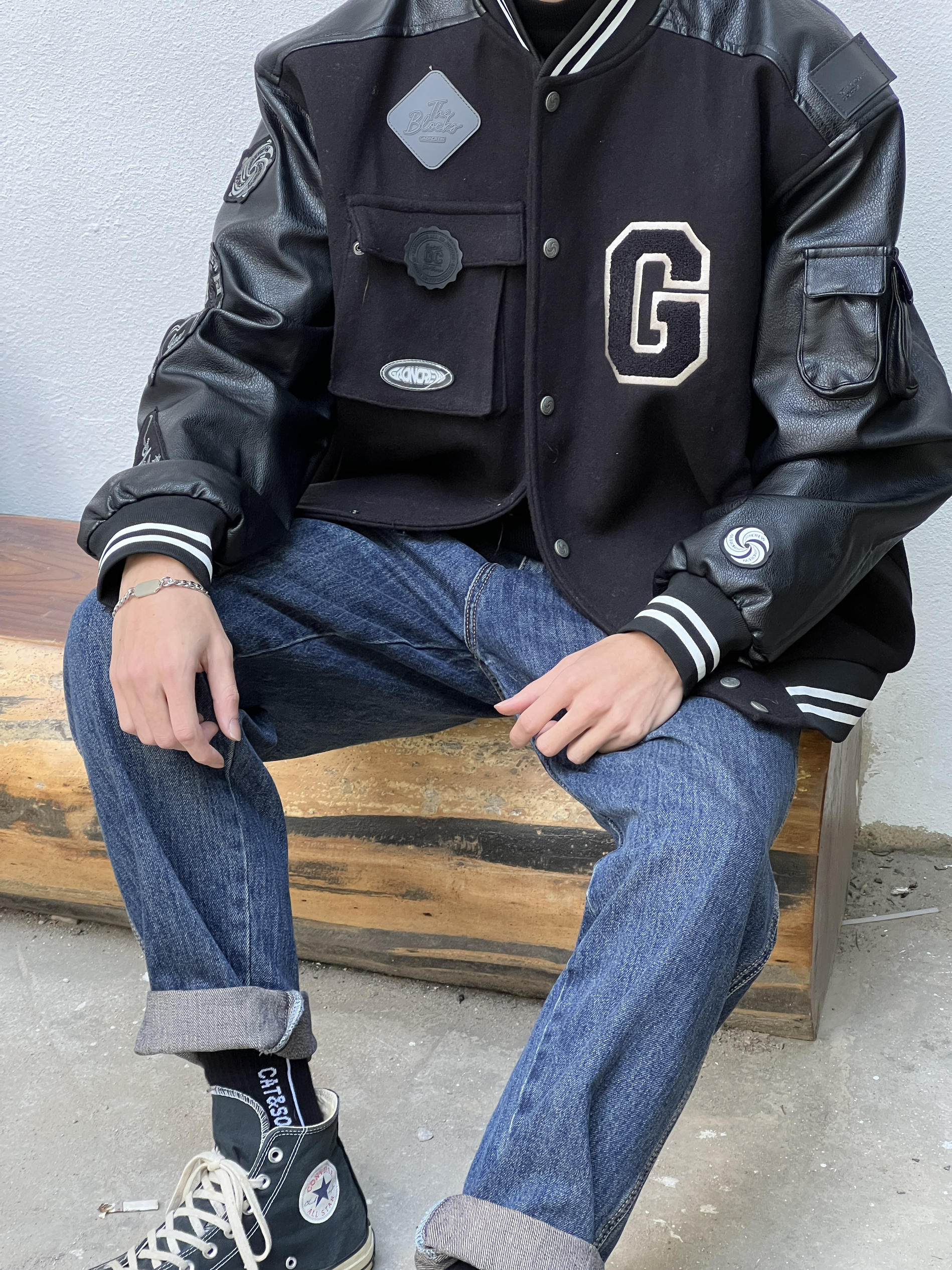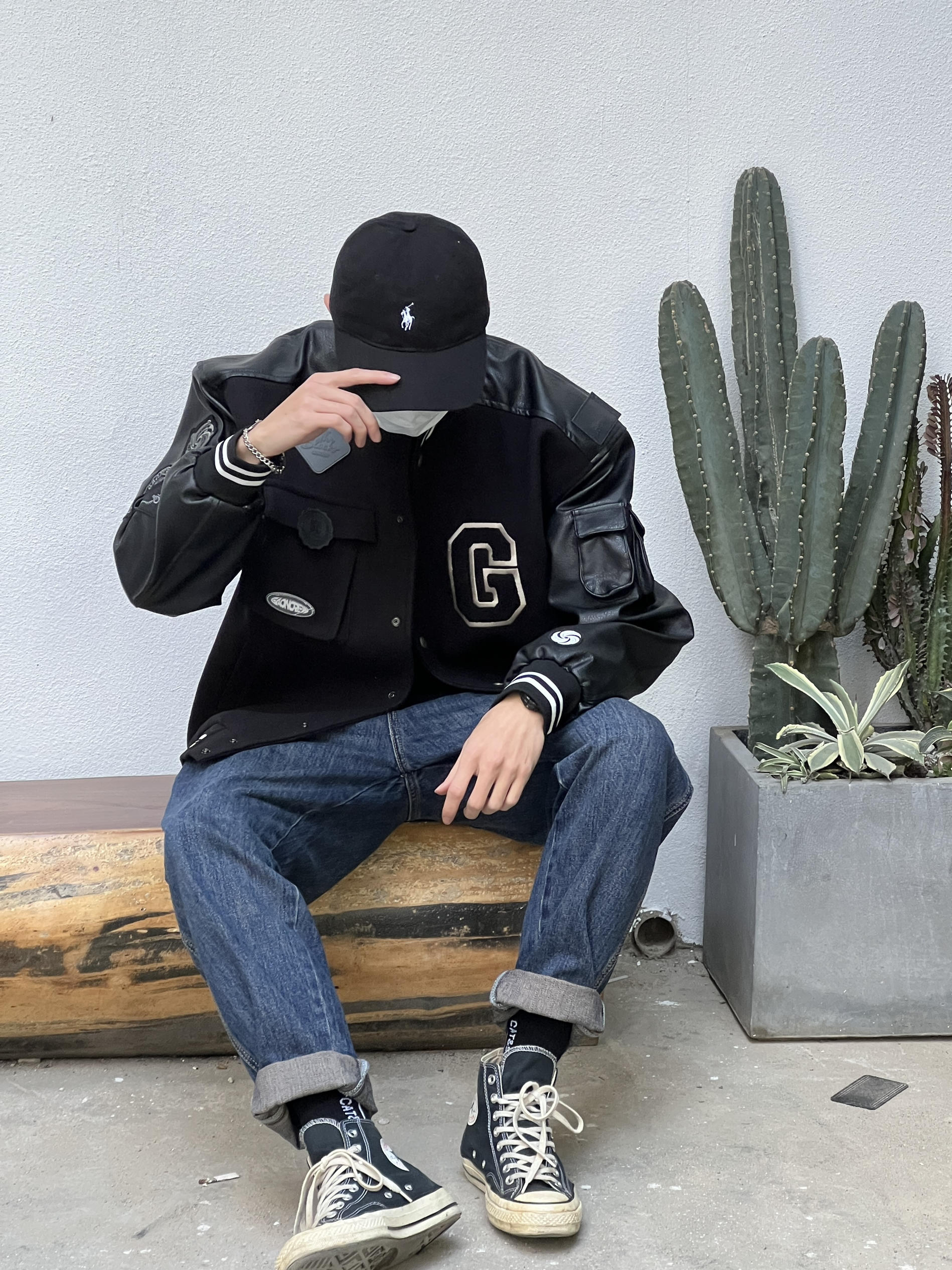 今天是街头机车男孩LOOK 到手沉甸甸的质感😎整件很高级👍🏻 皮衣拼接毛呢黑色棒球服很复古🆙 上面的刺绣设计也很有感觉哦😆 搭配经典👖锥形牛仔裤轻松get街头男孩OOTD 👔: GAONCREW 👖:豪霆旗舰店 🧢:polo 👟:匡威