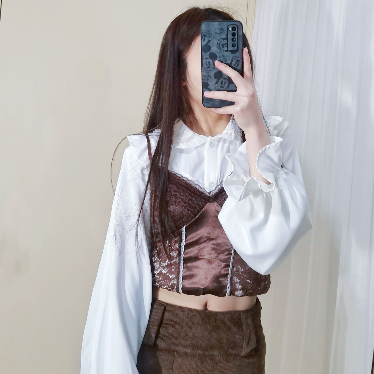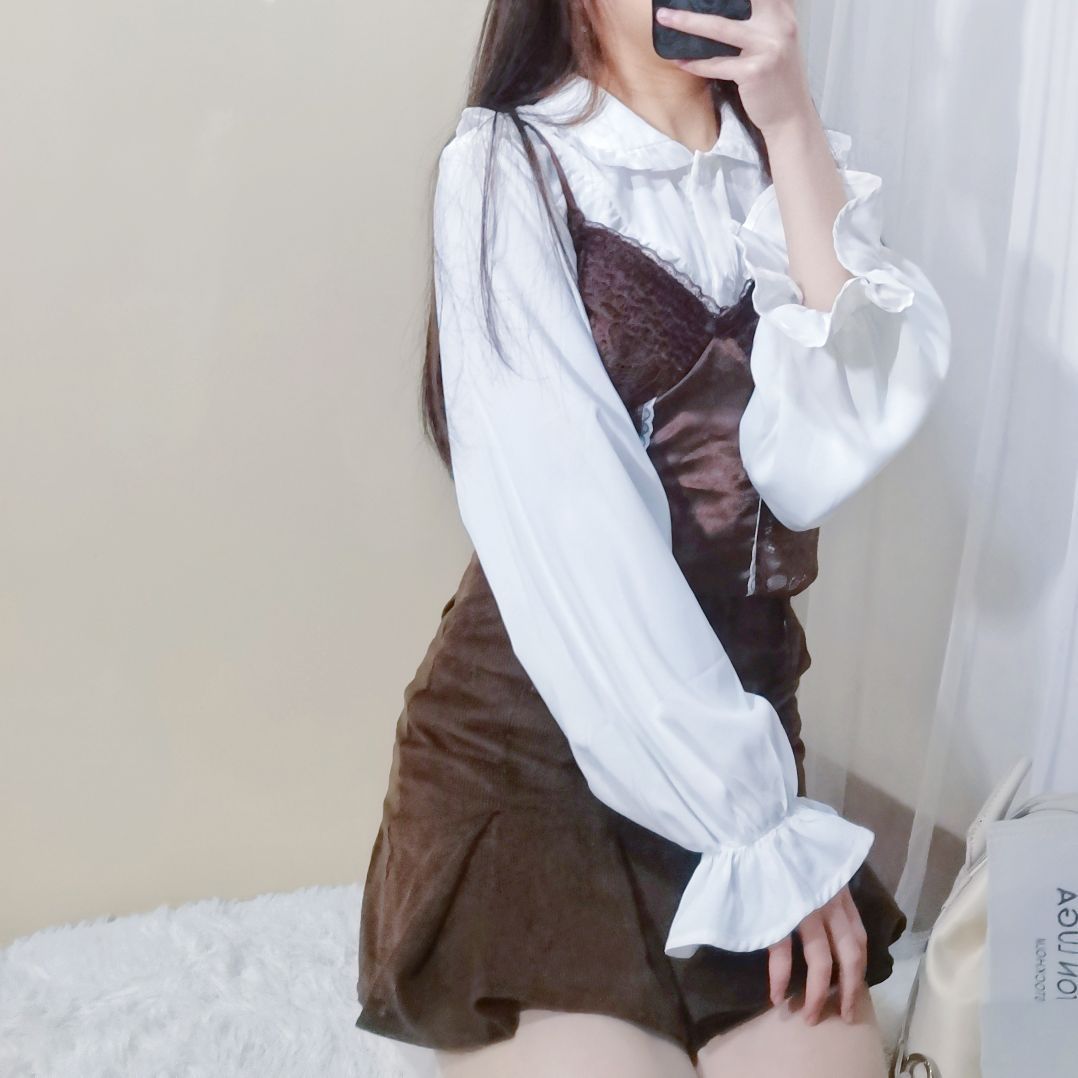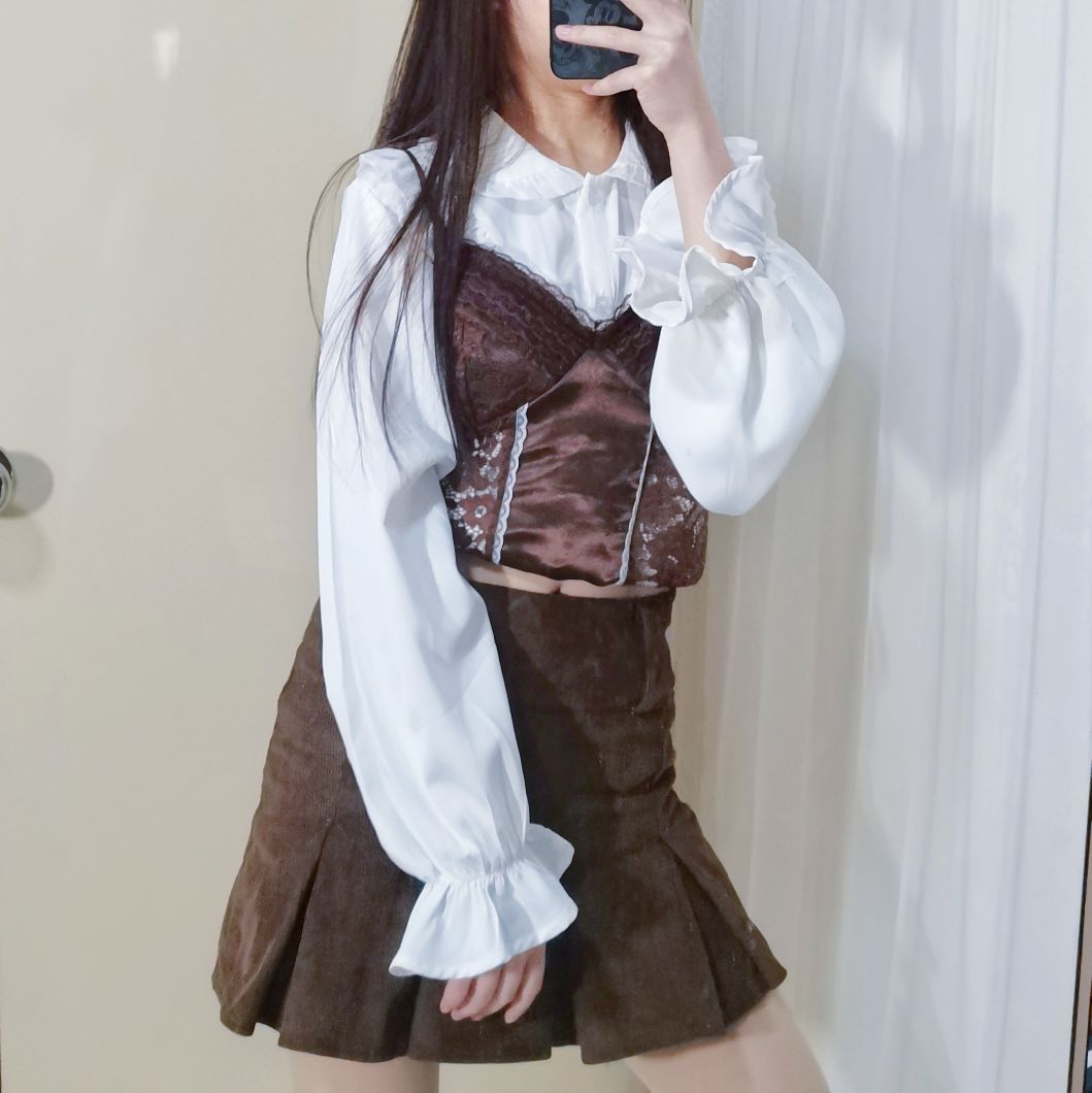 棕色蕾丝吊带背心 配上棕色灯芯绒超短裙 简直不要太👍 🔗大桔家DJDL 光腿:涞觅