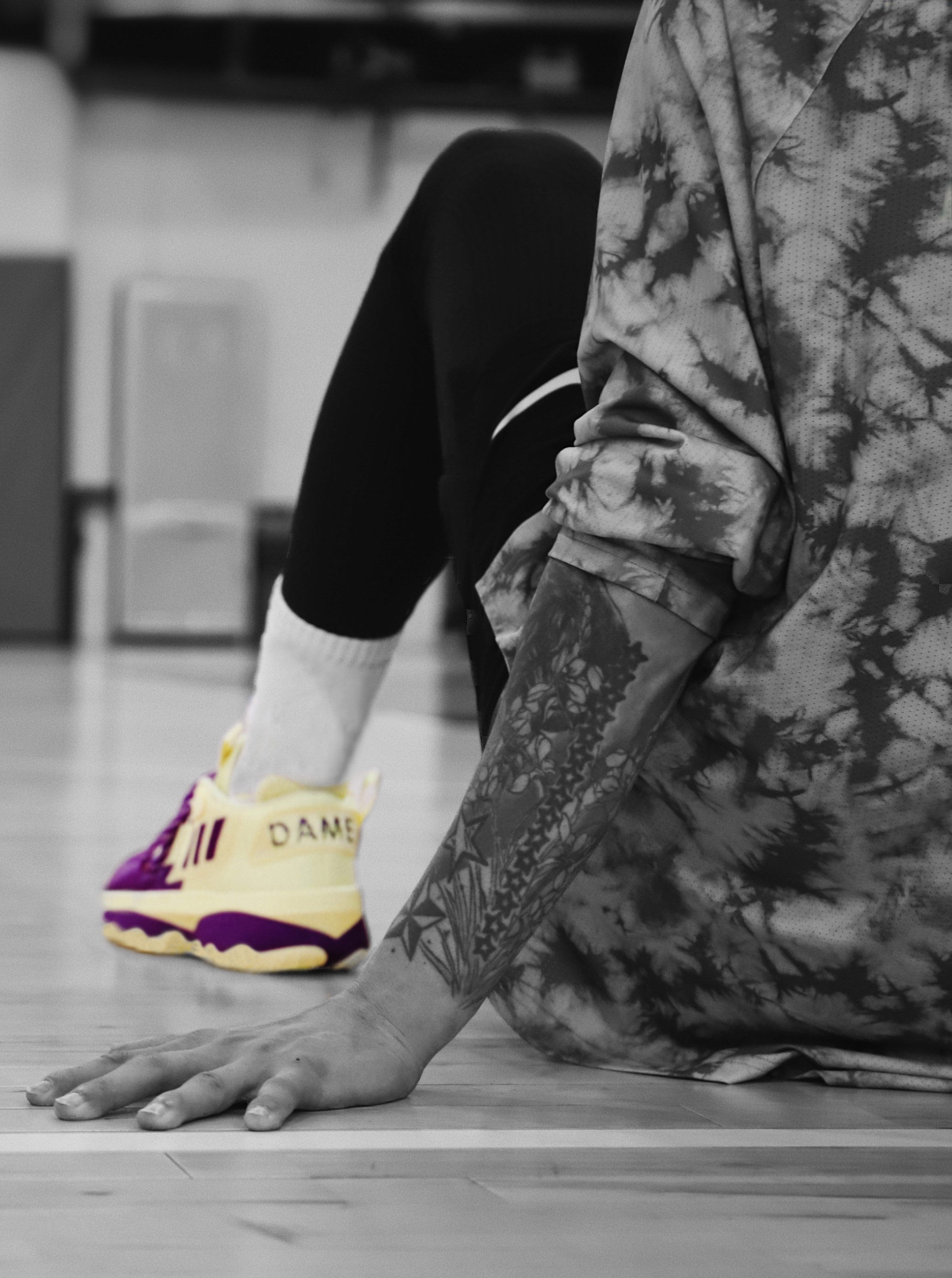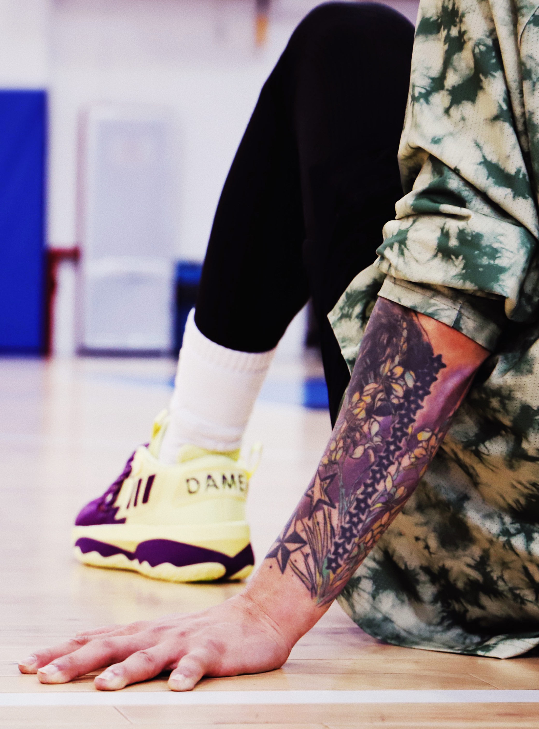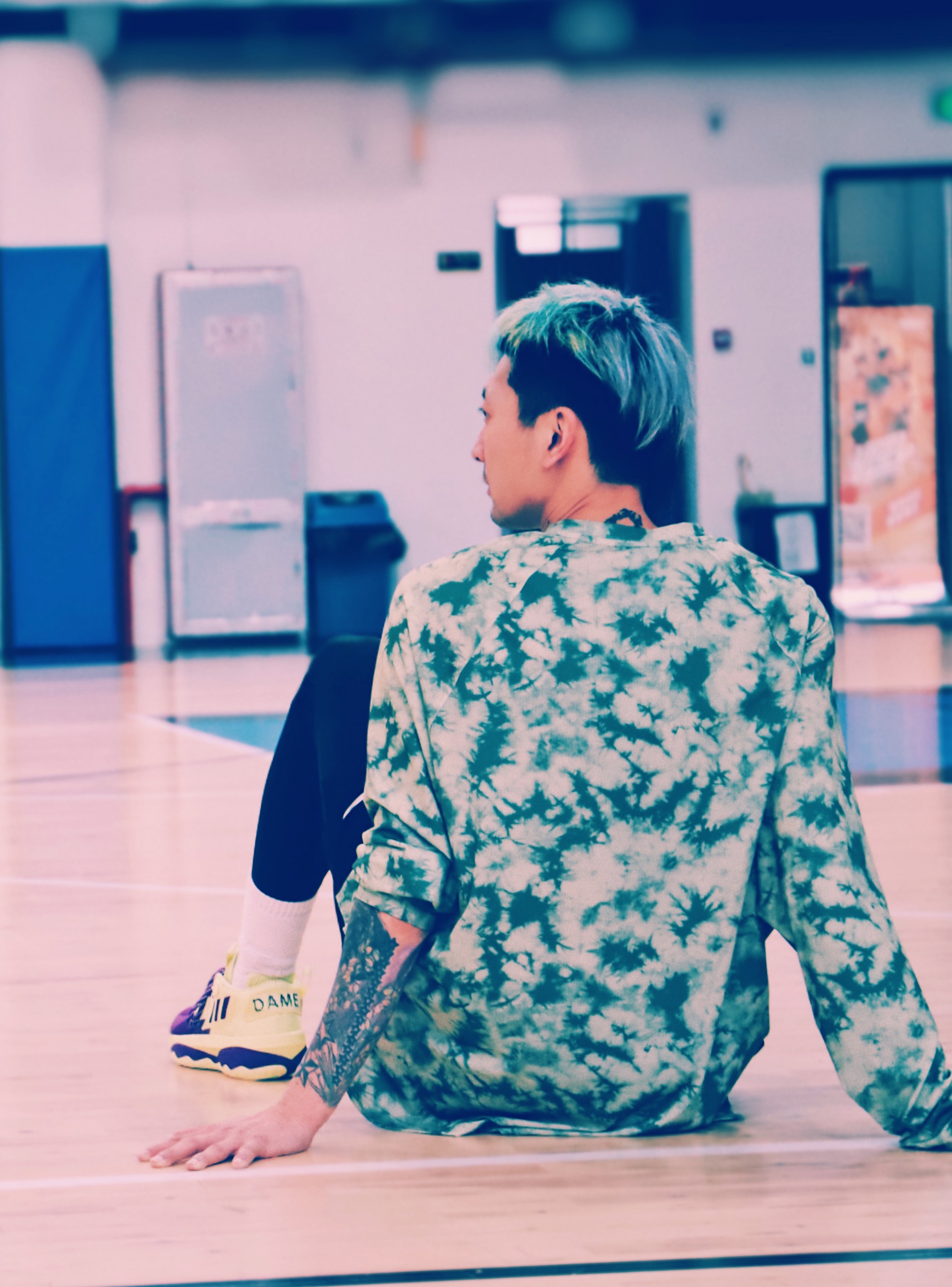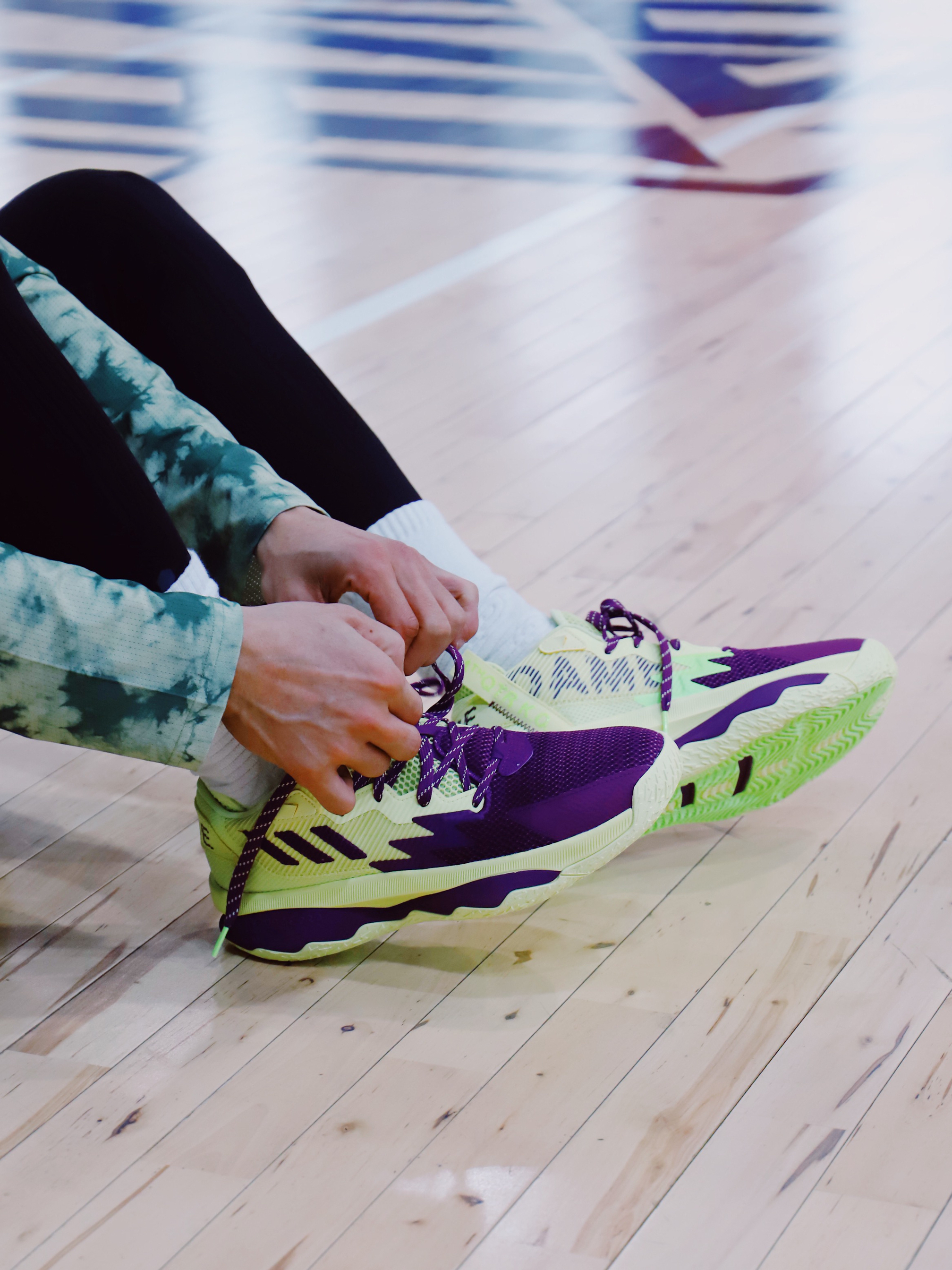刚开始拿到这双鞋子的时候,发现和7代的外观差异不大,总感觉一个模具刻出来的,难道阿迪达斯的设计师江郎才尽了吗,哈哈!整双鞋采用荧光黄偏点绿和紫色的搭配设计,所以在上身我搭配了件绿色扎染的长TEE,加上我可爱的小绿毛,话说,要想生活过得去,头上必须带点绿。哈哈。整套一个色系,在球场上也是最靓的仔。 说回鞋子,虽然前面提到和DAME 7有点像,但是在细节上还是有所不同的。此款配色设计灵感来自于末节绝杀...