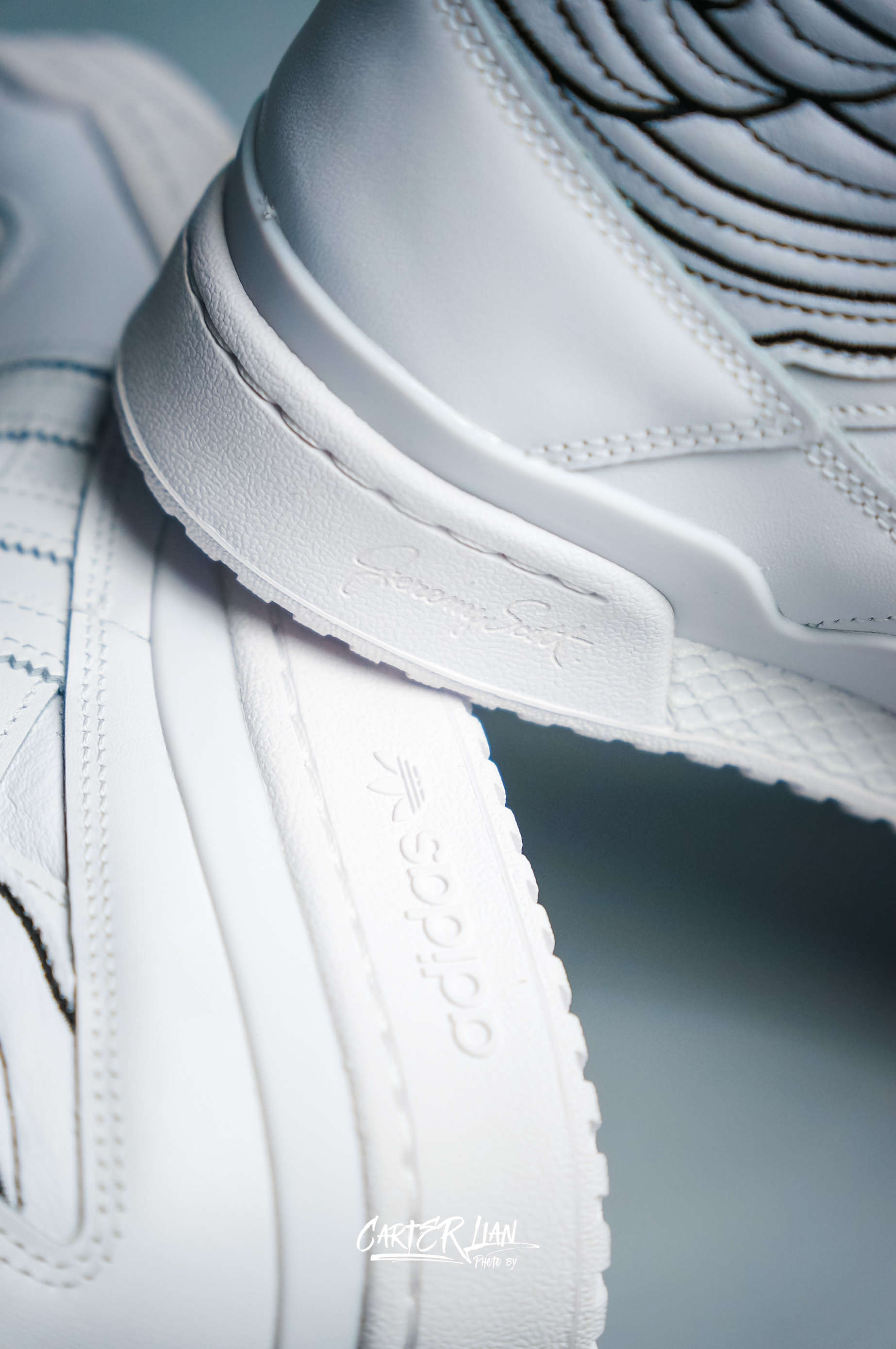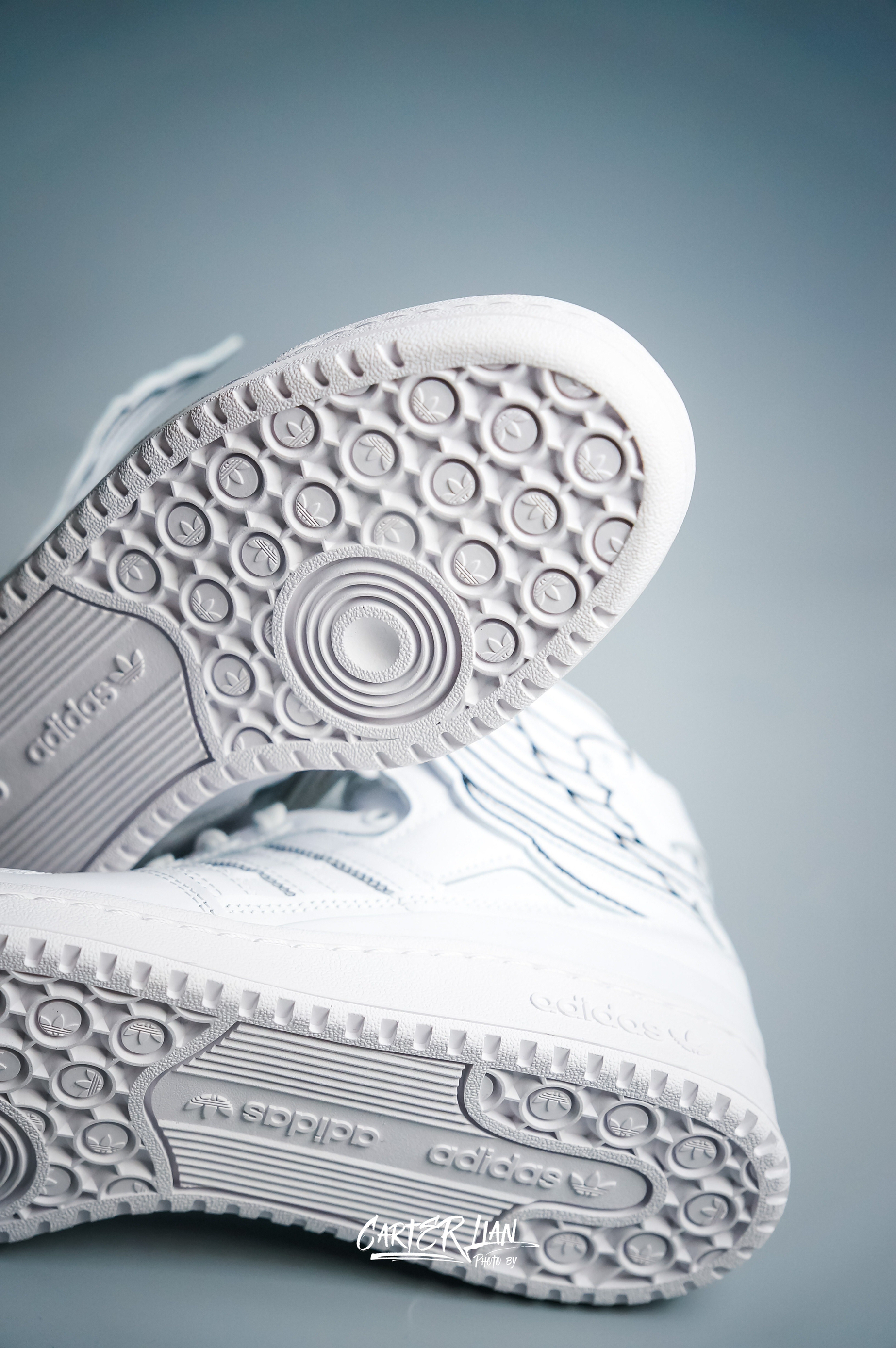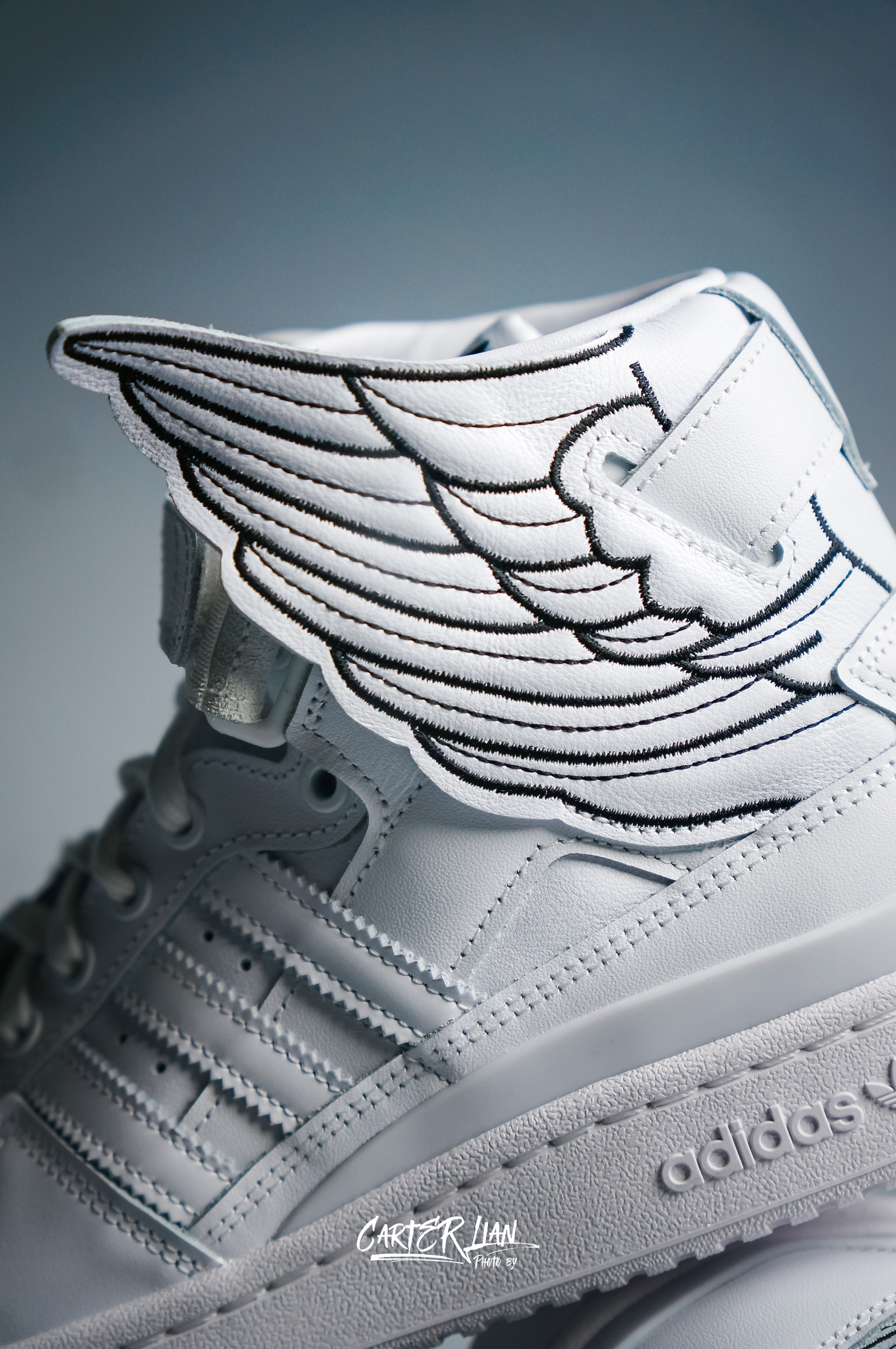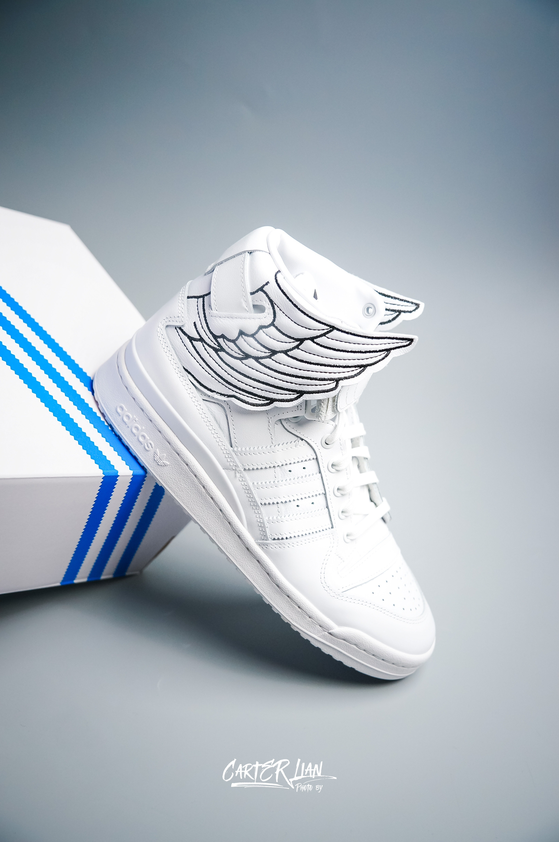 鞋款名称👟:Jeremy Scott x adidas originals Forum High Wings 4.0 整体细节👀:整体全白的配色,采用了质感柔软的牛皮哥材质,最特别的地方就在于反转的翅膀设计,非常有特色,标志性的绑带设计贯穿翅膀显得更有层次感了,既然是联名也少不了专属的元素,鞋舌内部有Jeremy的个人线描头像,黑色鞋垫也有他的名字,写内侧中底有它的签名压印。 个人感受:纯白...