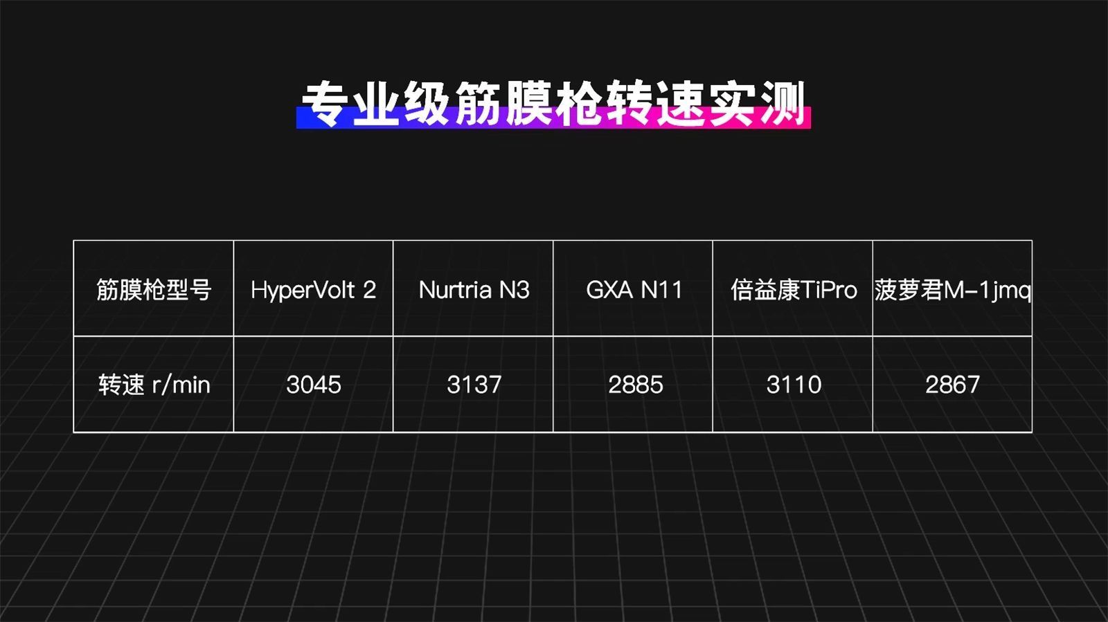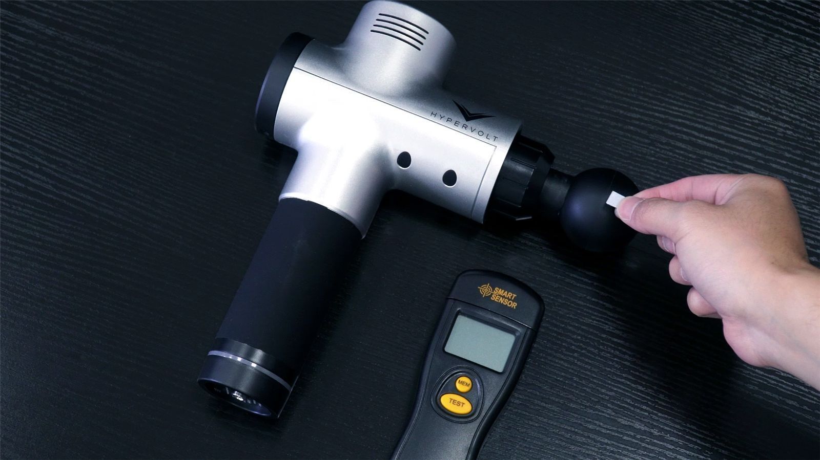 我们在筋膜枪枪头位置贴上了反光贴纸,然后使用转速仪测试筋膜枪在最大档位下的数值。HyperIce、Nurtria、倍益康,这三款的数据相差不大,至于GXA和菠萝君,要明显低一些,每分钟震动次数要少二三百次。