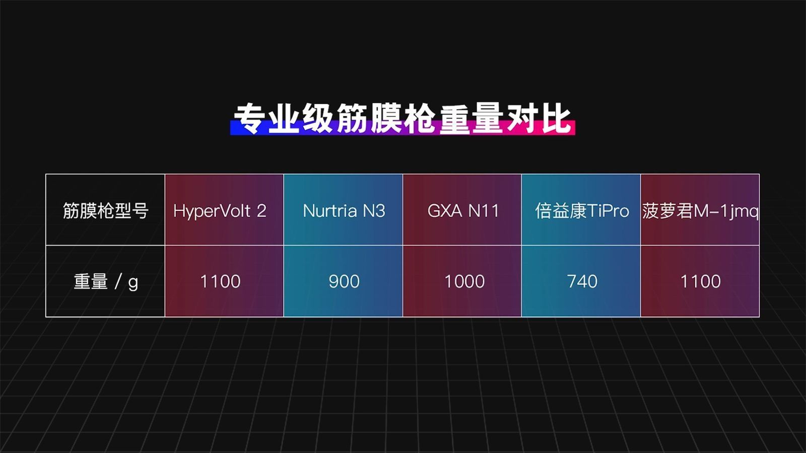 HyperIce、菠萝君、GXA,这三款的重量都在1000g以上,可能肌肉还没放松好手就酸了,如果两个人互相放松是没问题的,但是自己操作的话还是要慎重一些。Nurtria和倍益康的表现则要更好,一个是900g,一个是740g,单手握持更轻松一些。