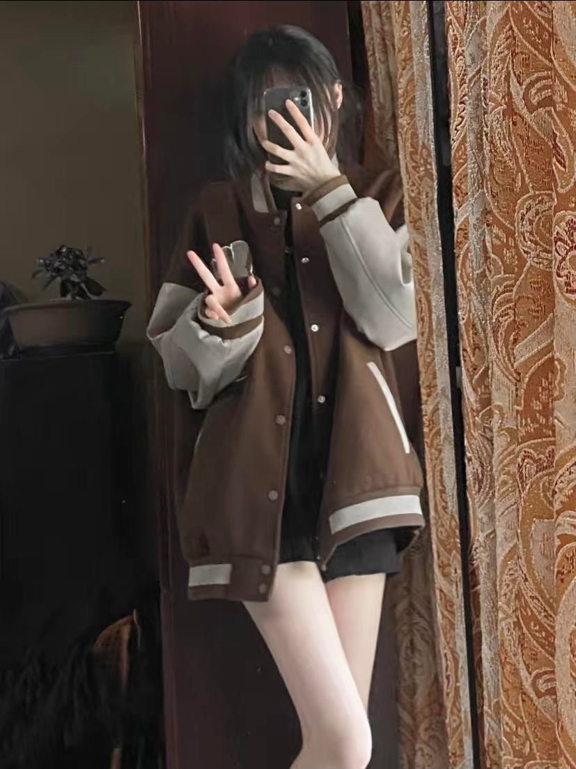 A chock原创美式字母植绒外套潮woo专属男女夹棉加厚夹克棒球服潮 颜色 :棕色 尺码:S M L XL 超宽松版