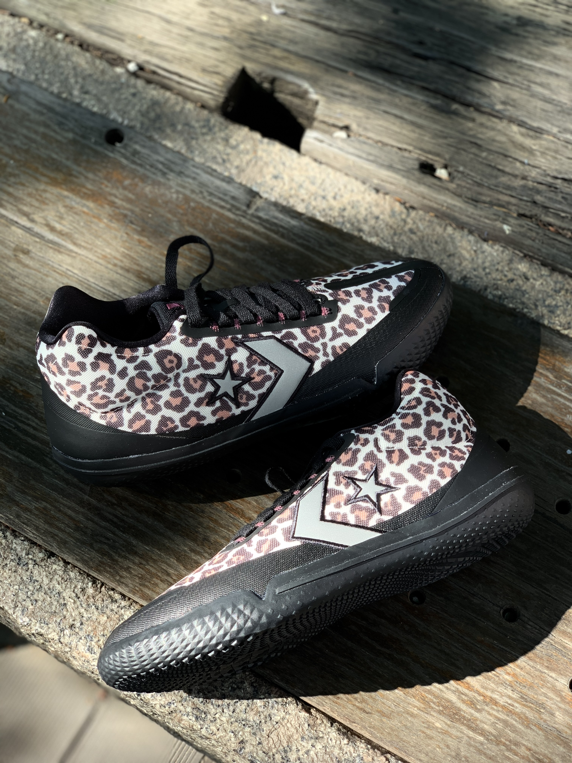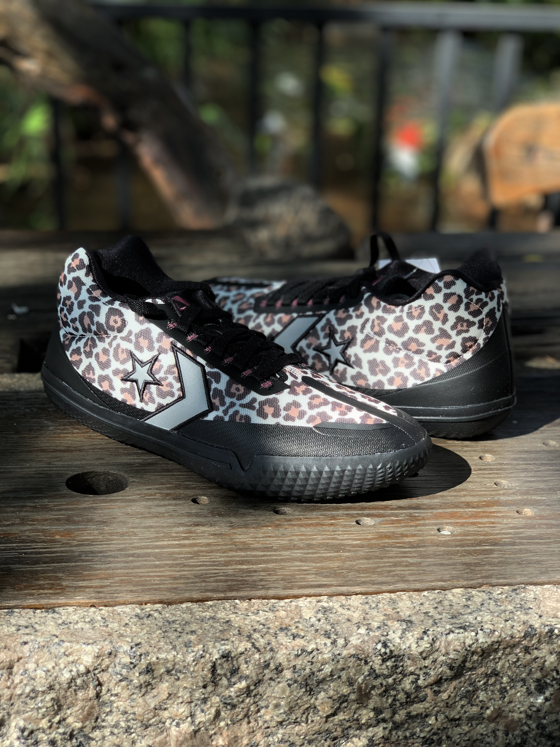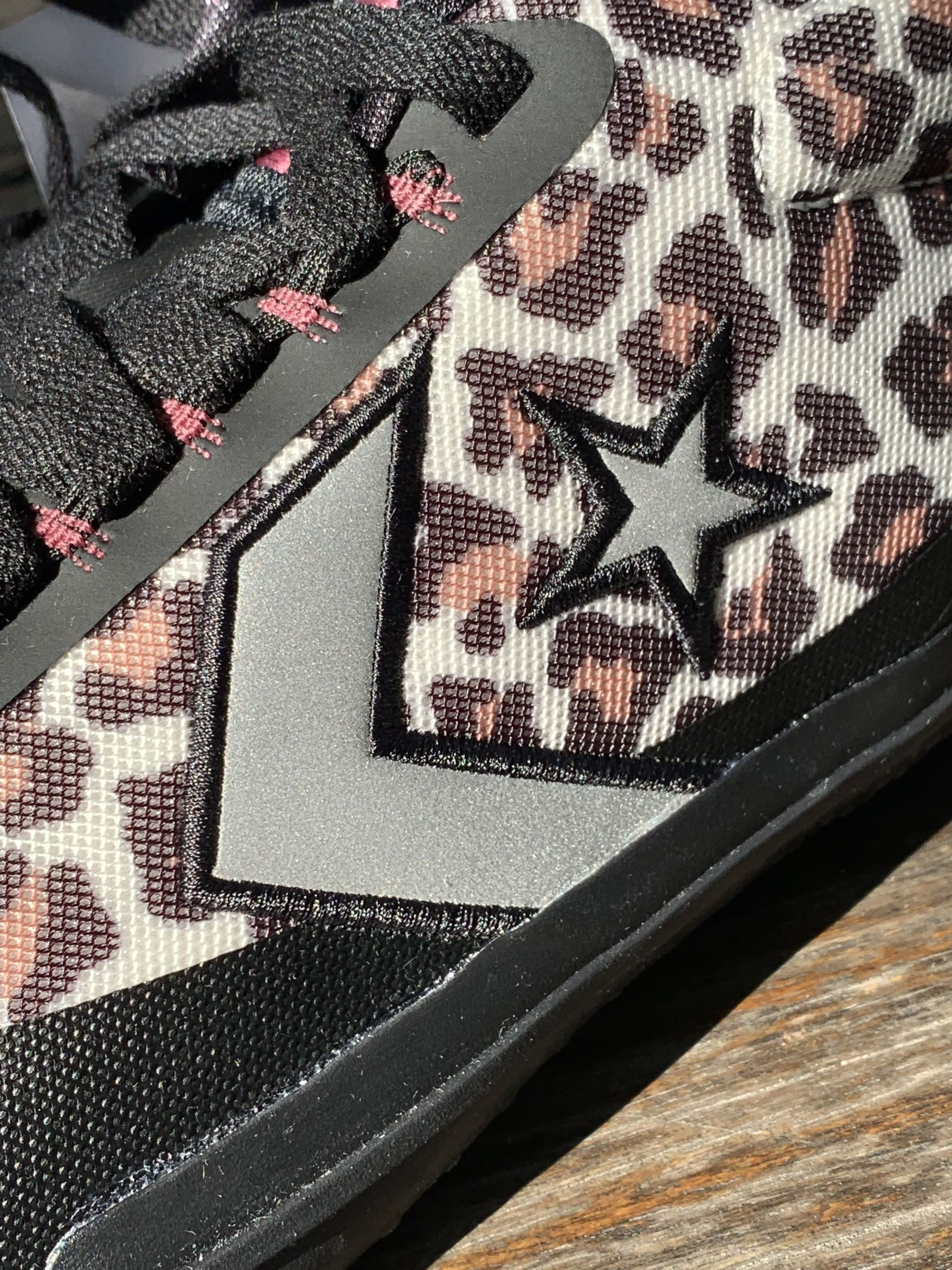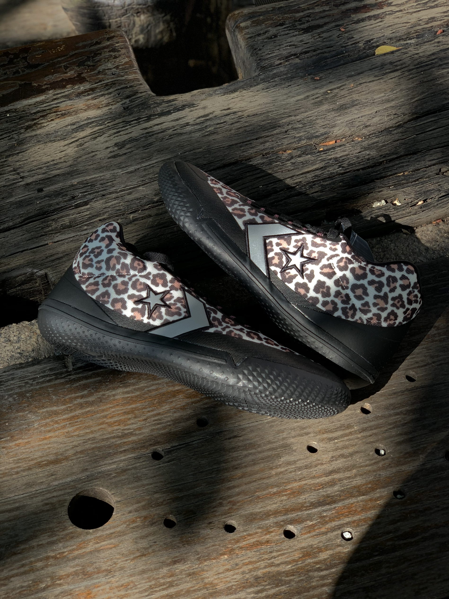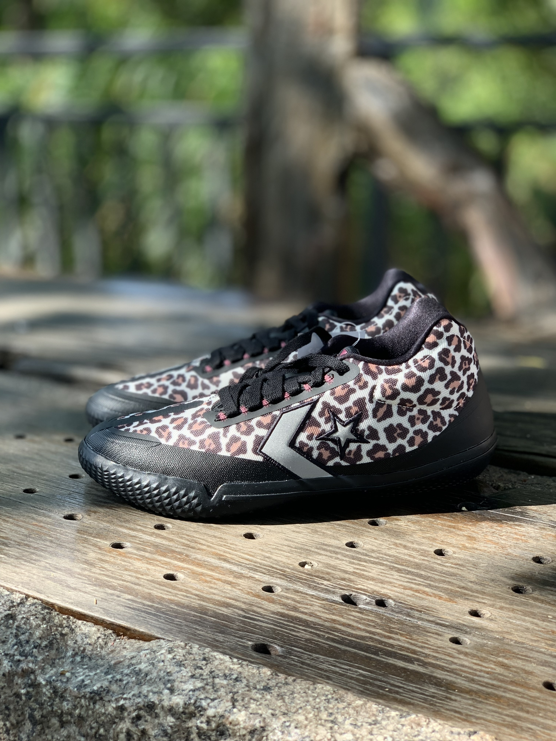 Converse All Star BB EVO 黑棕 豹纹 整双鞋采用了豹纹主题,整体还是挺骚气的; 比其他的配色要耐脏; 鞋身两侧为黑色的热熔胶材质,鞋舌logo用了紫色点缀; 上脚后整体感受很轻,场地感不错;宽脚高脚背慎入!