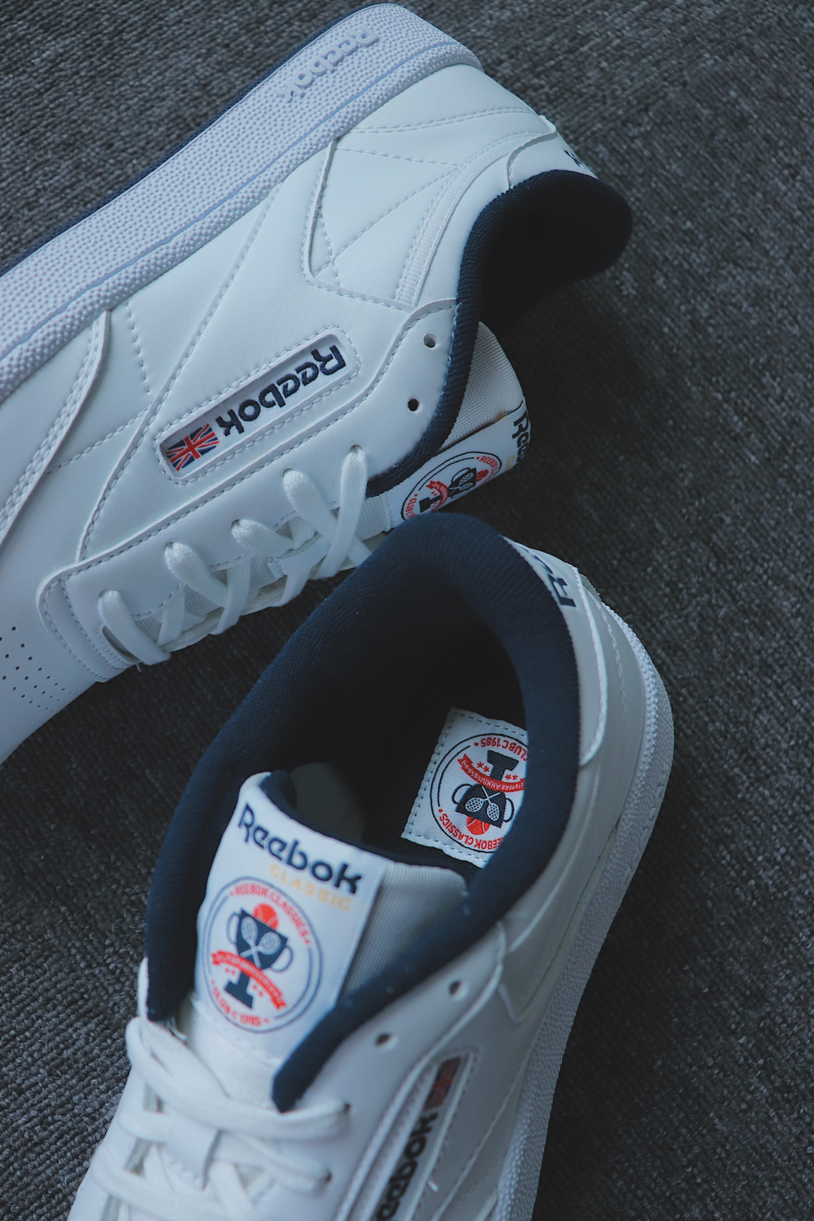 还是锐步那个经典的Reebok Club C 85鞋型,但是这一双比较让人喜欢的就是这个配色的组合,依旧是最干净的白色作为鞋子的主要配色部分,用大底和内衬的深蓝色来呼应,让整个鞋子百搭的同时,又有点不太一样。 ———— ———— 鞋舌以及鞋垫部分有一个由网球🎾、网球拍、奖杯🏆组合而成的特殊设计的logo,或许是网球主题配色的板鞋,待查到相关资料再来补充。 #FX1389[话题]# 捡漏入手...