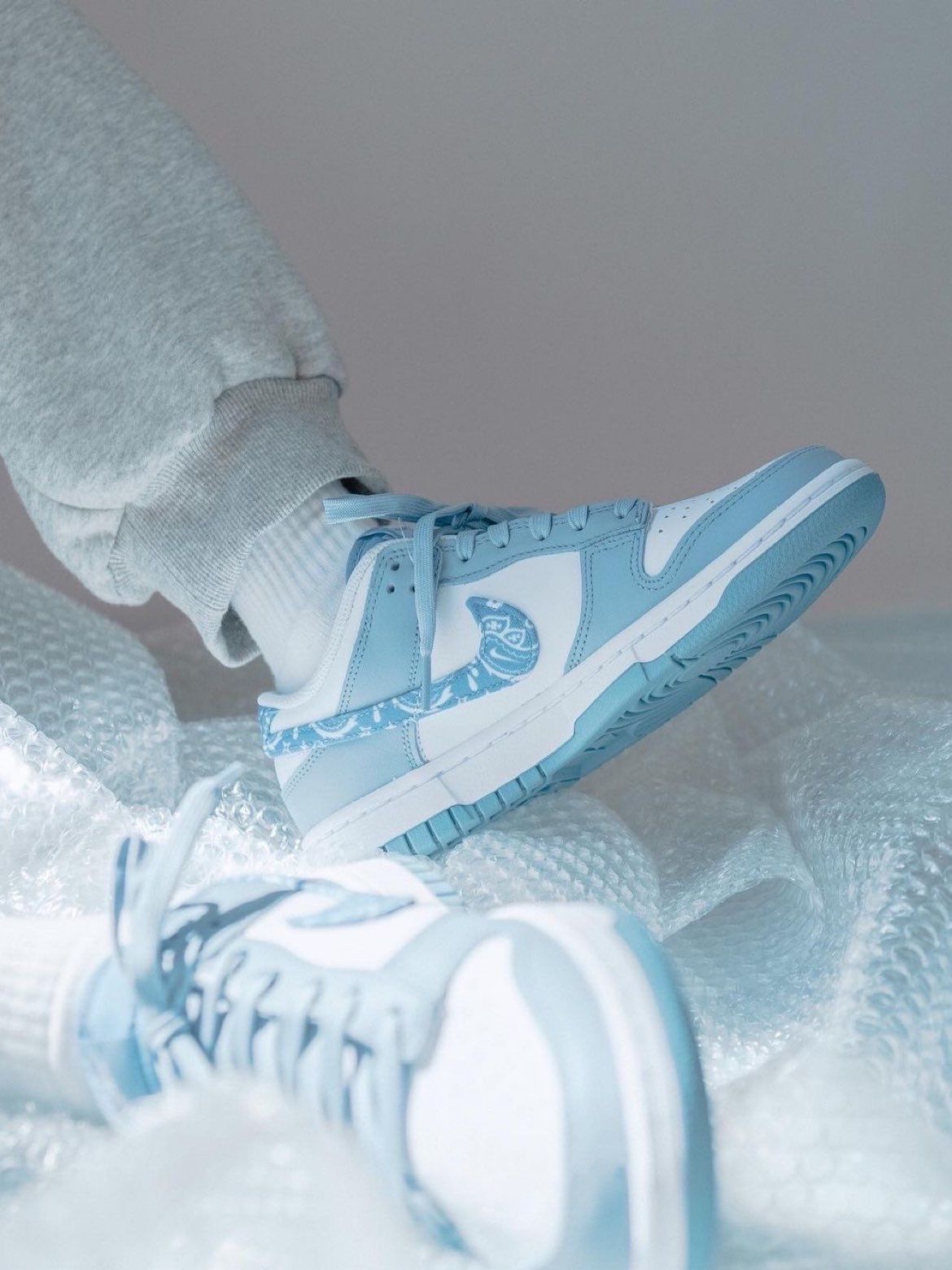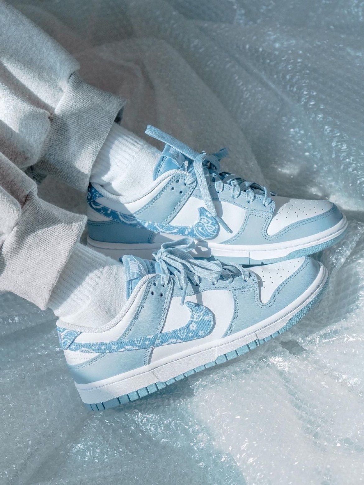 情侣好鞋-Dunk Low 腰果花 👟 Nike Dunk Low "Blue Paisley" 白蓝腰果花 🔶 Paisley---佩斯利,一种由圆点和曲线组成的绚烂纹理,形状如下落的水滴。其名来源于苏格兰西部一个纺织小镇,因大量生产该纹样的披肩闻名。佩斯利花纹细腻、繁复、华美,具有古典主义气息。 🔷 这款 Dunk Low 以经典的白色搭配蓝色拼接呈现,并以皮革材质覆盖鞋身,侧身 Swo...