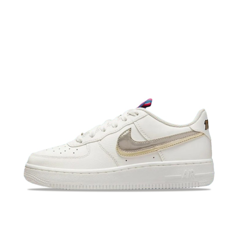 Nike Air Force 1 Low (GS) 休闲板鞋 白金银 鞋身白色大底,优质皮质质感舒适,黑色鞋舌底色搭配金色Nike标志,彩色织带拉环双标logo,鞋带扣左右金银点缀,外侧Swoosh双层金银设计 后跟也带有黑金Nike 标志,白中底搭配橡胶大底 日常校园学生必备!!百搭又好看