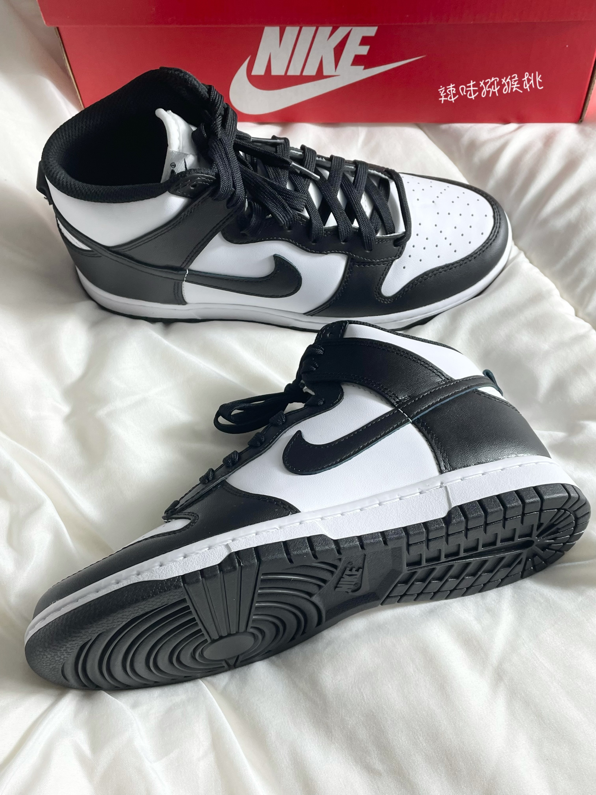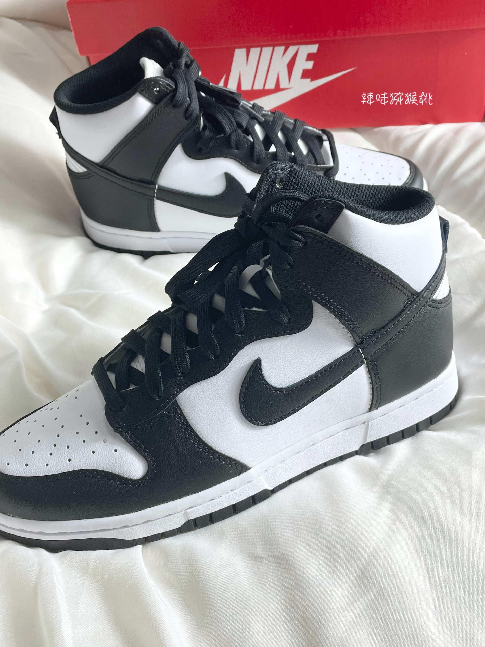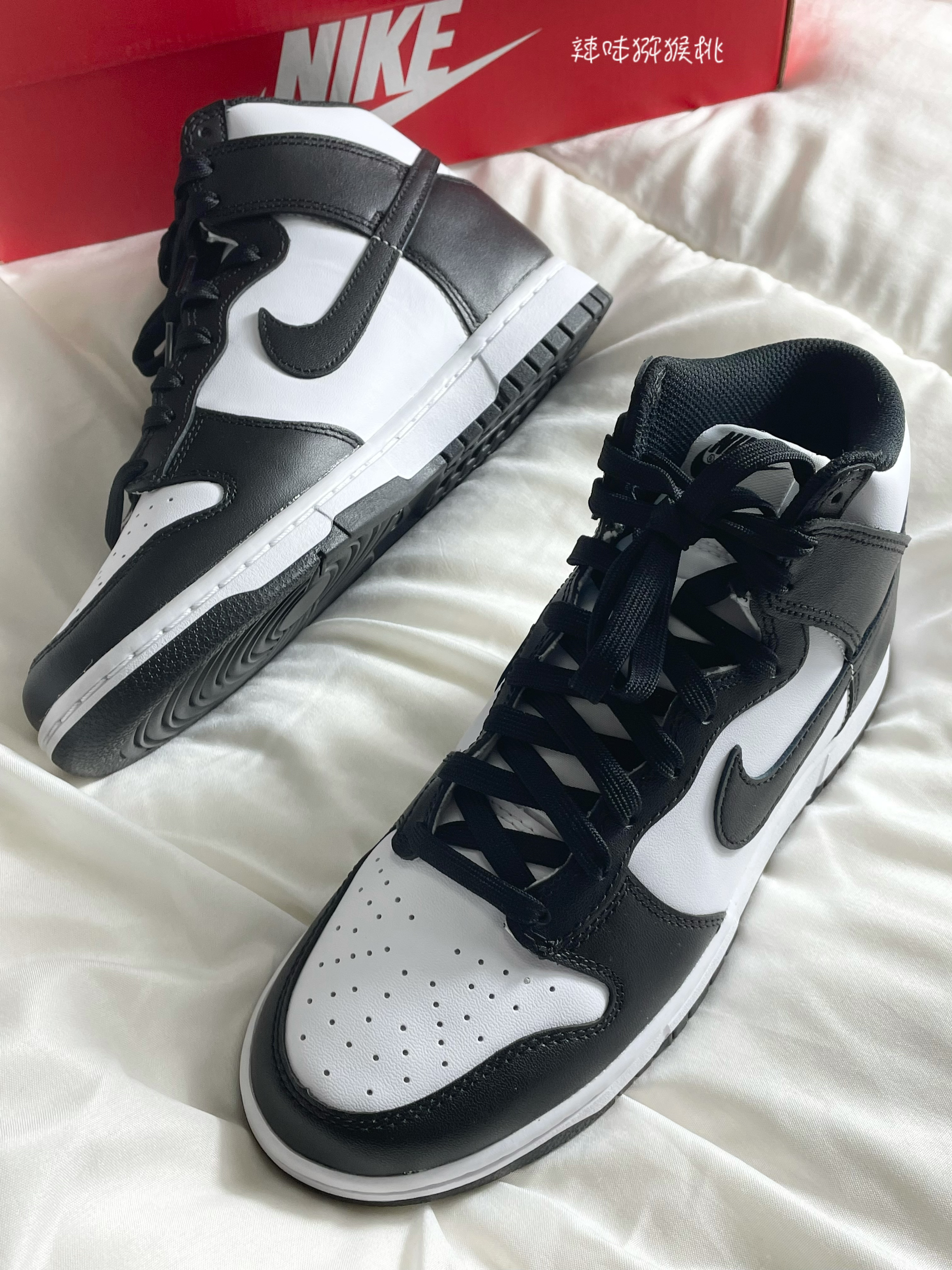 💫:Nike Dunk High Retro熊猫黑标 复古高帮板鞋 黑白 黑白熊猫是真的简约百搭! 鞋子外观配色采用经典的黑白配色,配色方面真的没得说,很好看百搭。鞋面采用皮革材质打造,这个皮革质感还不错,日常也非常好打理。 至于日常搭配,搭配个休闲裤就很好看,特别是女孩子,搭配个黑色休闲裤,真的绝了,是心动的感觉了! 鞋子尺码正常选择!