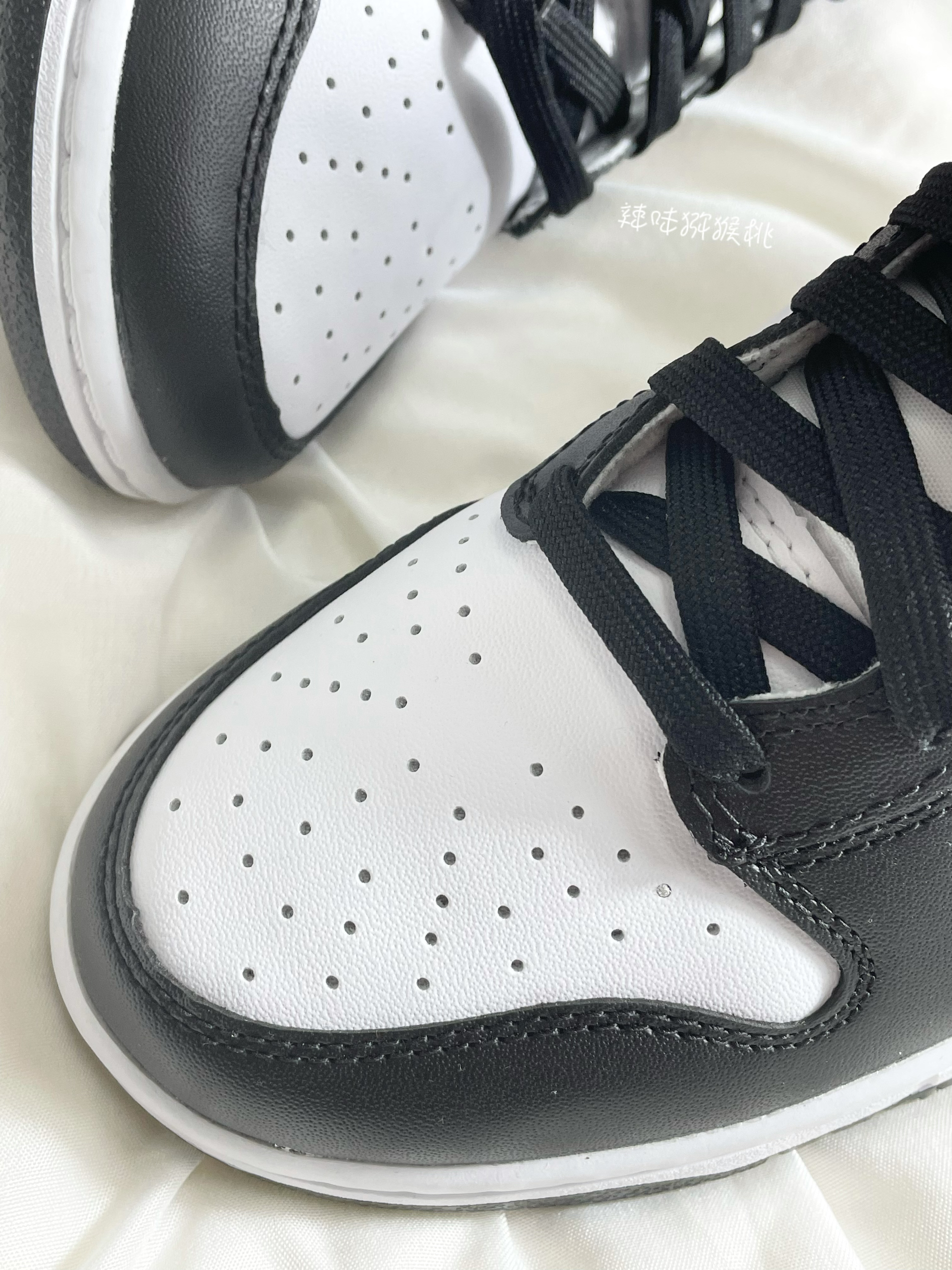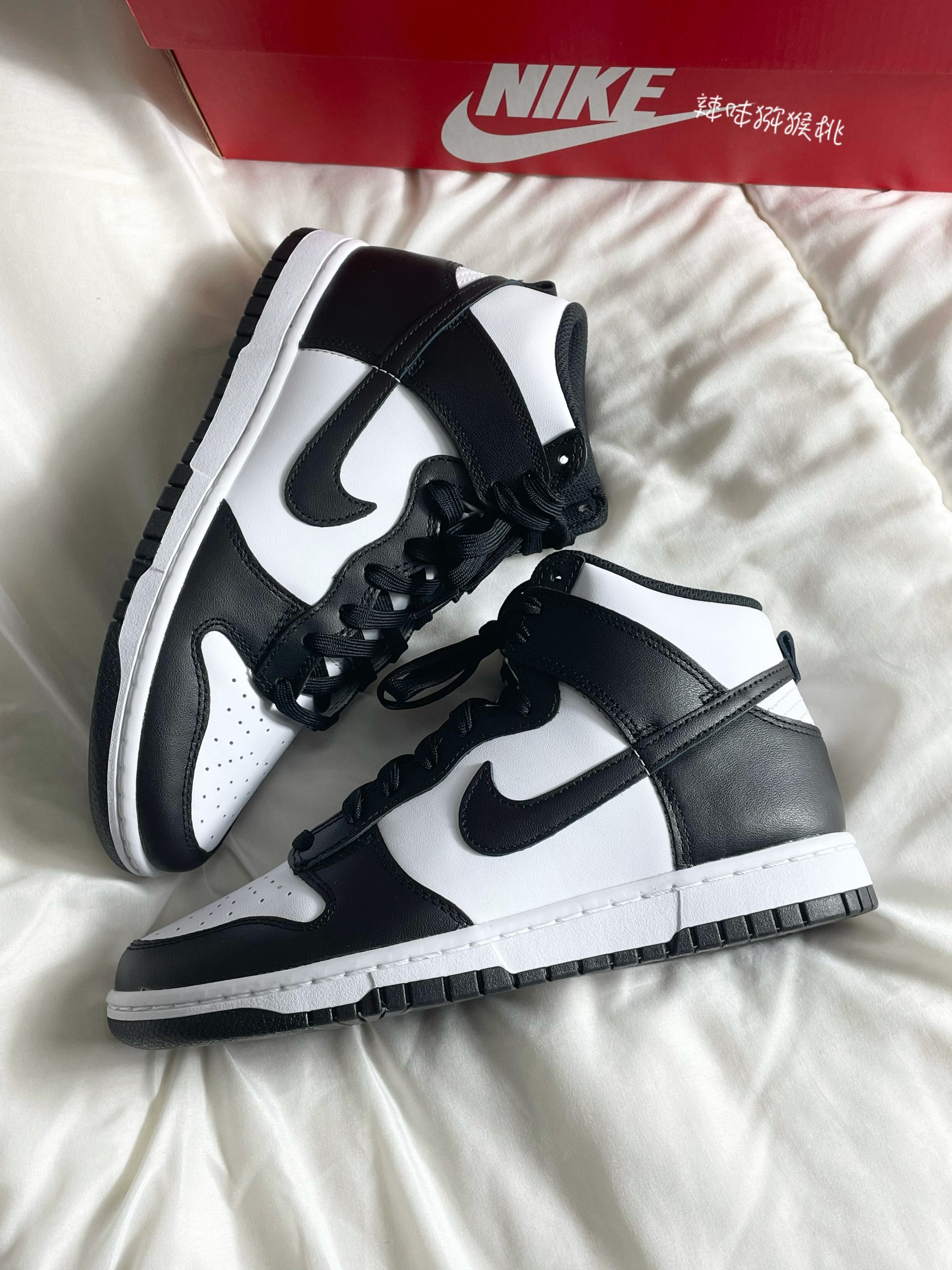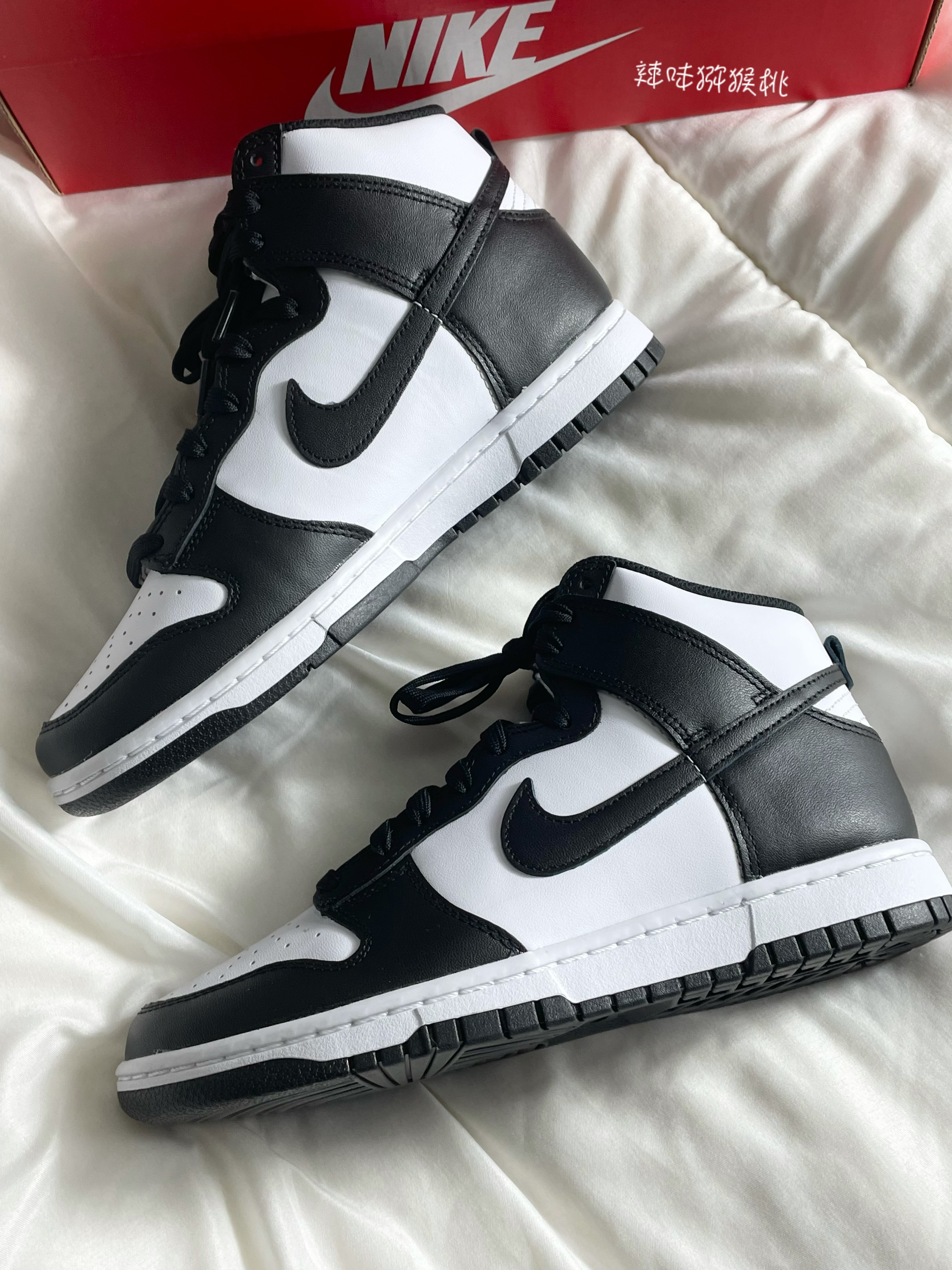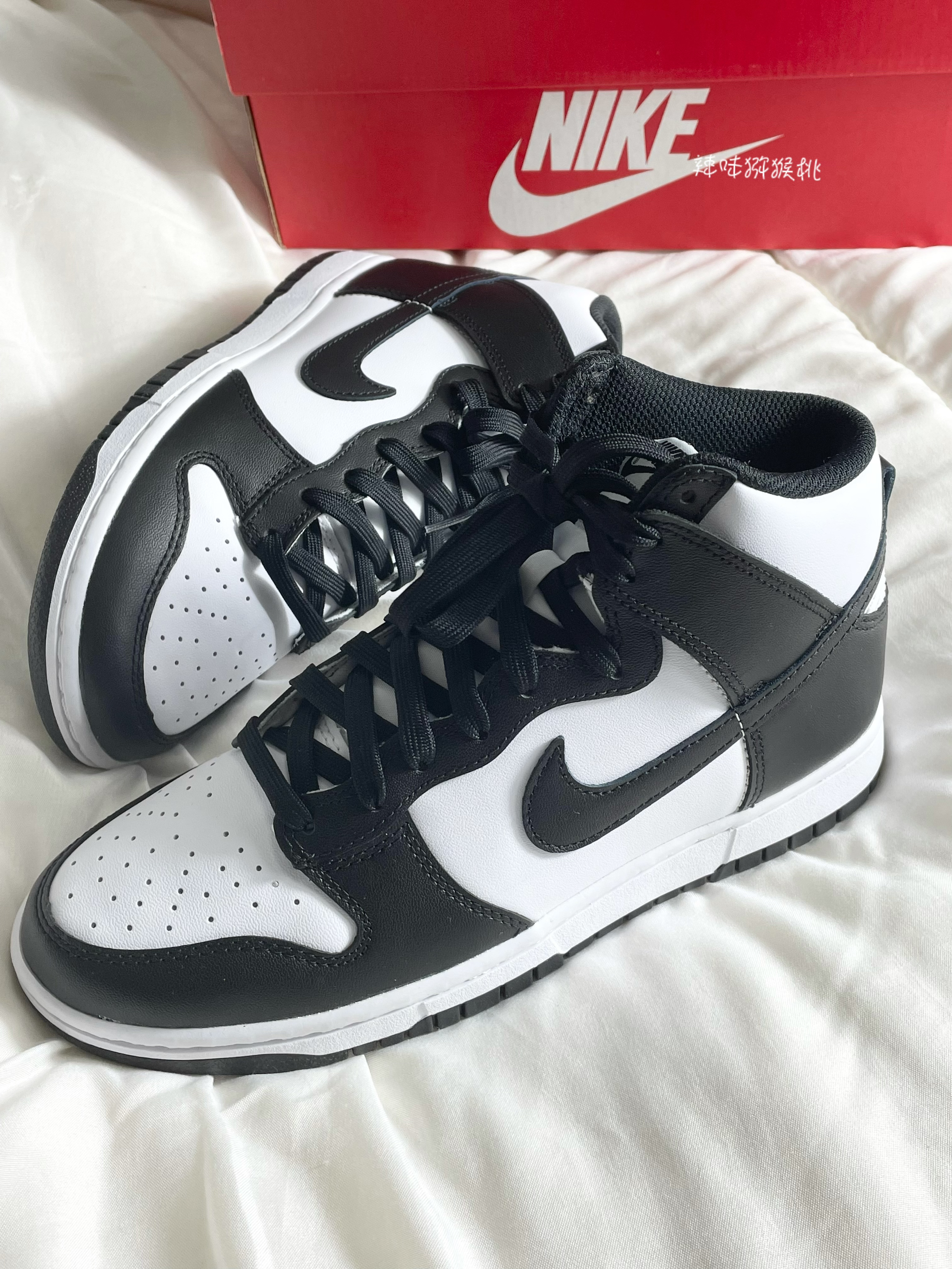 💫:Nike Dunk High Retro熊猫黑标 复古高帮板鞋 黑白 黑白熊猫是真的简约百搭! 鞋子外观配色采用经典的黑白配色,配色方面真的没得说,很好看百搭。鞋面采用皮革材质打造,这个皮革质感还不错,日常也非常好打理。 至于日常搭配,搭配个休闲裤就很好看,特别是女孩子,搭配个黑色休闲裤,真的绝了,是心动的感觉了! 鞋子尺码正常选择!