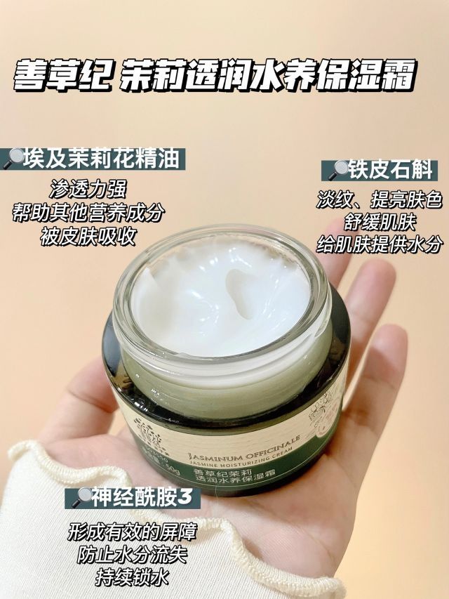 到了这个季节!我的皮肤又开始干起来了 上妆卡粉不说,还会动不动的起皮! 这哪行?赶紧把善草纪茉莉面霜安排上了 - 质地QQ弹弹的!好像果冻! 上脸的肤感真滴很赞!不厚重!好推开~ 一抹划水~太滋润了! 完全不会有厚重、油腻感👍🏻 稍微按摩一下就都吸收了 用完皮肤水水润润的! 上妆前我也会用来厚涂一下 后续就不会有卡粉现象了 - 它主打植物精油护肤 闻起来有一股淡淡的茉莉花香~很上头! 里面成分有埃...