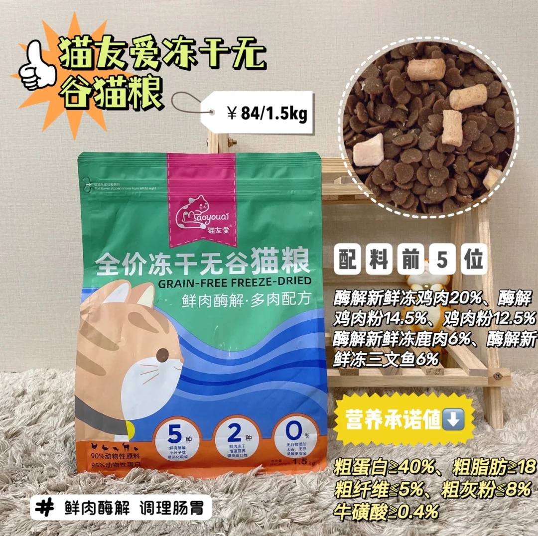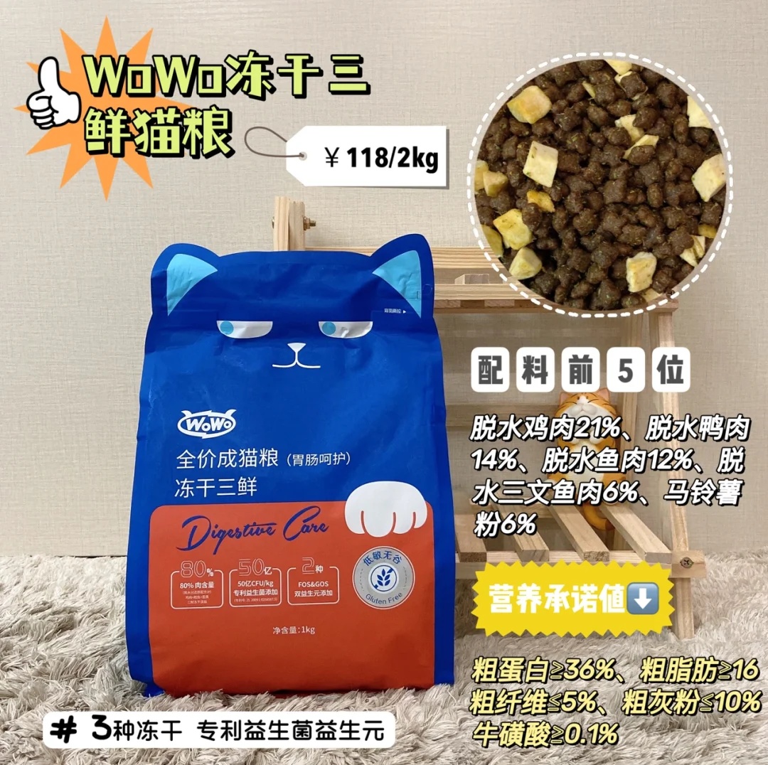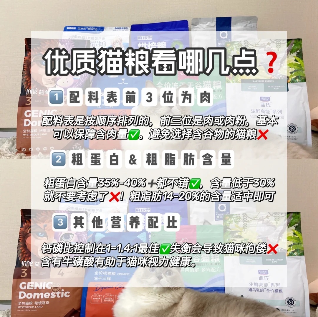 选择一款合适的猫粮可以让猫咪更好的发育成长!那好的猫粮到底应该怎么选呢?重点都列在图2️⃣啦!以下7款猫粮都是挑选出来性价非常高的,可以根据自家猫咪的营养需求来选择对应猫粮~ WoWo猫粮--💰27/斤(梅花颗粒、3种冻干) 配方表前几位都是脱水肉,粗蛋白含量36%,能够满足猫咪营养所需,添加鳕鱼、鸡肉、蛋黄三种冻干,每一颗粮上面都包裹了肉碎和海苔碎,适口性真的没话说,再挑嘴的猫主子也爱吃!5...