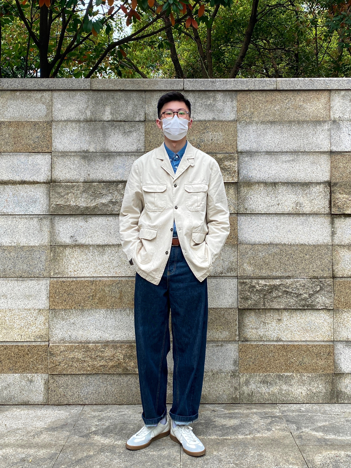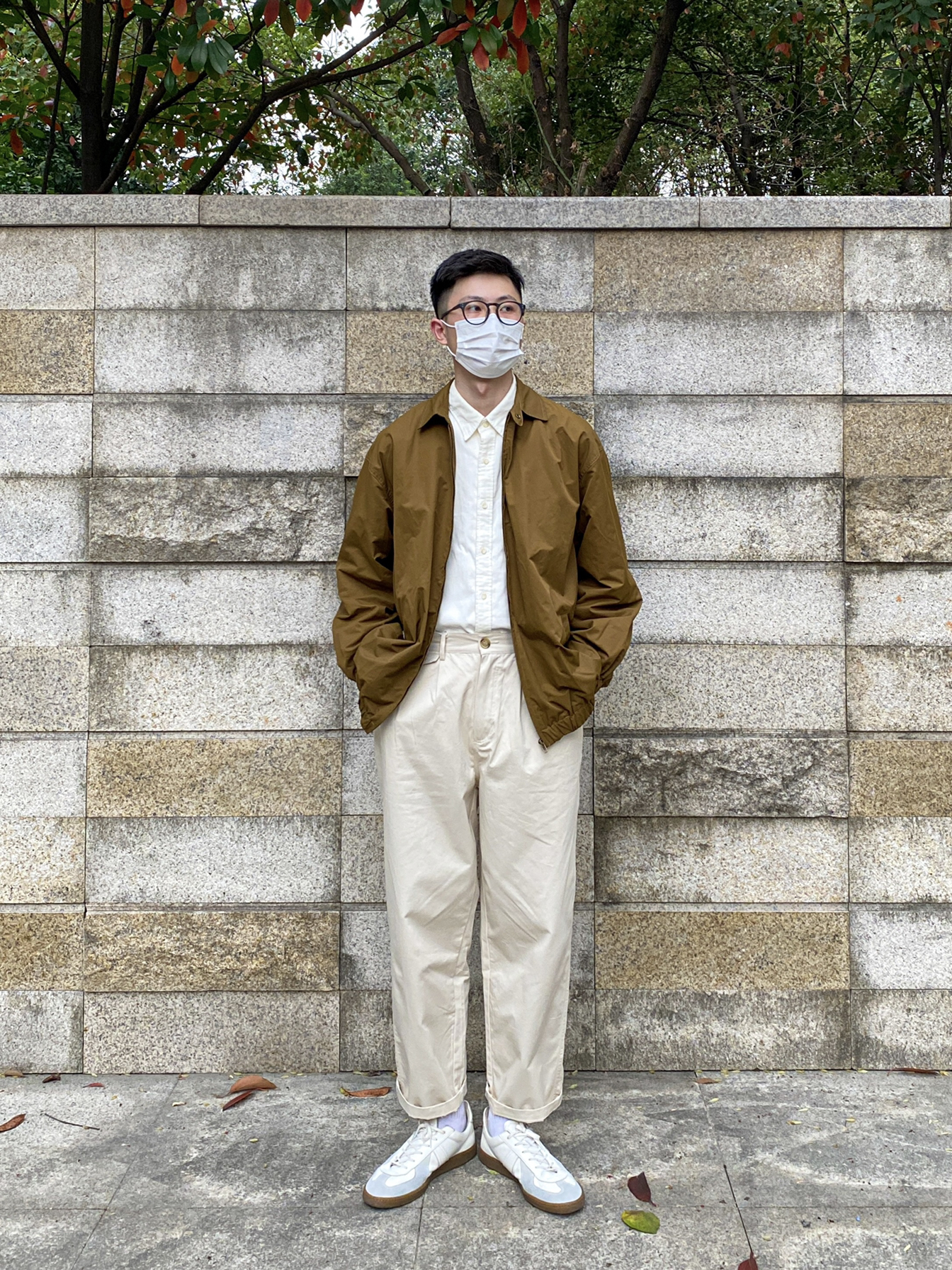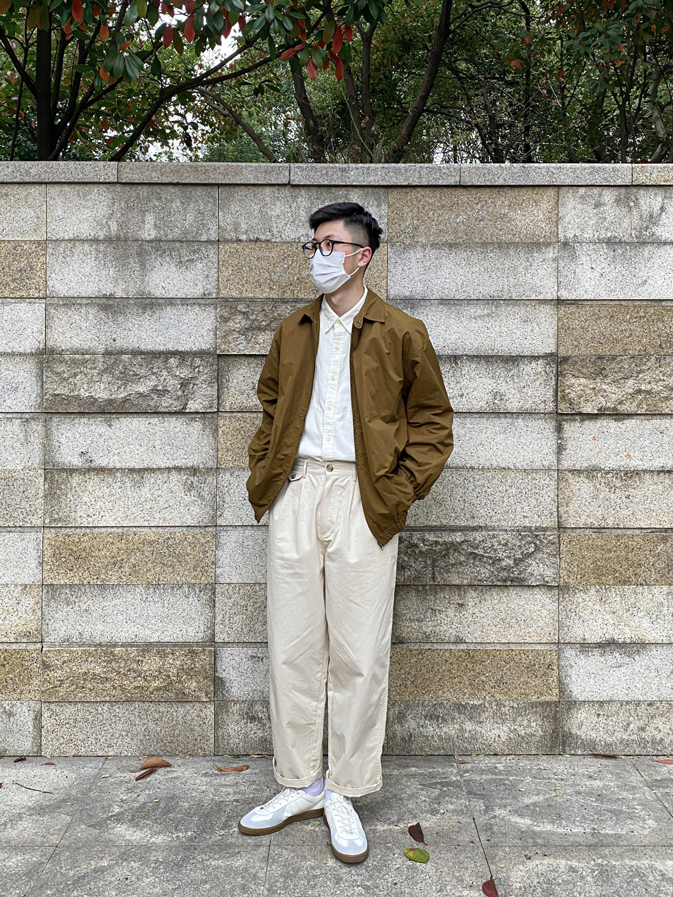 单品信息 🧥外套:Onun 一件复古打底色的廓形夹克外套,上身利落有型。 - 👔衬衫:uniqlo 灯芯绒衬衫 白色衬衫衣柜必备的一件乐,内里云搭配,外穿都可。 - 👖裤子:Onun 上身非常利落有型,直筒微锥的版型,修饰腿型。米白的颜色非常适合春夏季,且百搭。 - 👟鞋子:NVGS德训鞋#
