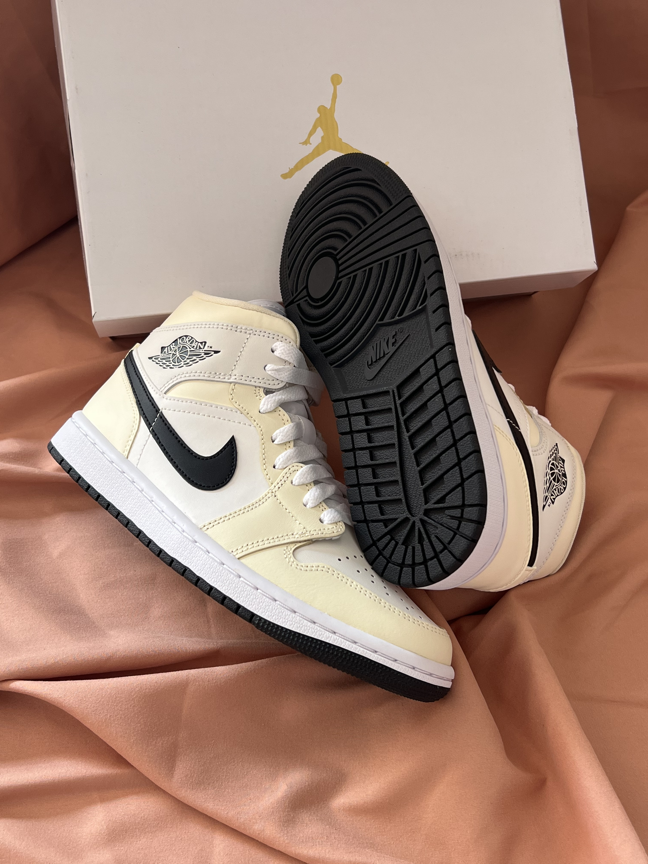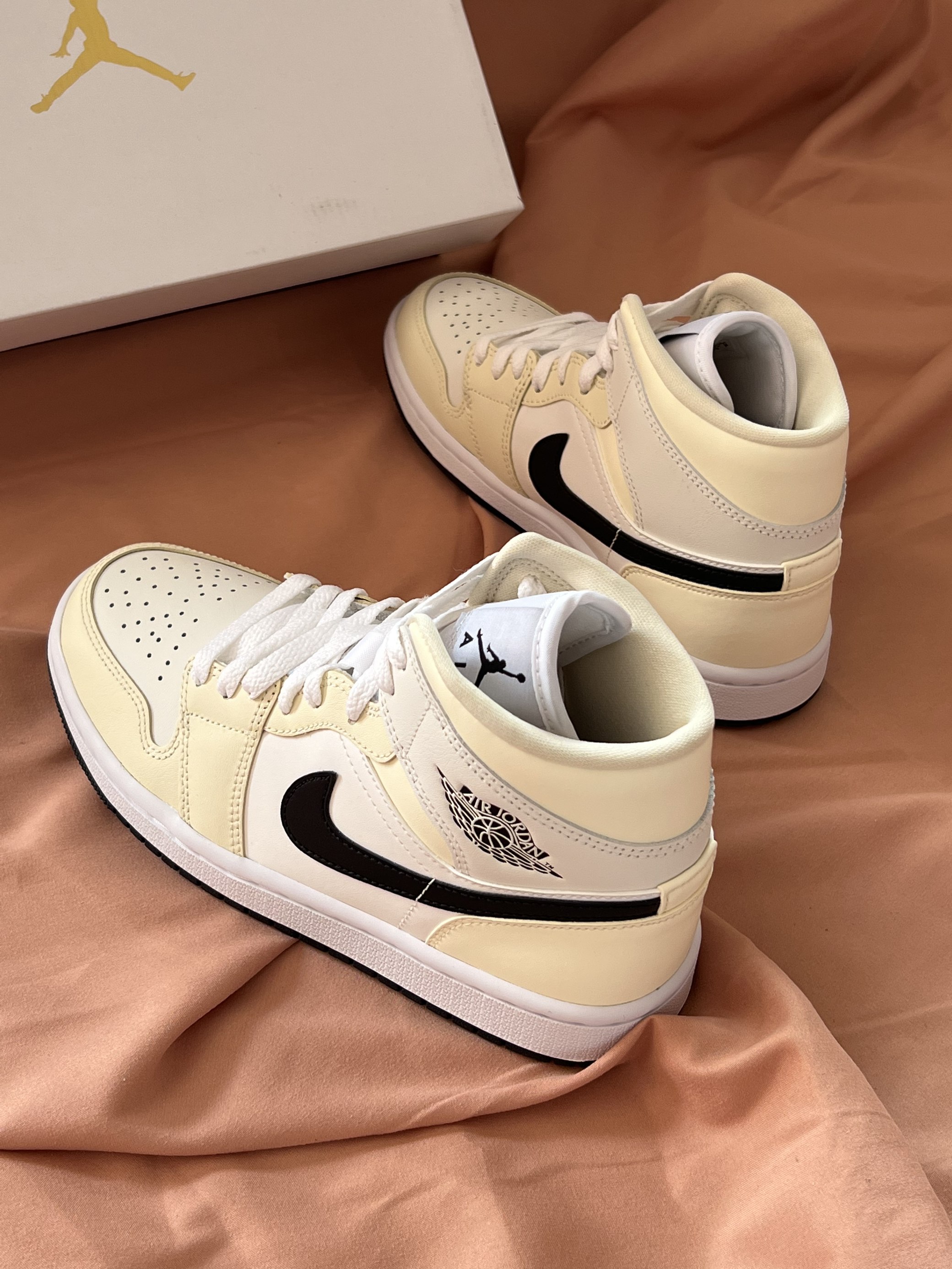 🍂球鞋名称 Air Jordan 1 Mid "coconut Mik" 复古篮球鞋 女款 奶白色 椰奶 🍂球鞋外观和配色 鞋子主要采用白色,淡黄色和黑色 鞋面,鞋舌,鞋带,鞋侧和鞋底侧方为白色,鞋侧swoosh,鞋后跟侧方的飞翼logo和鞋底为黑色,其余部分都是淡黄色 这种淡黄色看起来非常柔和,不会显得非常突兀,鞋舌上还有个飞人的logo 🍂球鞋如何搭配 鞋子搭配一些宽松点的衣服,卫裤,直...