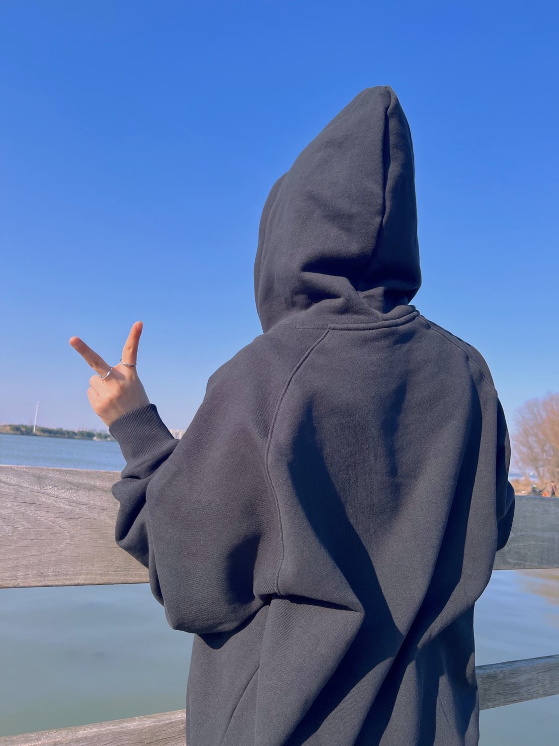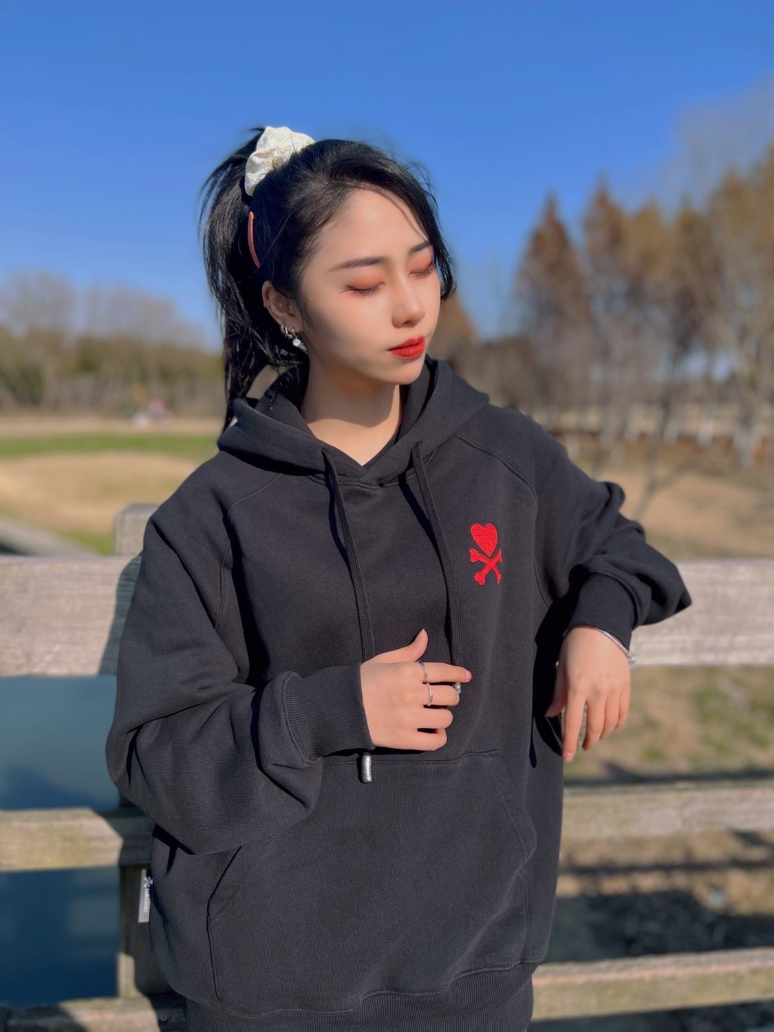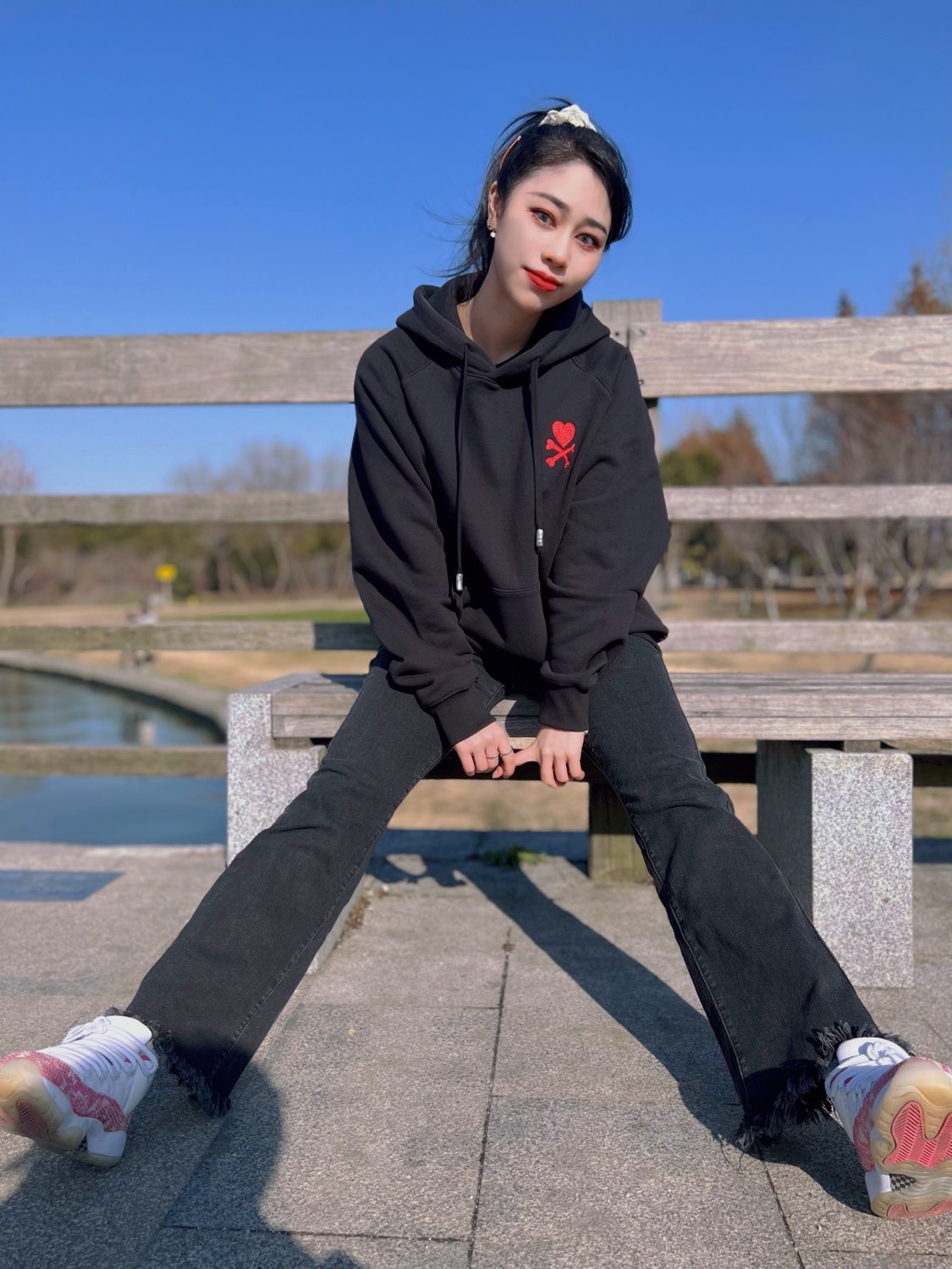当然要出来晒太阳啦!在这刚入春的时候,天气还是微微冷的,但是太阳浴就是非常暖和啦~今天出门也是一身黑的简约风~ :Tokidoki爱心交叉骨系列 宽松连帽卫衣 宽松的连帽#爱心交叉骨卫衣虽然是毛圈内里但是非常厚实!#艺术潮服保暖性很好!纯棉但透气,材质紧实让人很有安全感呢! 👖:直筒喇叭裤 :AJ11 粉蛇