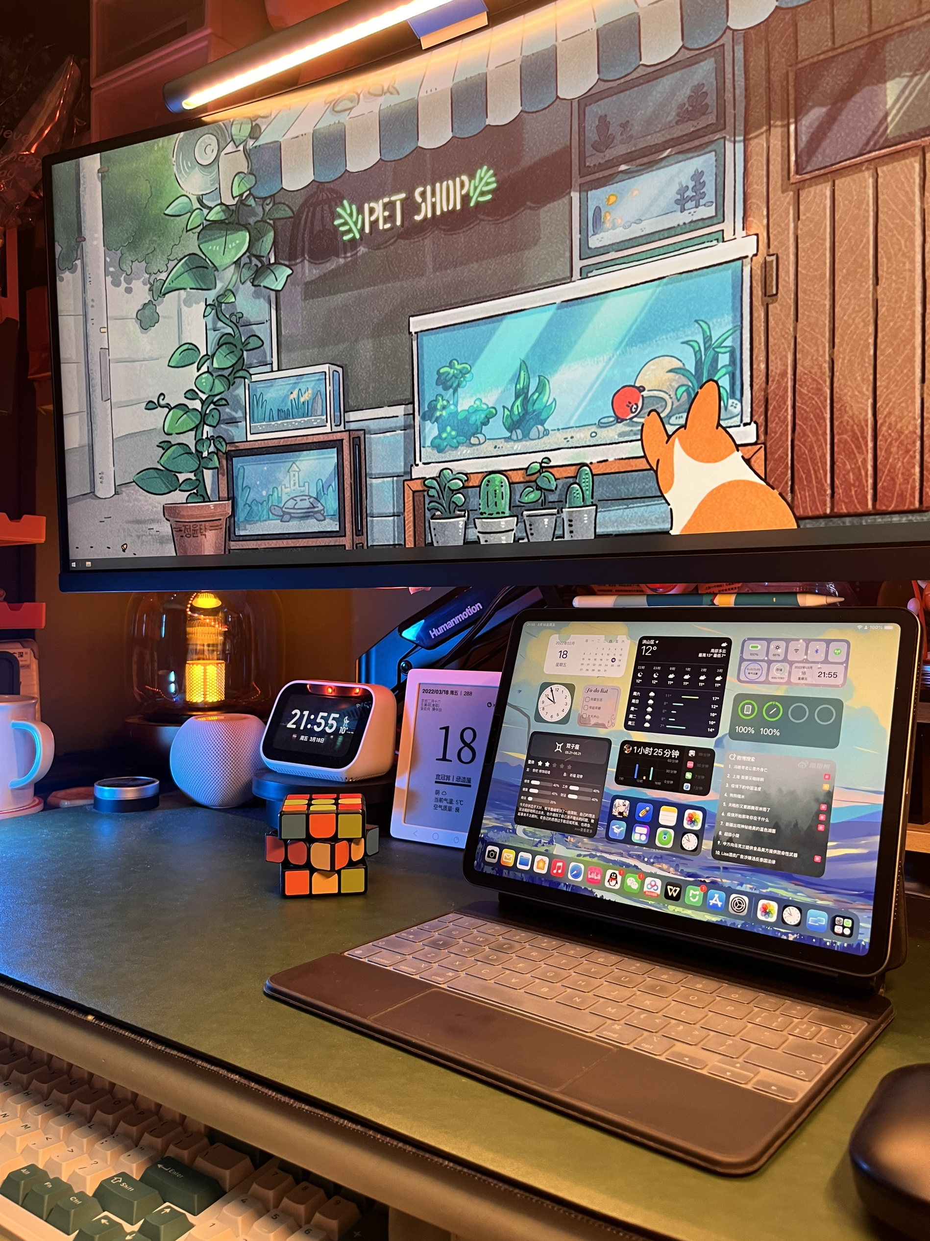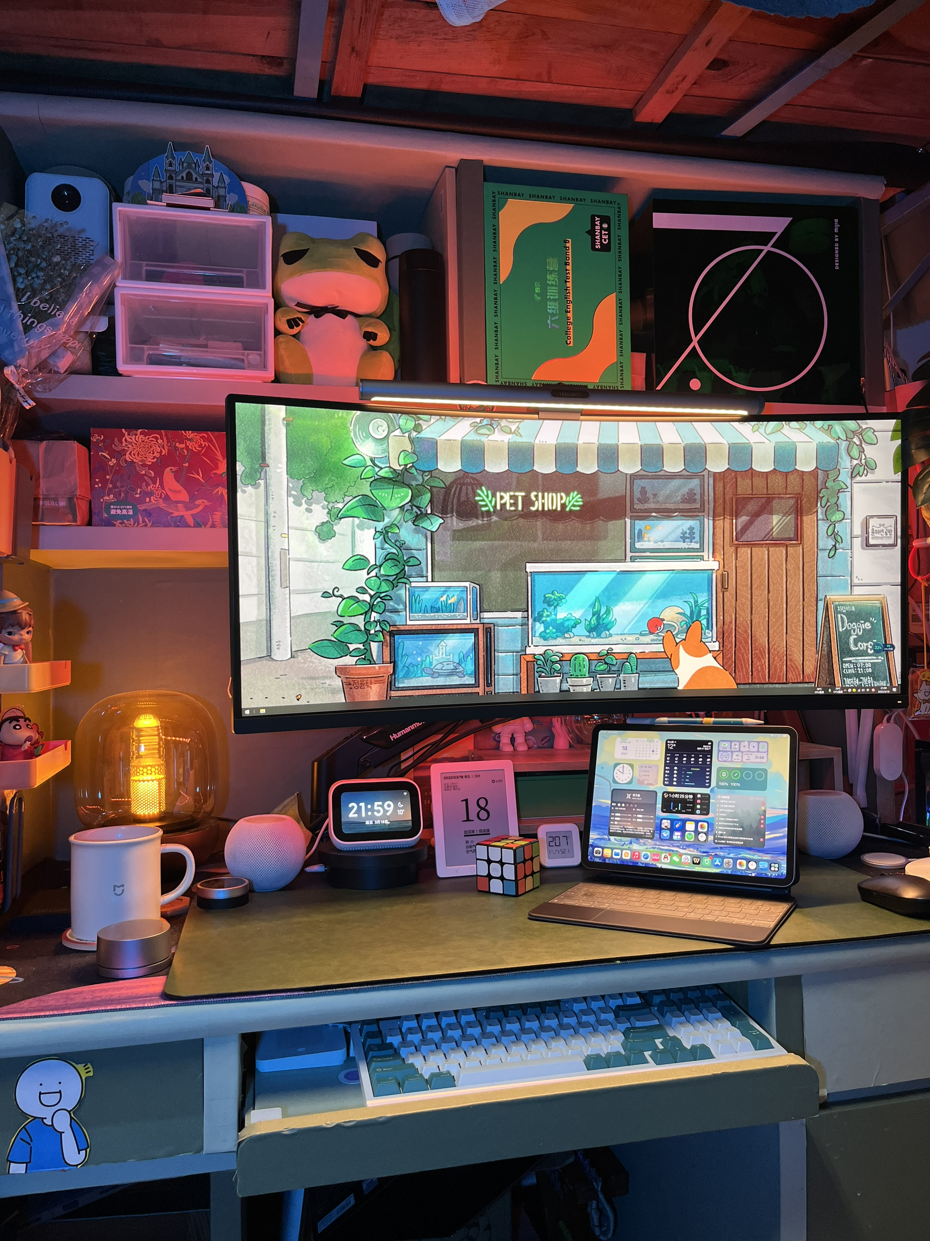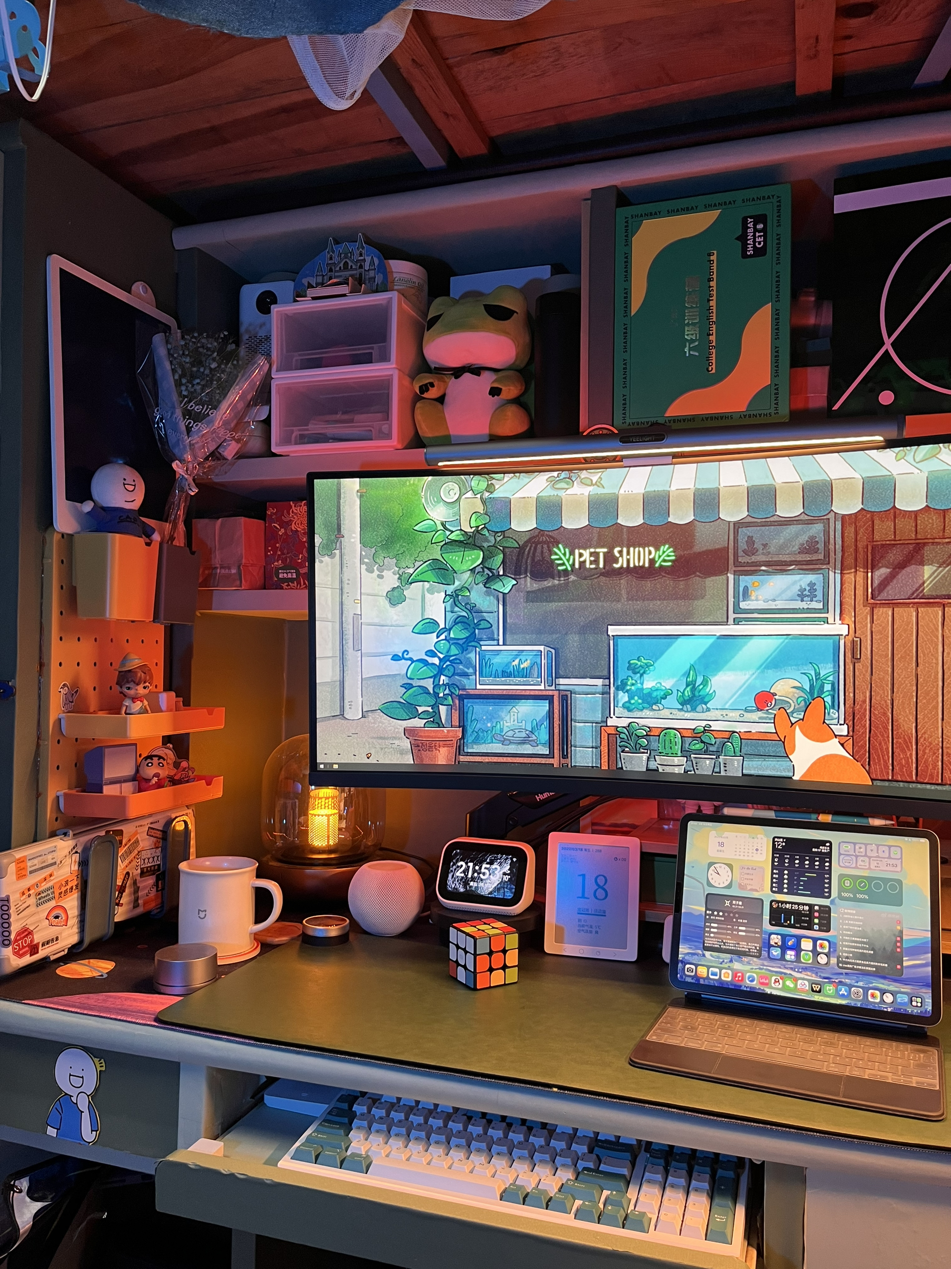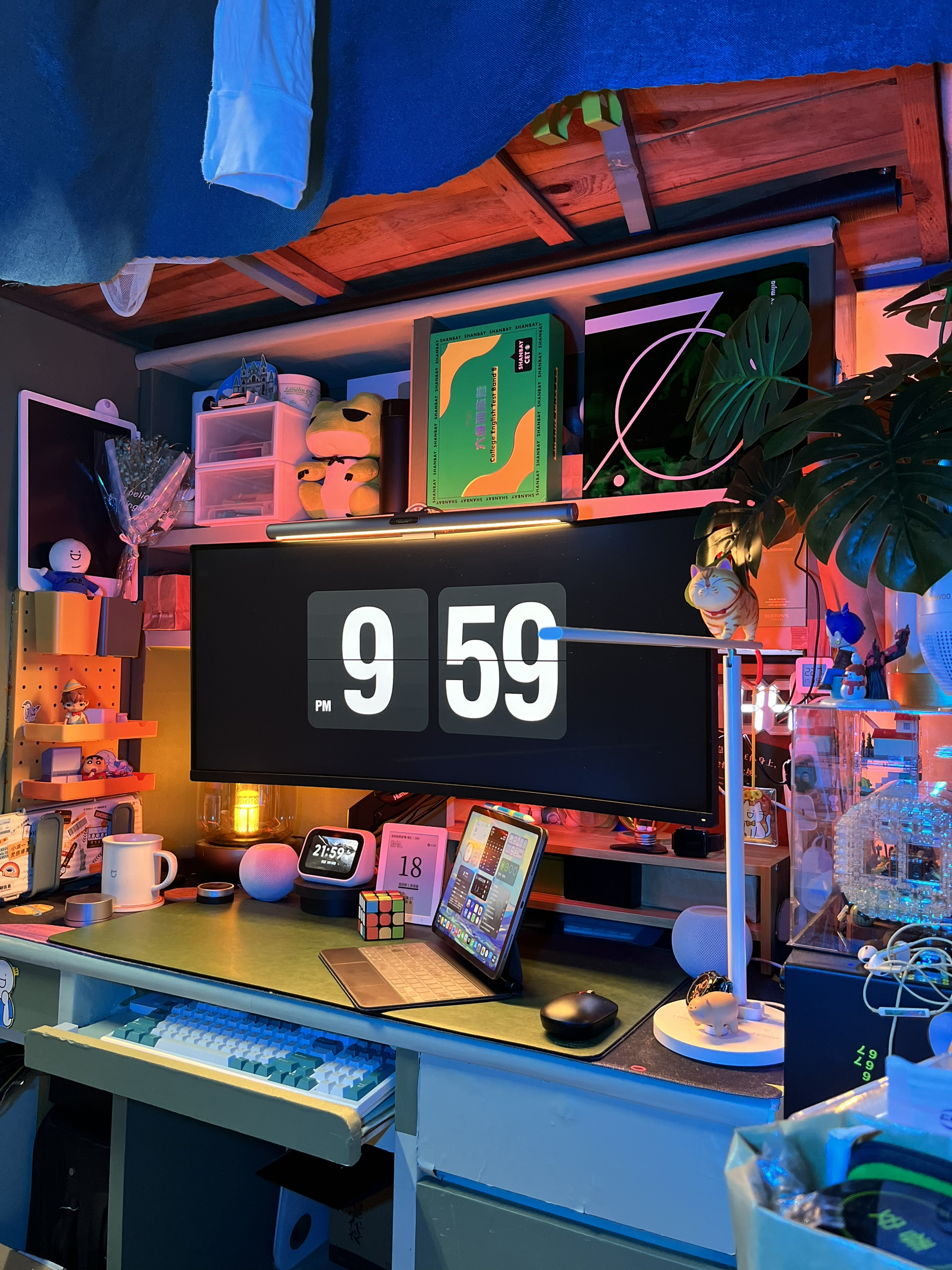 因为用了很多智能设备,所以宿舍看起来杂乱,但实际上还是因为我东西太多了……不知道大家有什么好的建议 🛏️最近打算买个滑轨重新装一下床帘,把床上也改成智能化,全屋智能宿舍太得劲了,武汉最近一直阴雨连绵,要不是要去导师公司实习我真想一直呆在宿舍了🙋♂️ 桌搭清单📝 电脑:黑苹果MAC双系统 音箱:HomePodmini 氛围灯:vfz拾音灯、米 典氛围灯、易来灯带 桌面无线充:苹...