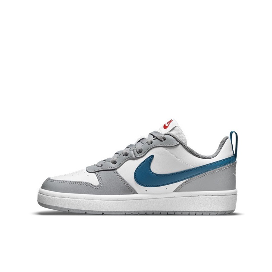 Nike Court Borough 2 (GS) 休闲板鞋 灰白蓝 小Dior 推荐一款最适合学生党开学季穿搭的鞋子,价格合适,百搭好看!!Court低帮版型,鞋身采用灰白色打底,灰色的鞋框和白色鞋面,清新干净,鞋舌红色Nike印字,后跟处是白色logo设计,外侧Swoosh采用蓝色点缀,很有复古感,后跟还带有鞋提方便提拉,白色中底搭配蓝色橡胶大底,互相呼应的小细节,日常穿搭神器!!