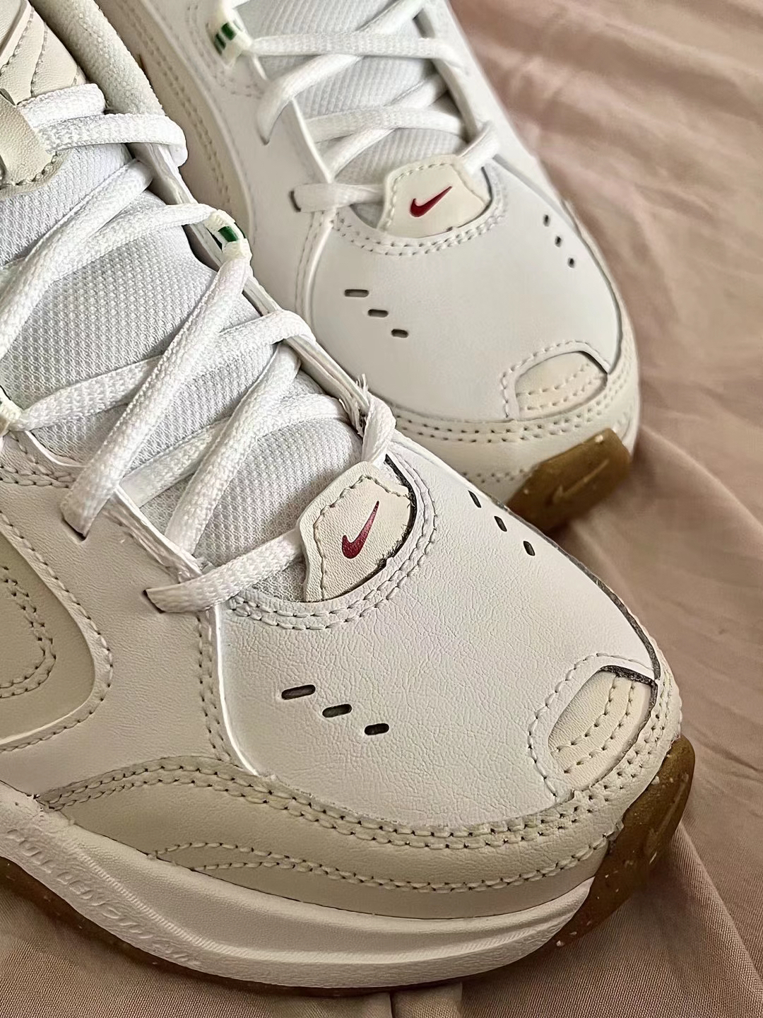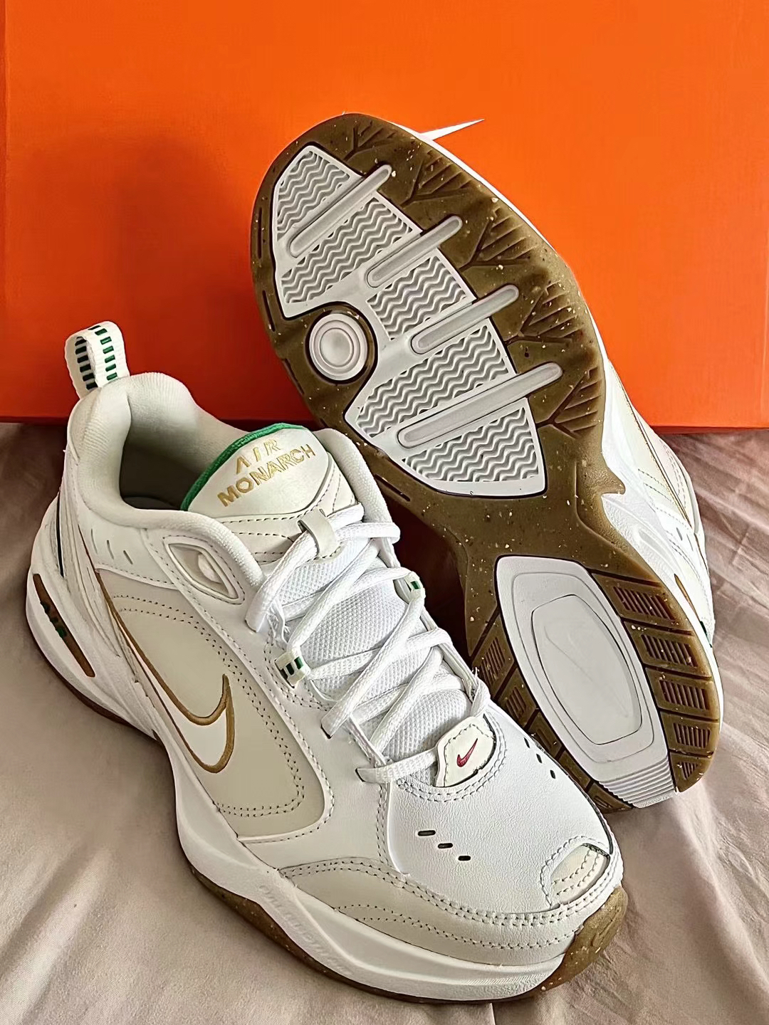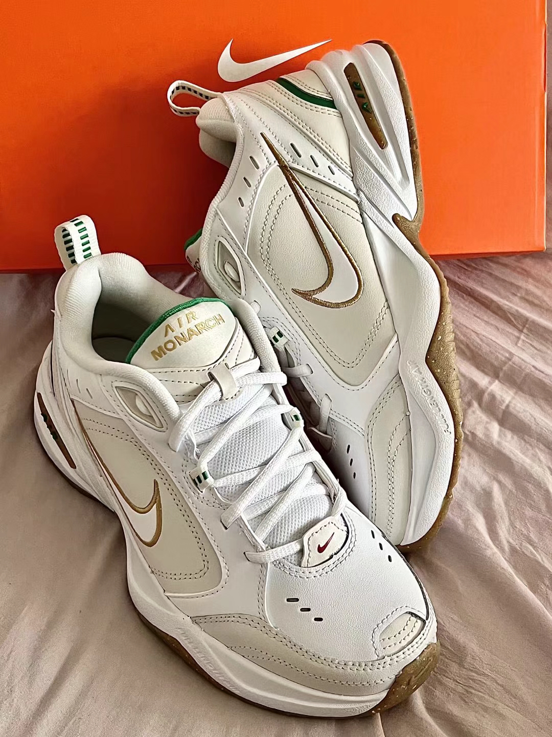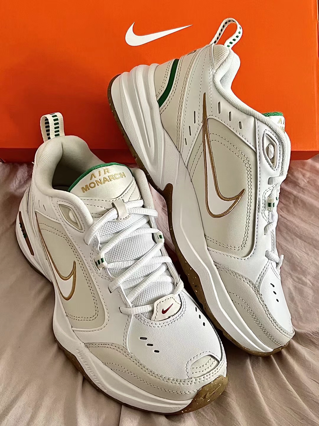 👟鞋款名称 Nike Air Monarch 4 米白 鞋子整体采用了米白色,棕色和绿色点缀鞋身,鞋头处红色迷你的Nike Logo很有个性,鞋舌处有着金色的“Air Monarch” 字样,后跟鞋提部位采用了白绿色,合成革 皮革和织物材质的鞋面比较好打理,Phylon材质的中底,轻便软弹 自带增高的效果,一直得以小姐姐的喜欢,实物上脚一点儿不显着笨重!四季百搭舒适款 鞋码推荐:正常码数