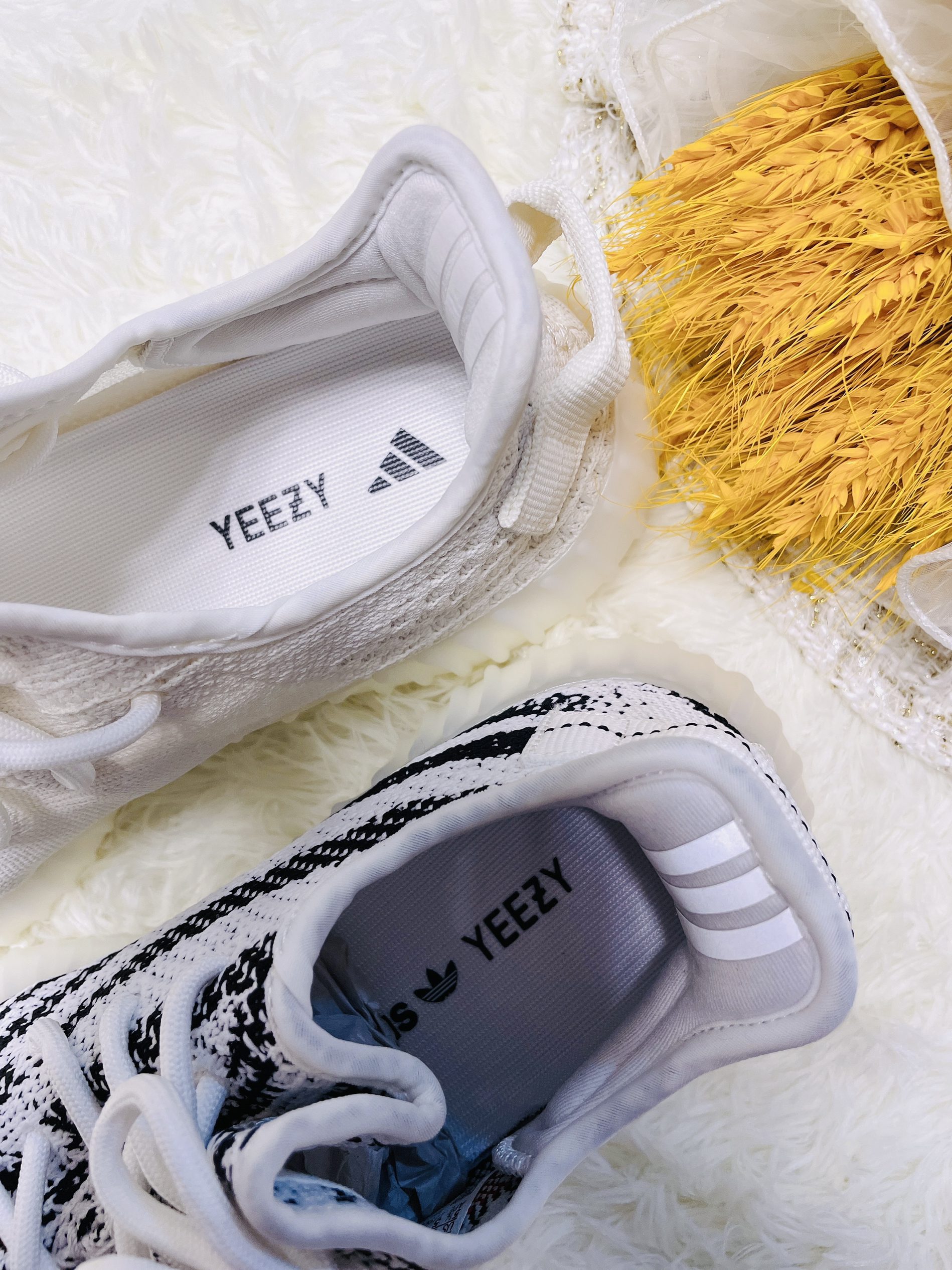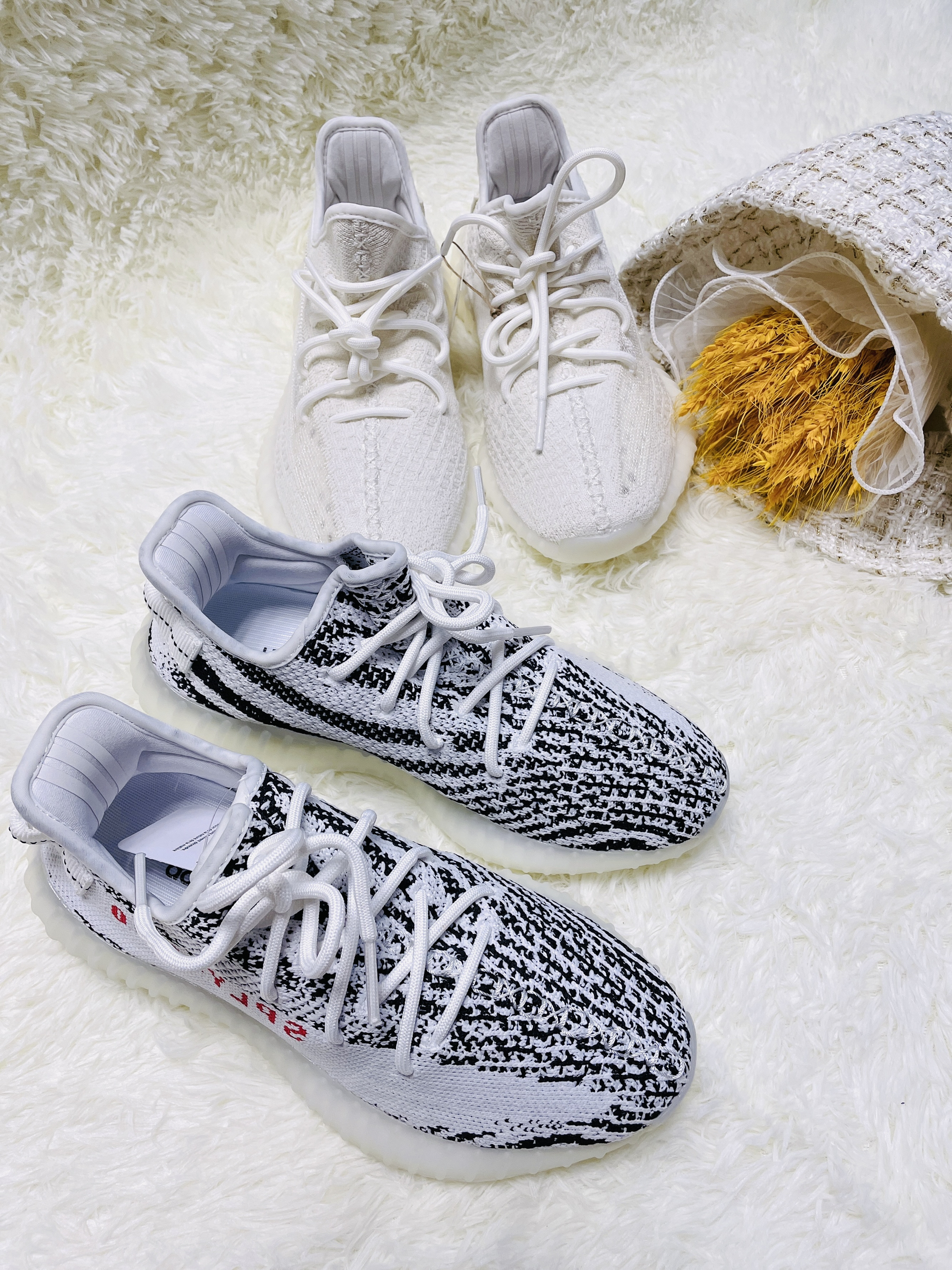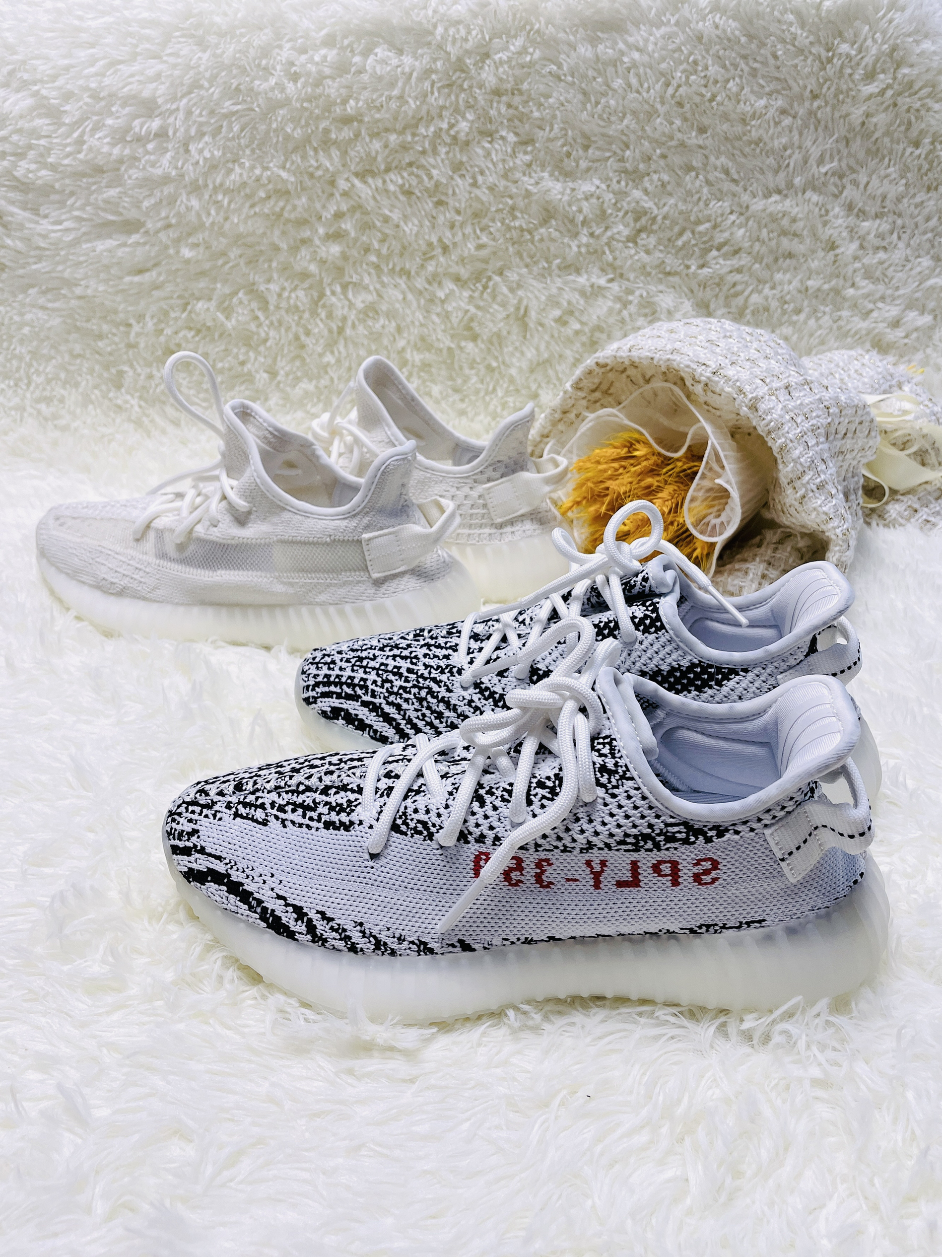 ✨Yeezy 350 白冰淇淋2.0/白斑马 ✨天气慢慢变热了 Yeezy必须要上脚了 跟大家分享一下这两双白色的椰子吧 -新出的白冰淇淋2.0和白斑马都是白色系 都非常的长在我的审美上 毕竟浅色系真的很舒服 尤其是小白鞋 ✨Yeezy椰子350 白冰淇淋2.0 -全鞋通体白色 运用的是经典侧透款式 可以看到内里 这就对袜子有点要求啦 最好也是浅色系 -中底为奶油的水晶大底 加上Boost科技...