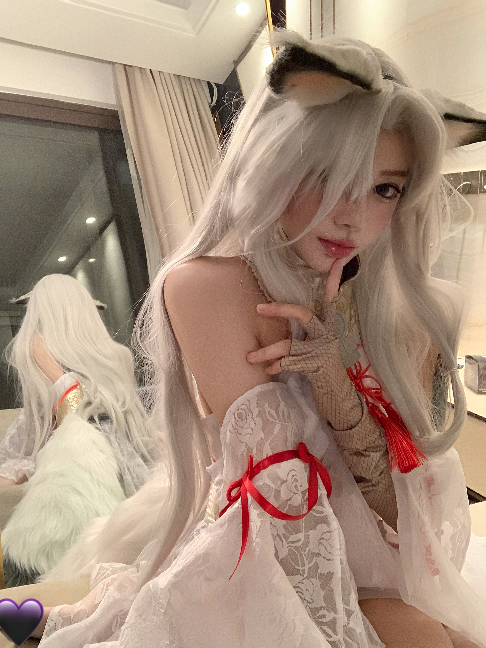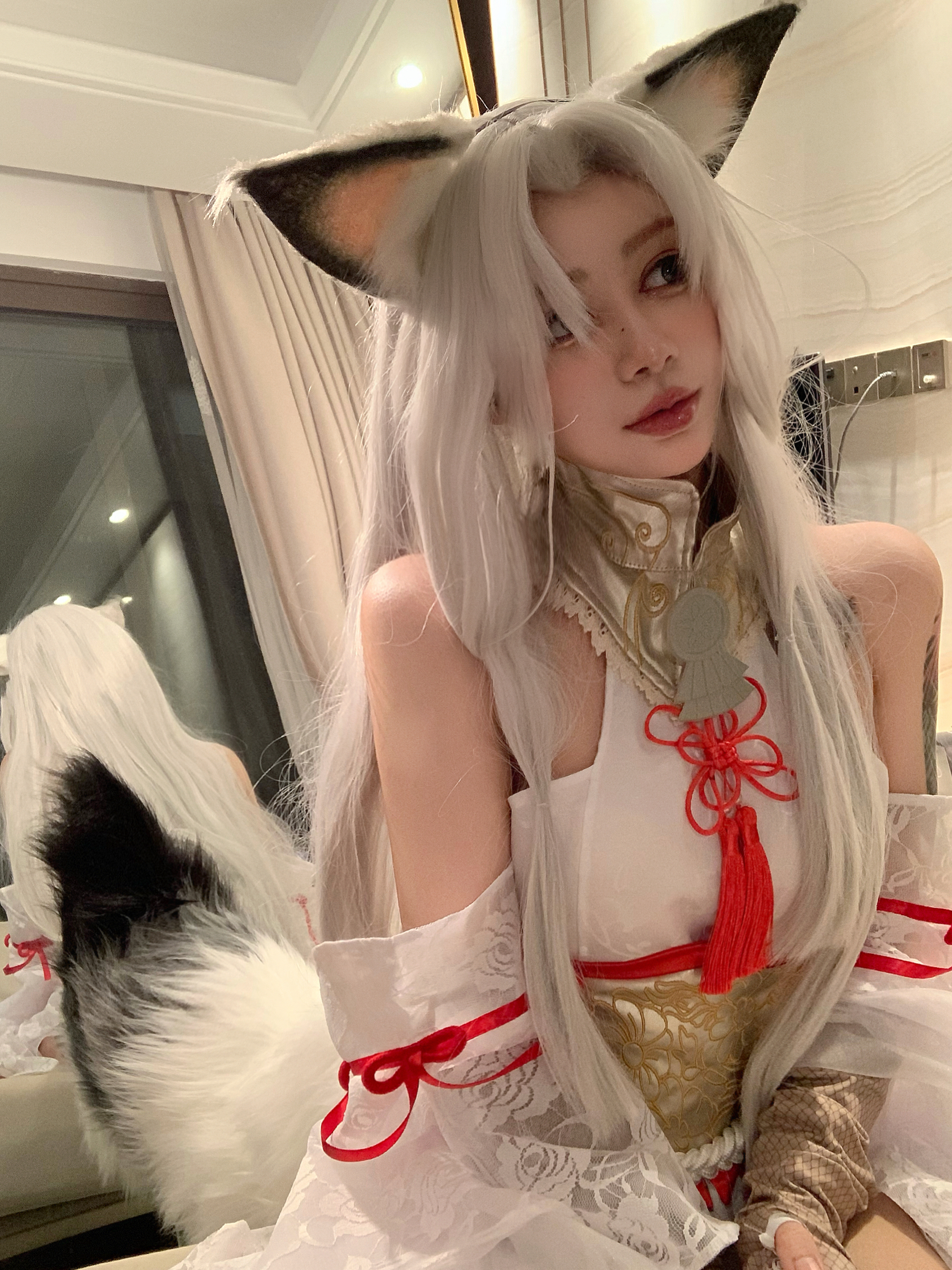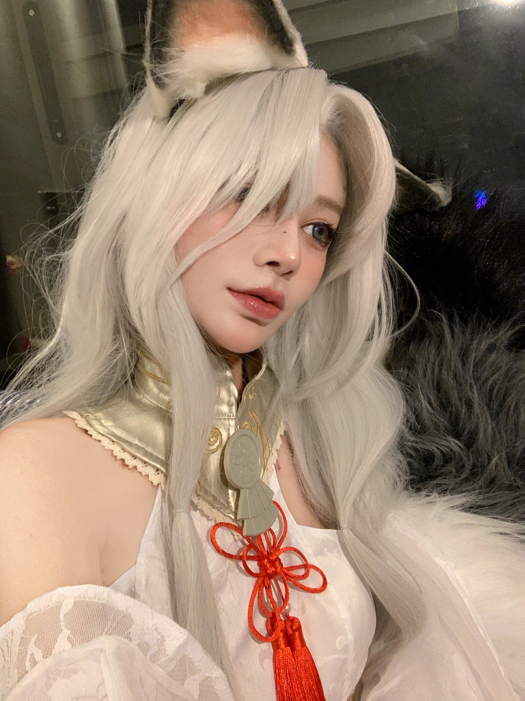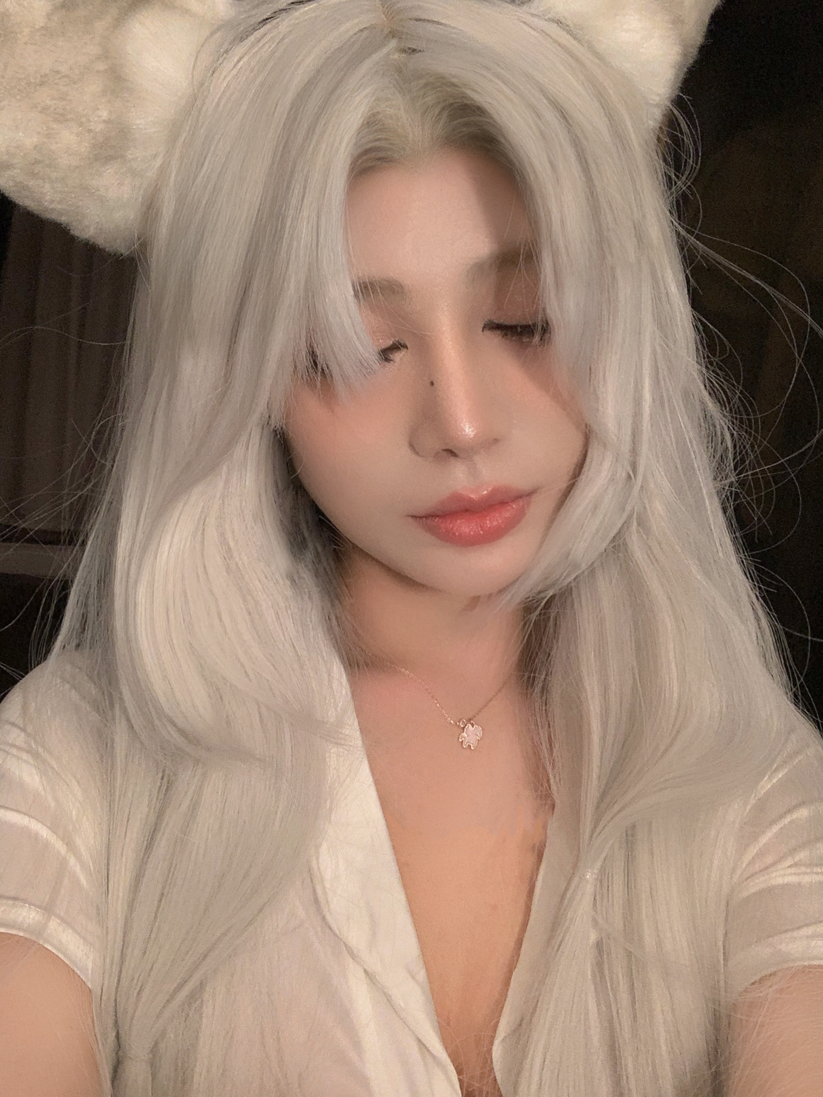 白发杀 但是这种假发会显得肤色有点黑 这个时候就要用到显白一些唇色 我用的番茄色🍅 真的经典又显白 二次元的时候涂这个颜色会很御 一点也不违和 三次元涂这个颜色就会很元气~