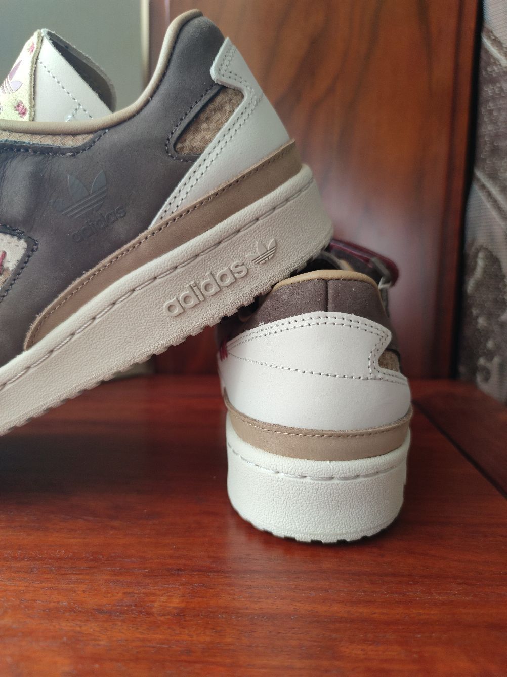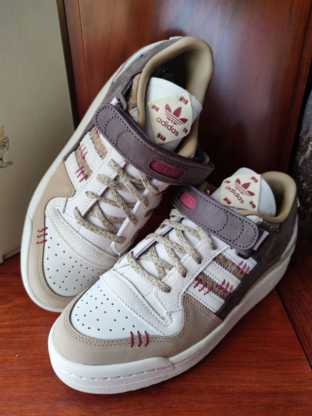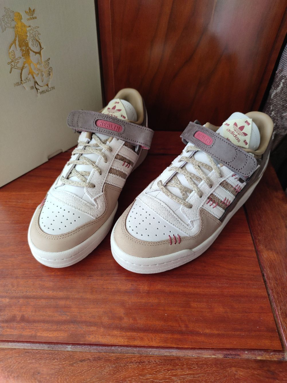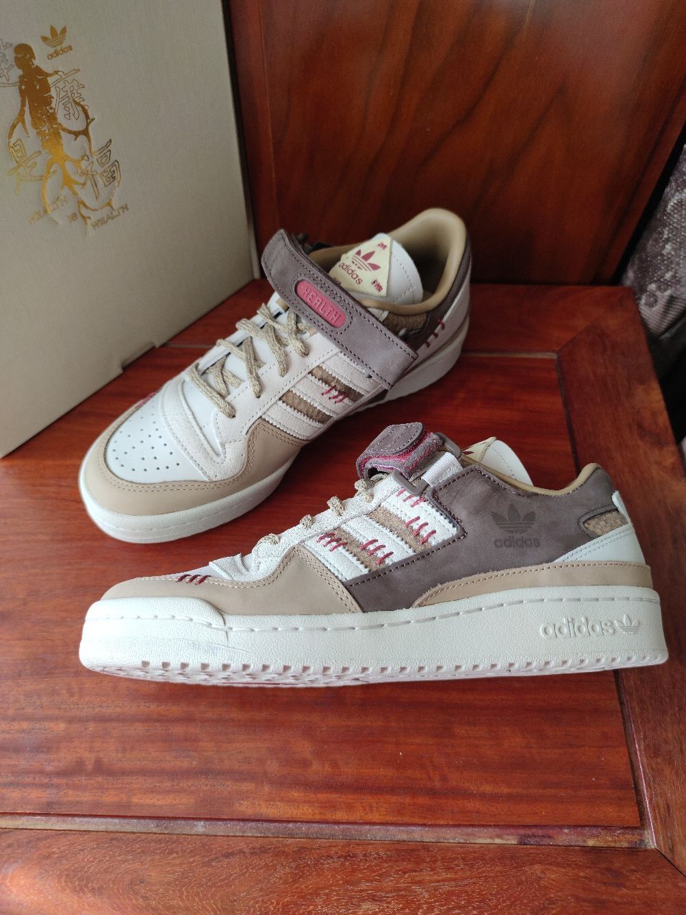 大家好,我是豆浆,本期分享一款中国元素满满的休闲球鞋,就是这款👉Adidas forum 84 健康是福 中国年,今天来分享一下首次上脚感受! 全鞋以深浅不一的棕色和白色构成,运用牛巴革和麂皮材质,鞋面质感不错,侧身经典的三条杠,forum 84标志性的魔术贴绑带,红色缝线、麻绳鞋带以及印有中草药图案的鞋垫,都呈现满满的中国元素。 但是此鞋唯一痛点在于皮革材质的鞋舌比较硬,上脚非常顶前脚踝,异物感...