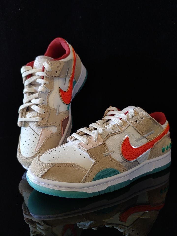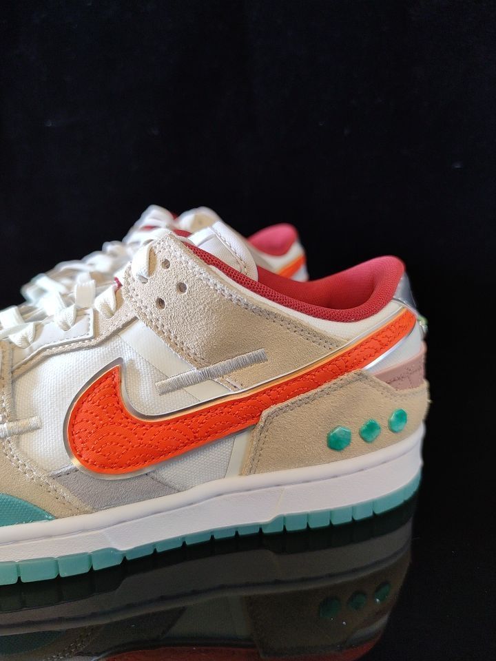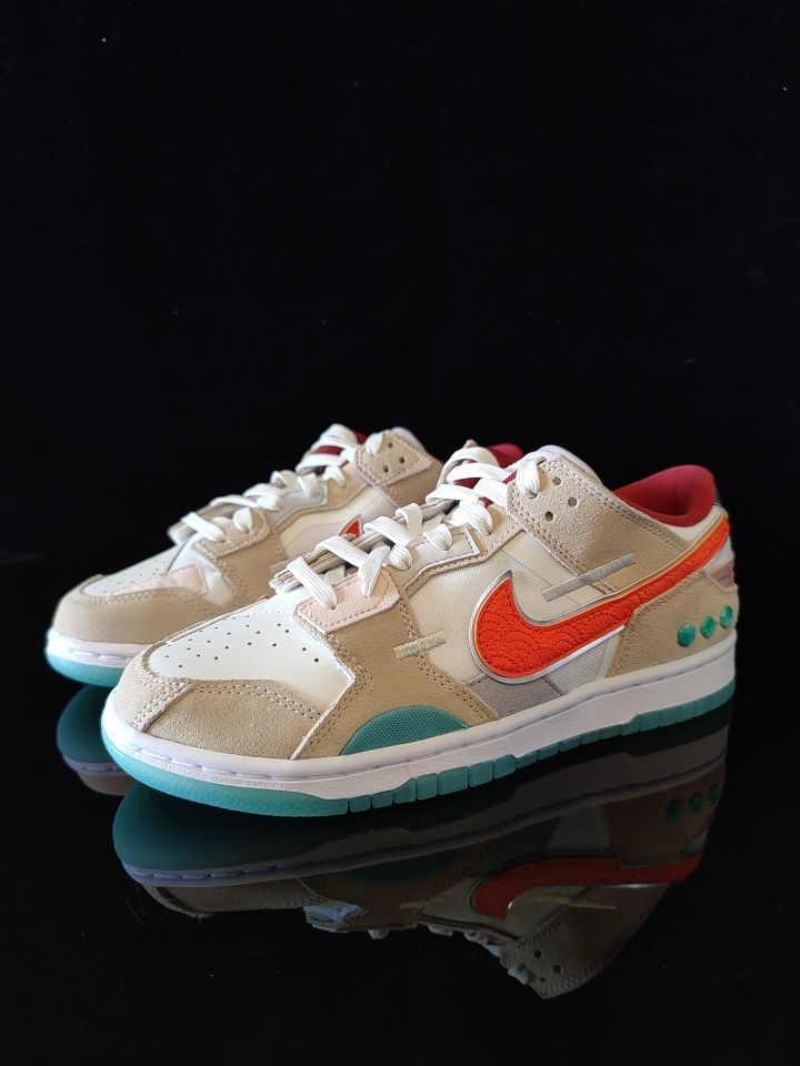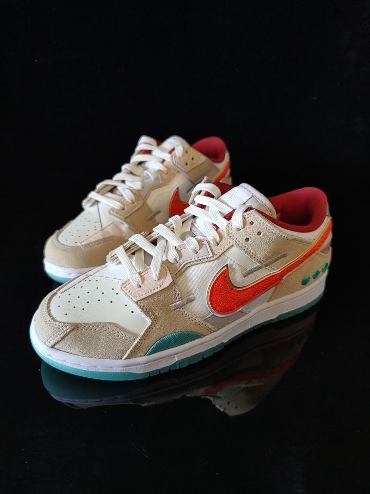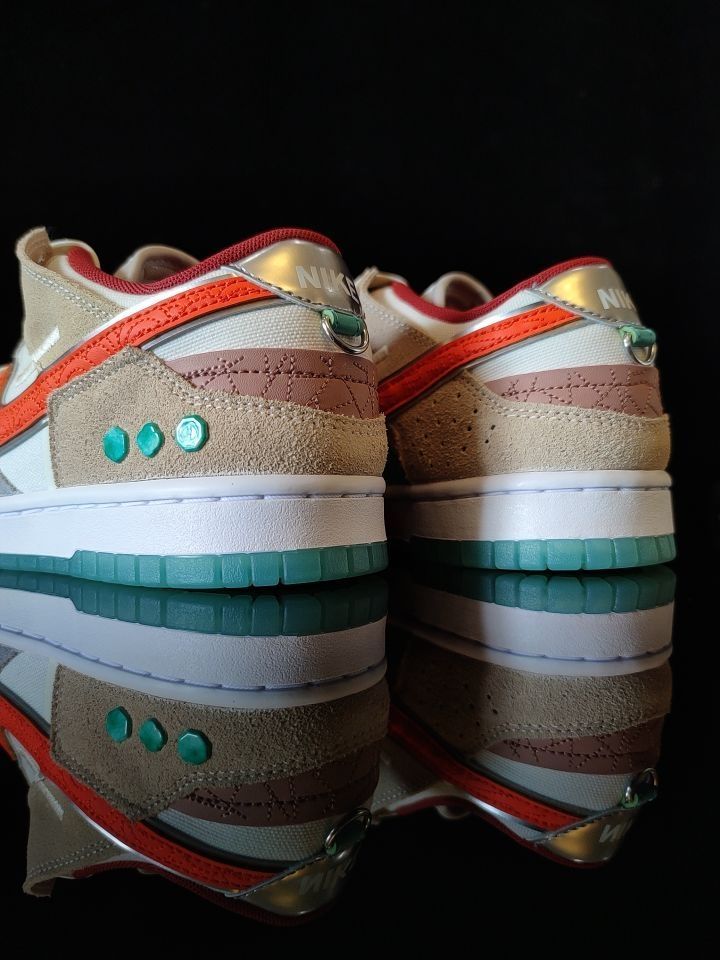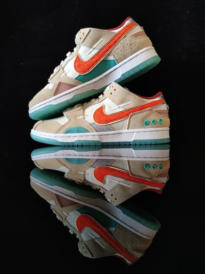 Nike Dunk Low Scrap 白橙蓝 中国玉 大家好,我是豆浆!本期推荐一款于前段时间发售的这款Dunk Low 中国玉! ✨以中国的玉石文化为主题进行创新设计,不得不说,在颜值和细节这一块儿拿捏了,非常符合我的审美!你知道鞋面运用了多少种材质吗?一起来数数吧! ✨此次依旧采用了这一系列惯用的设计理念,运用多材质多色系拼接缝合的形式呈现。白色的鞋面采用皮革与帆布拼接,脚趾和前后拉带...