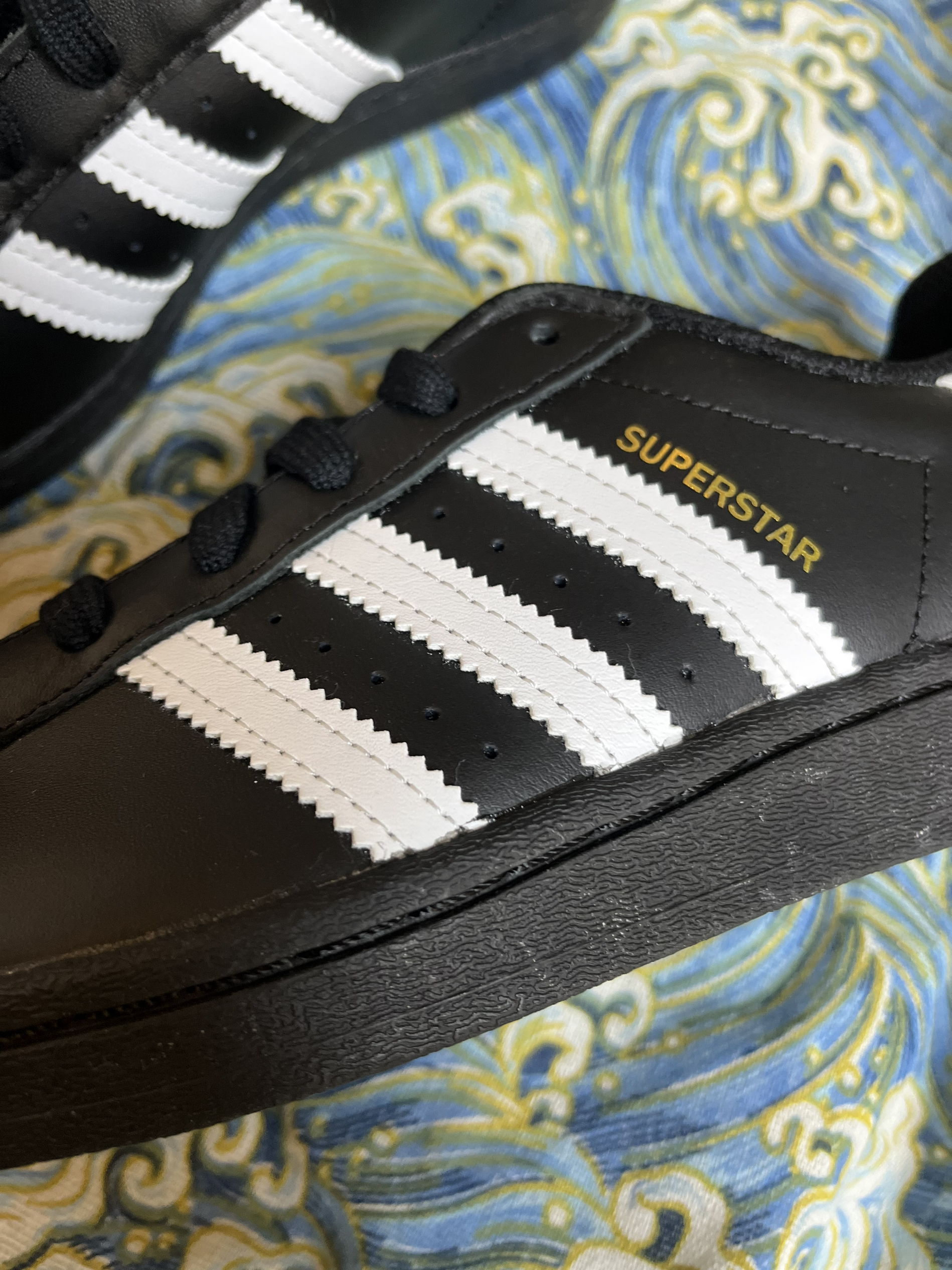 东毒西鞋今日分享 👟鞋名:adidas originals Superstar黑白男女同款 🧗♀️ 鞋面整体采用黑色为底色,白色和少许金色点缀,整体外观颜值很高。本以为不好搭衣服但是穿上脚却很好看。 🧗♀️ 鞋面皮革的材质,质感不错,鞋子也比较轻,脚感也很舒适。橡胶大底耐磨防滑。