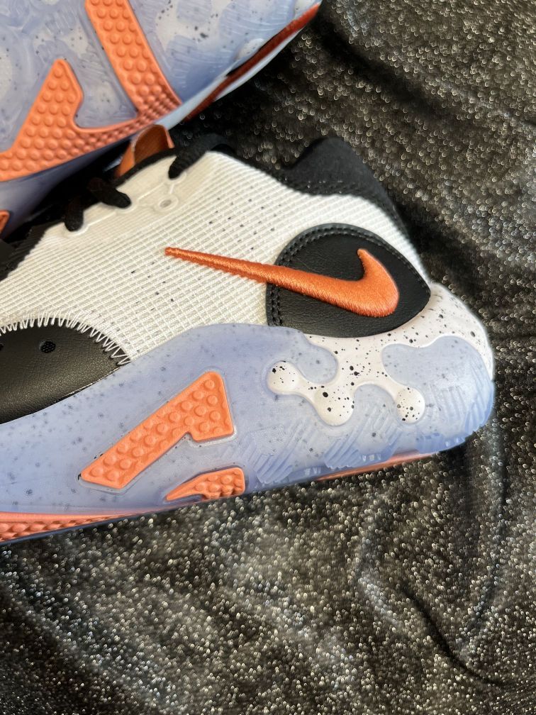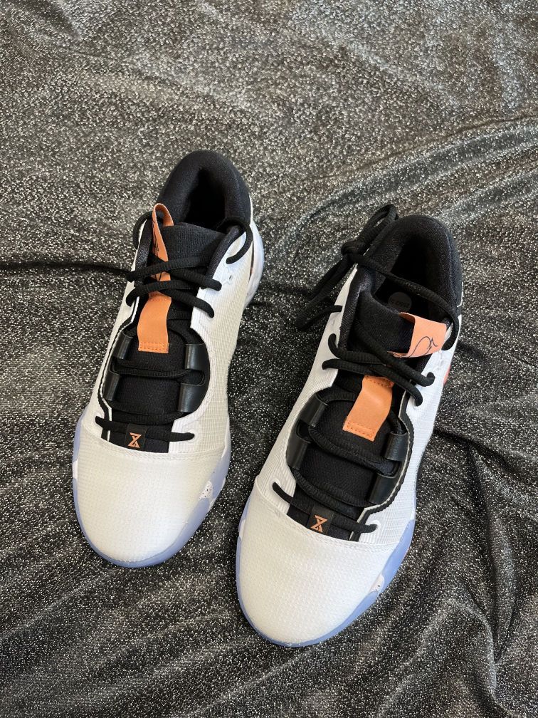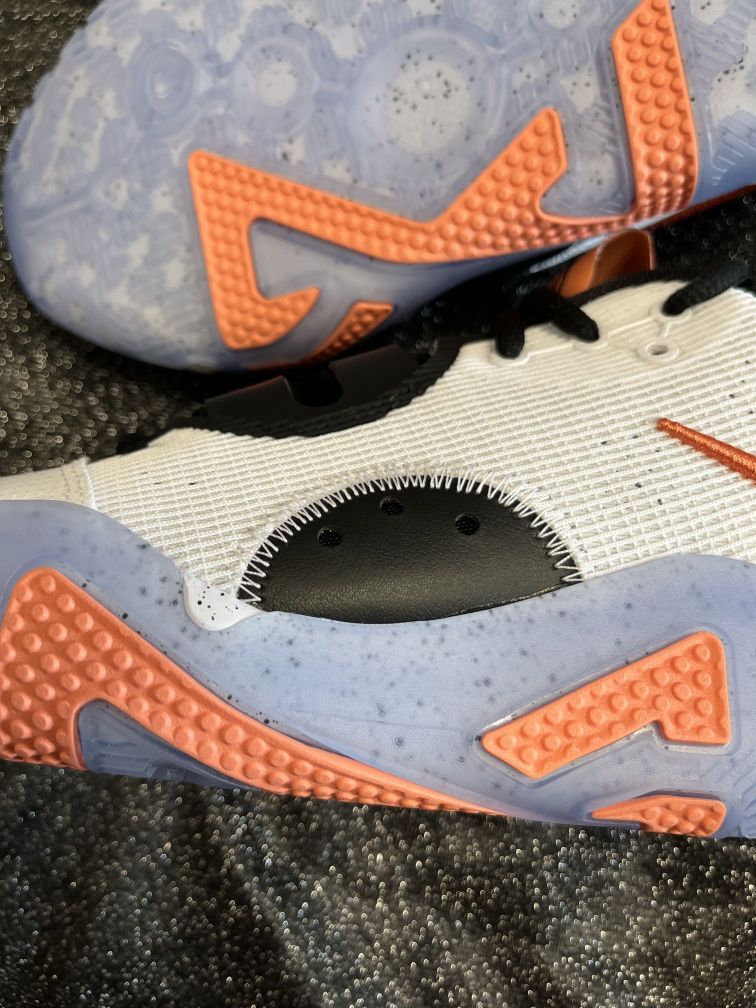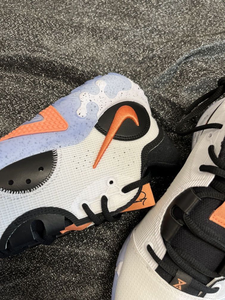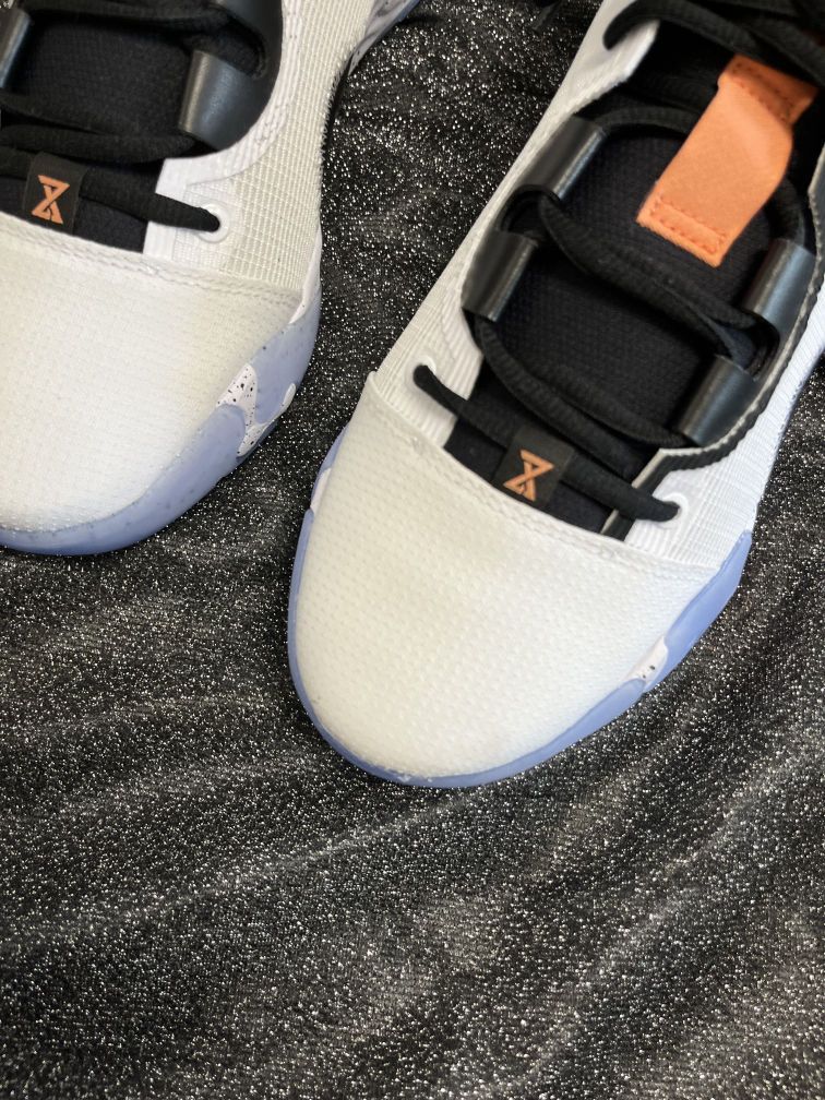 鞋名:NikePG6EP保罗乔治实战篮球鞋白黑男女同款国内版 MG潮玩家今天 给大家聊一聊这款鞋子 ——🥞 鞋面采用白色的颜色组成,浅蓝色红色点缀。侧面LOGO采用倒钩设计很特别。 ——🥞 织物合成革的鞋面材质,质感不错透气性不错。 ——🥞 采用全掌React泡棉的缓震材料,缓震回弹没问题。水晶大底也比较有特点,也是耐磨防滑的。
