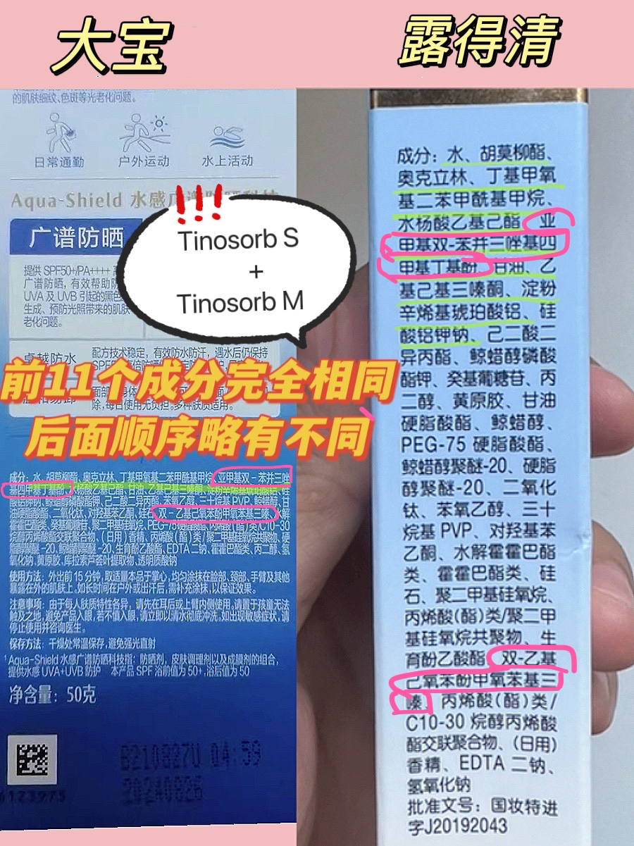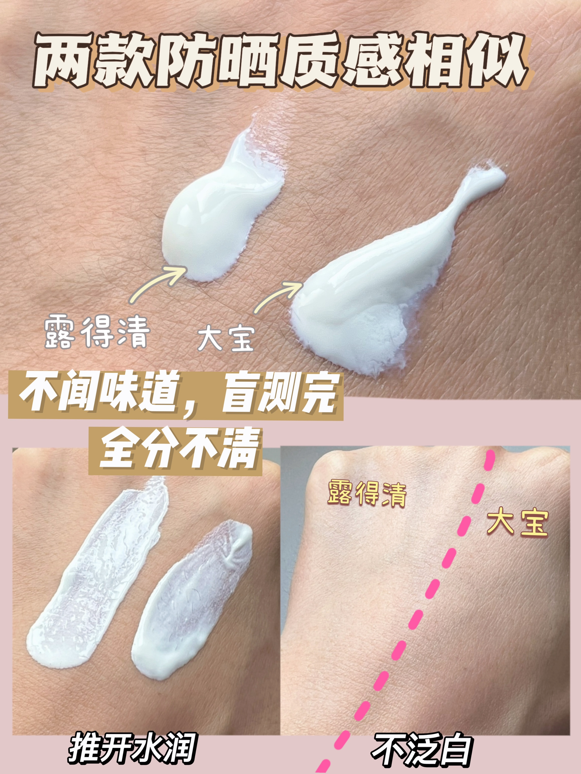 是的,大宝水感防晒堪称翻版 不闻香味盲测完全分不清…真的太像了,不愧都出自强生。 1⃣️配方相同 看成分表,防晒强度不相上下,都是8种防晒剂。且前11位次完全一样,后面的位次和个别成分有调整; ⚠️抗蓝光的防晒剂组合“Tinosorb S ➕Tinosorb M”,两款均使用,露得清能抗蓝光大宝也能。 2⃣️肤感无差别 两款都是清爽挂的,水润好推,不泛白,有防水力但不强,戴口罩不耐磨; 3...